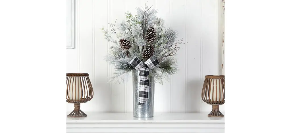 Inspired by the Christmas birch tree, this 28" Holiday Foliage Artificial Arrangement will make a statement. You can now instill the essence of the season with the delicate, soft hued, flocked leaves accented by pinecones. A black and white bow brings the look together. Standing 28" from a vase, house on any table in need of Christmas cheer, perfect for a tablespace, mantel or entry way. Your arrangement will look beautiful for years to come; simply wipe clean with a soft dry cloth when needed.
