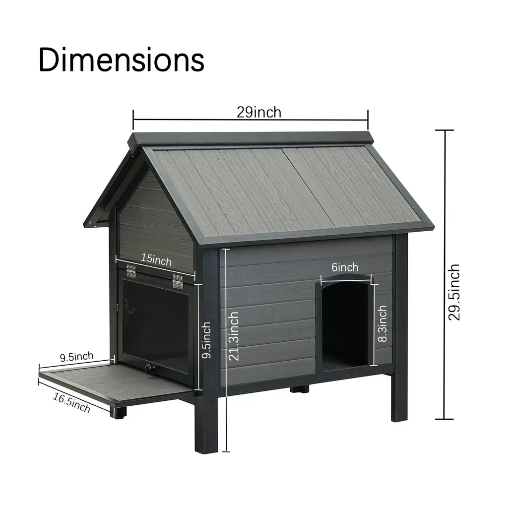 Sunny Porch: The porch offers a sunlit surface, fresh air, and a 2-in-1 design to provide roomy comfort. The attached patio upgrades this cat house.Slanted Roof: This cat enclosure allows water to roll off so it doesn't leak into the outdoor cat housing—a great combination of warmth in the winter and shade in the summer.Roomy & Safety: Cats won't become trapped as there is an emergency exit that leads ONLY OUT. Your cat has plenty of areas to stand and turn around but not enough space to get cold.Wooden Structure: This cat house's floor is 100% solid wood, not plywood or particleboard so that it won't delaminate with time. It has a raised bottom to protect it from the rain and mud.Cat House Info: Overall Dimensions: 38.5" L x 16.5" W x 29.5" H.