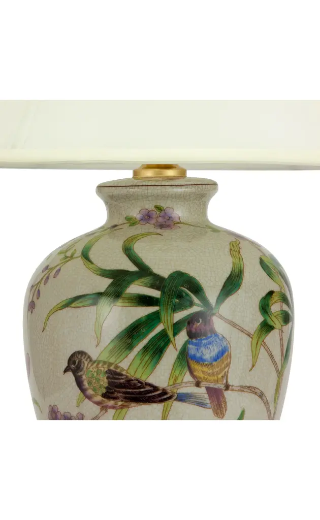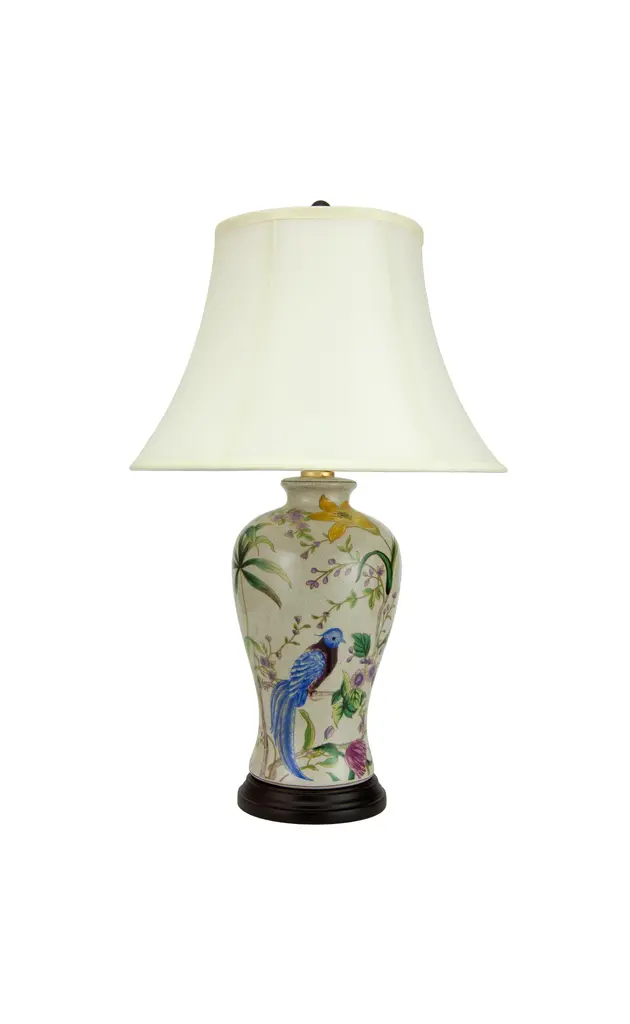 This colorful lamp features a beautiful design perfect for anyone who loves tropical scenery or eclectic decor styles. The body of the lamp is coated in a medium gloss glaze and depicts brightly-hued songbirds nestling in breezy palm branches among exotic flowers. This lamp will bring a balmy tropical accent to any room of the house all year round.Porcelain Body - Crafted from high-quality, high-temperature vitreous porcelain, our lamps boast exceptional durability and elegance. Each piece undergoes a meticulous firing process, resulting in a smooth and lustrous finish that accentuates the natural beauty of the porcelain.Fabric Shade - Our lamps feature luxuriously soft fabric shades, meticulously selected for their exquisite texture and durability. Each shade boasts a sumptuous sheen and delicate feel, with a soft texture and subtle weave that casts a warm and inviting glow in any room.UL Approved - Rest assured knowing that the wiring and sockets meet stringent UL standards, guaranteeing not only safety but also flawless compatibility with American-made light bulbs.3-Way 100 Watt Compatibility - Specifically engineered to accommodate 100W medium type A compact fluorescent bulbs, a standard that provides versatility in lighting options to suit various preferences and atmospheres.