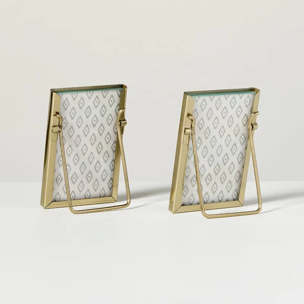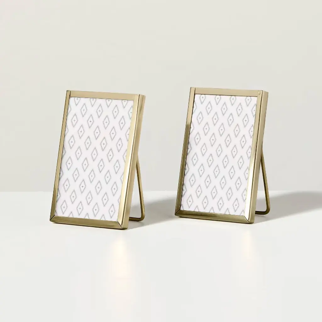 Display your cherished memories with this 2-Count Mini Frame Set from Hearth & Hand™ with Magnolia. These rectangular frames feature a metal frame accentuated by an antique brass finish that adds a touch of luxury. The glass window provides excellent visibility, while the easel back allows you to place the frames on your desk, shelf or tabletop effortlessly without hardware. Hearth & Hand™ with Magnolia: Gather ∙ Create ∙ Enjoy