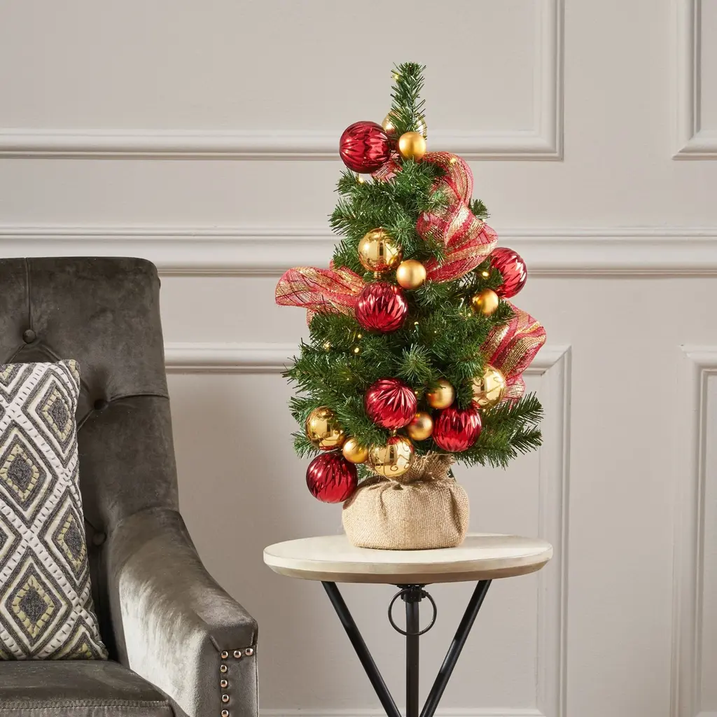 Transform your holiday space with this delightful 2-foot red and gold burlap tree, adorned with 50 warm white LED lights. Perfect for tabletops or small areas, this charming Christmas decoration adds a festive touch to any room. Crafted from high-quality PVC, this tree requires no assembly; simply unpack, fluff the branches, and insert batteries to illuminate your space. The eco-friendly LED lights not only enhance your decor but also save electricity, making this tree a smart choice for holiday celebrations.FeaturesSpecifications
