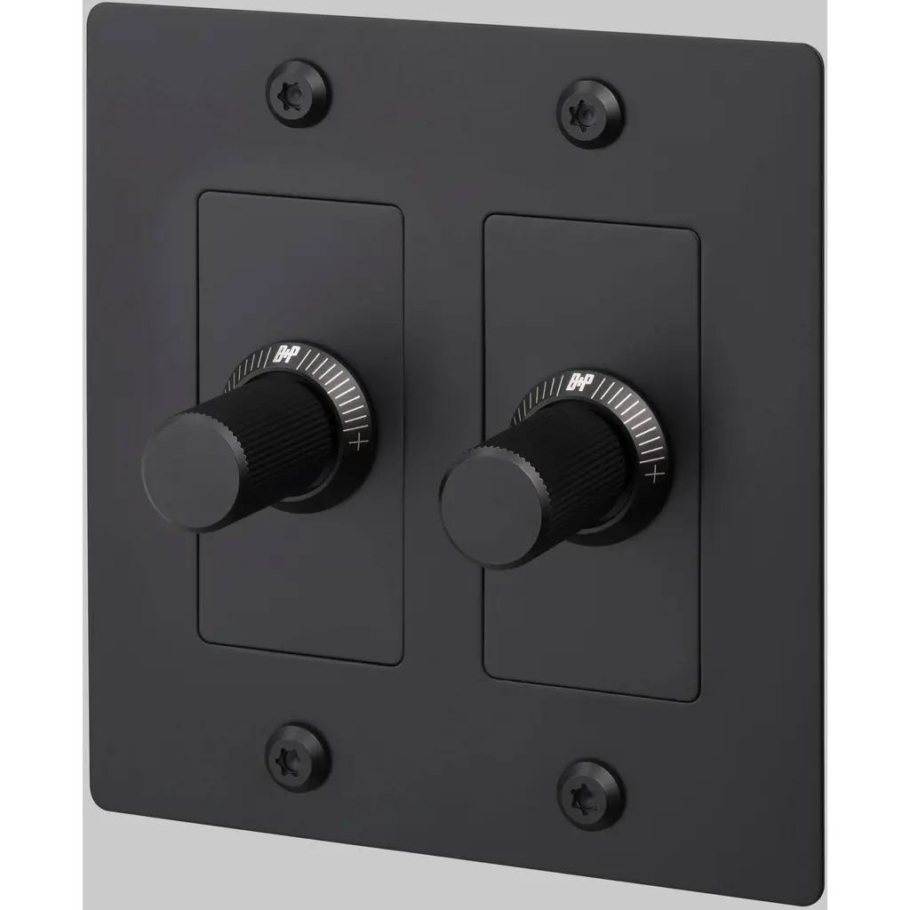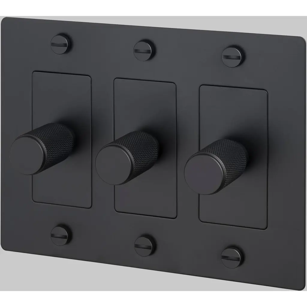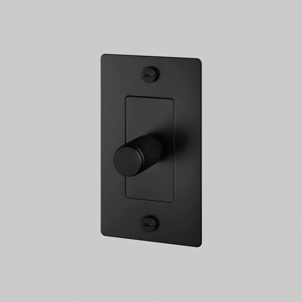 A dimmer switch finished in black. The dimmer knob features our signature, diamond-cut, cross knurl pattern and is made from solid black metal.FYI: This piece has a 4 mm shadow gap when installed.