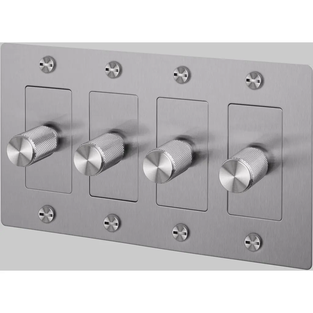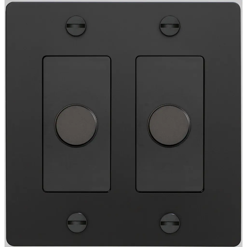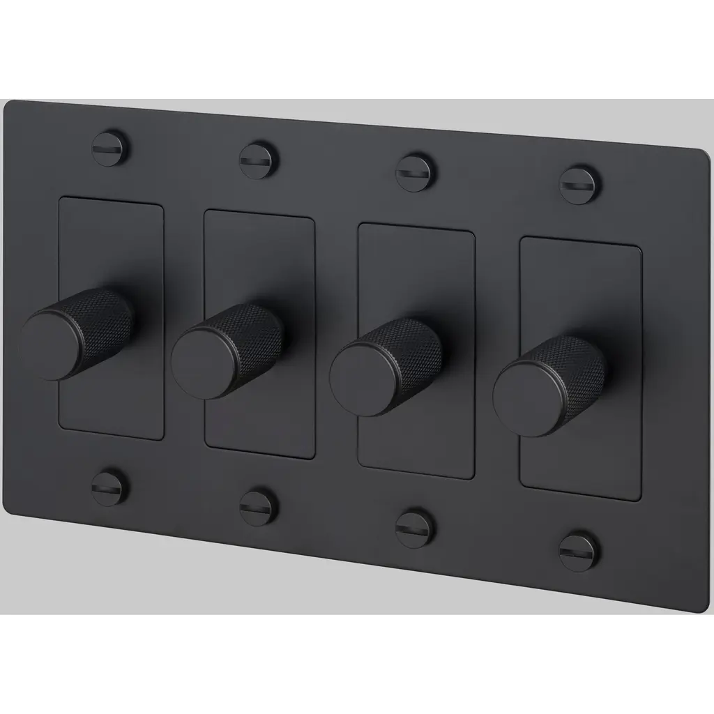 A dimmer switch finished in black. The dimmer knob features our signature, diamond-cut, cross knurl pattern and is made from solid black metal.FYI: This piece has a 4 mm shadow gap when installed.