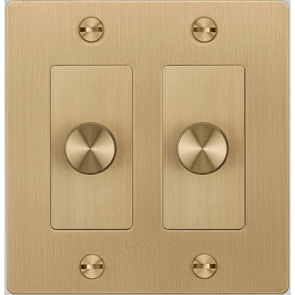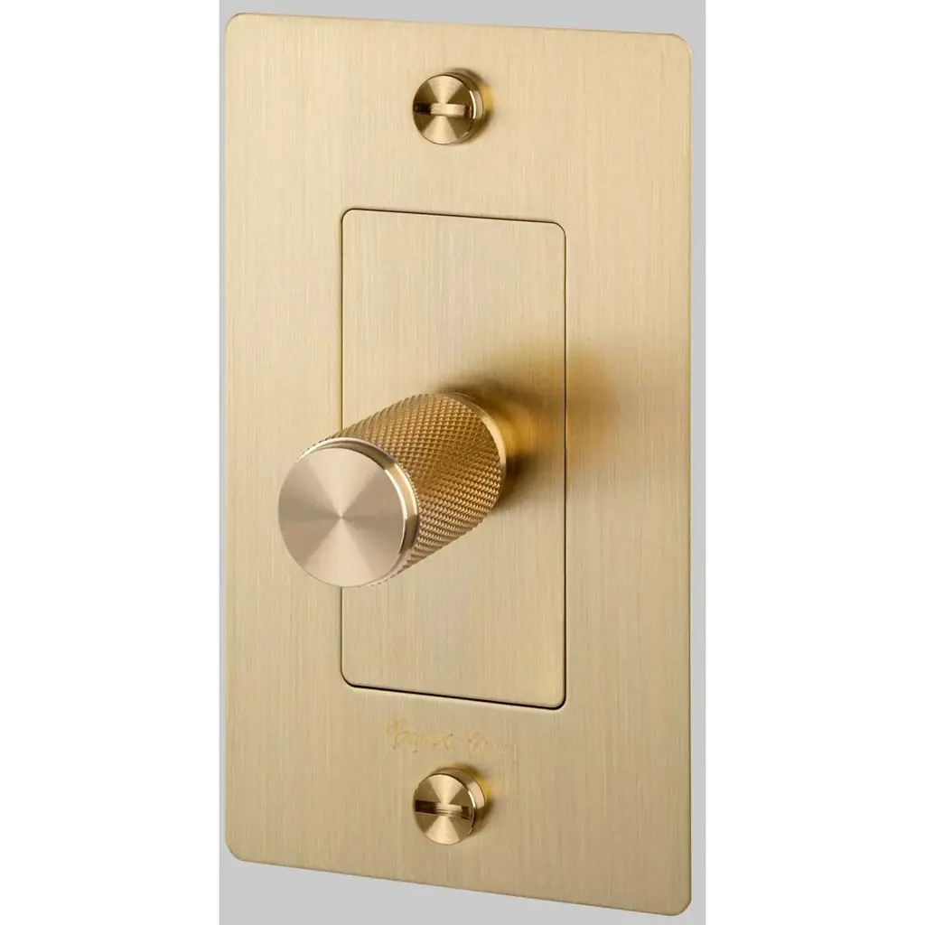 A dimmer switch finished in brass. The dimmer knob features our signature, diamond-cut, cross knurl pattern and is made from solid brass metal.FYI: This piece has a 4 mm shadow gap when installed.