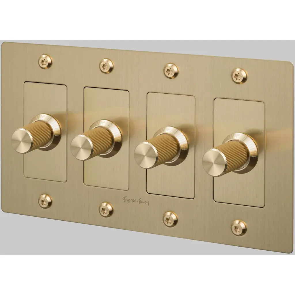 A dimmer switch finished in Steel. The dimmer knob features our signature, diamond-cut, cross knurl pattern and is made from solid steel.FYI: This piece has a 4 mm shadow gap when installed.