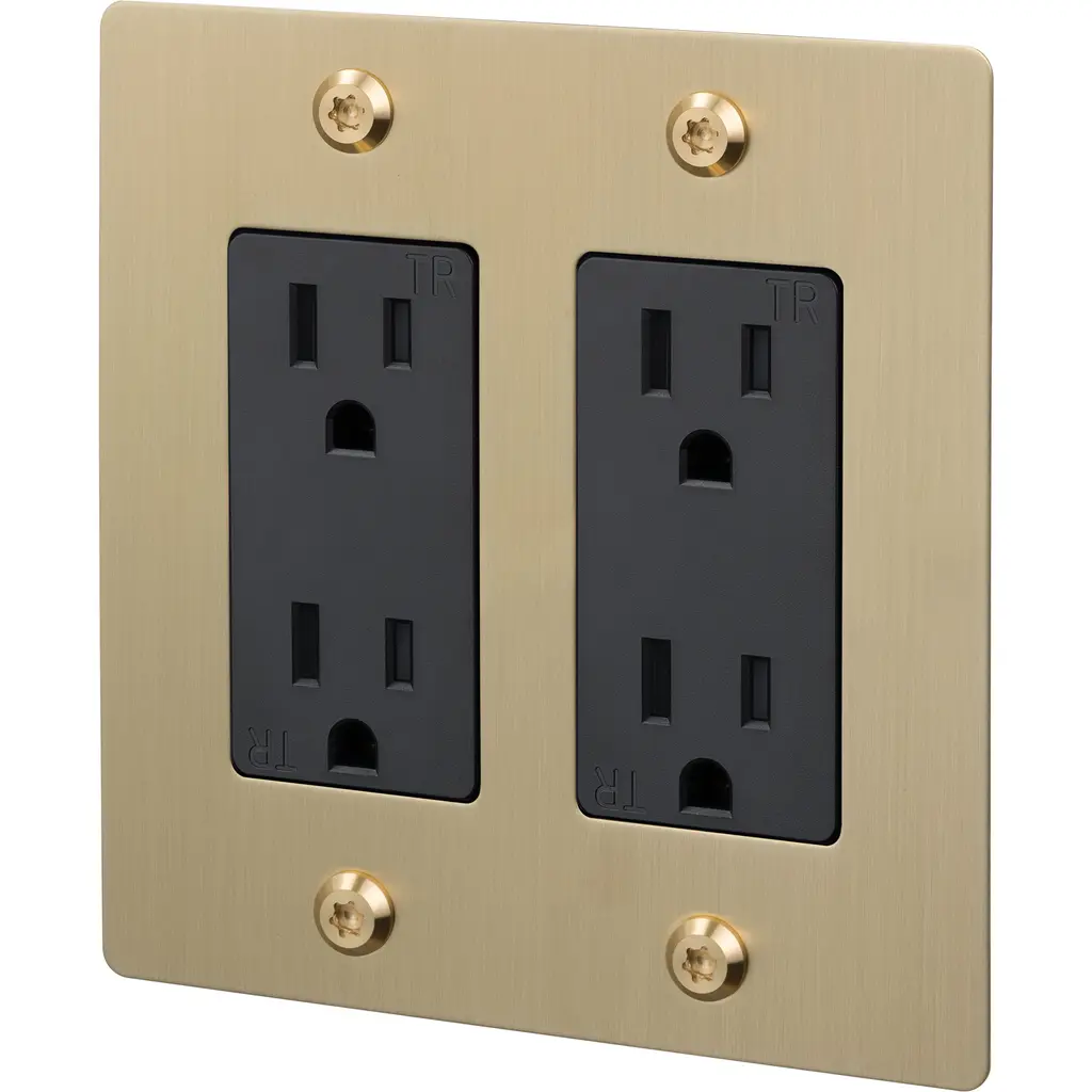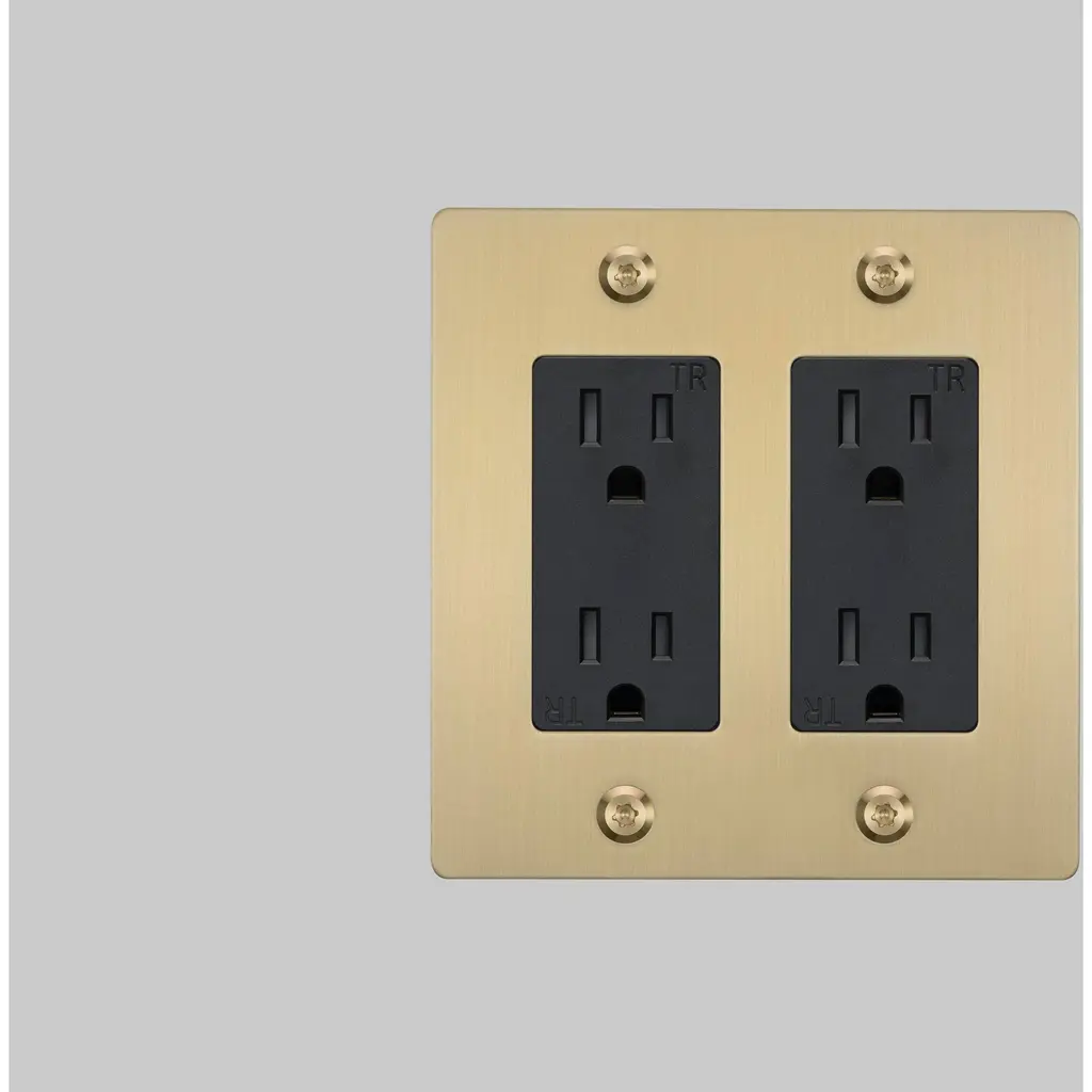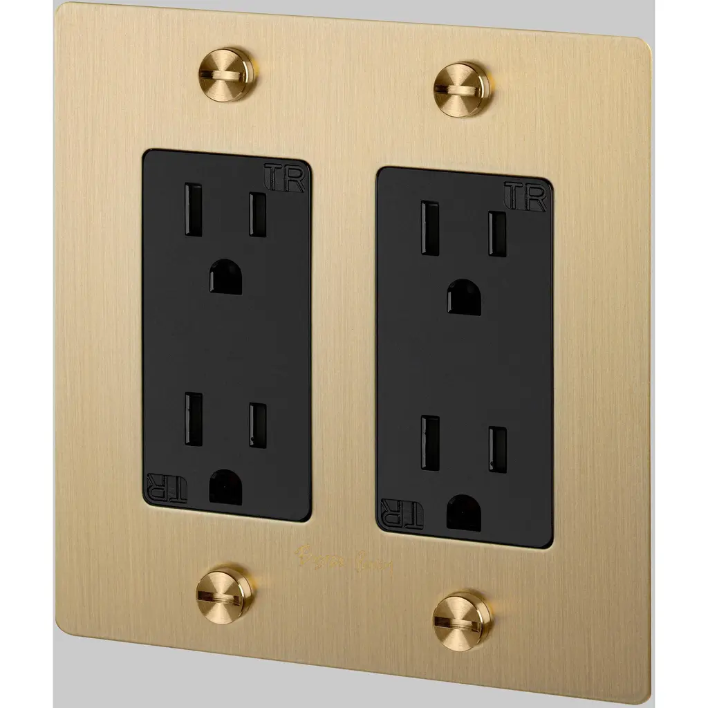 A duplex outlet finished in brass and featuring our solid brass coin screws.