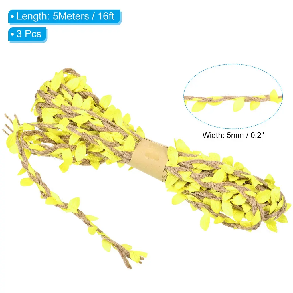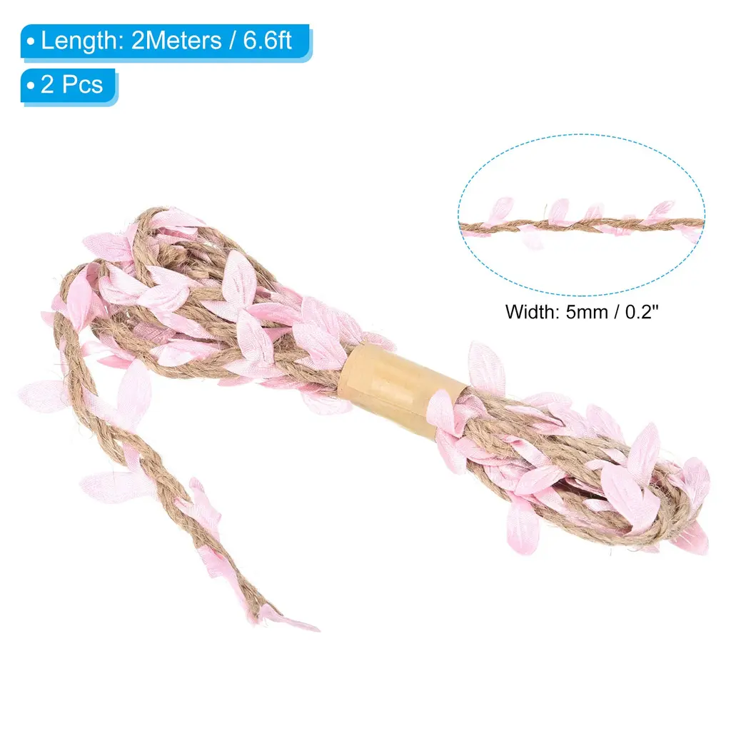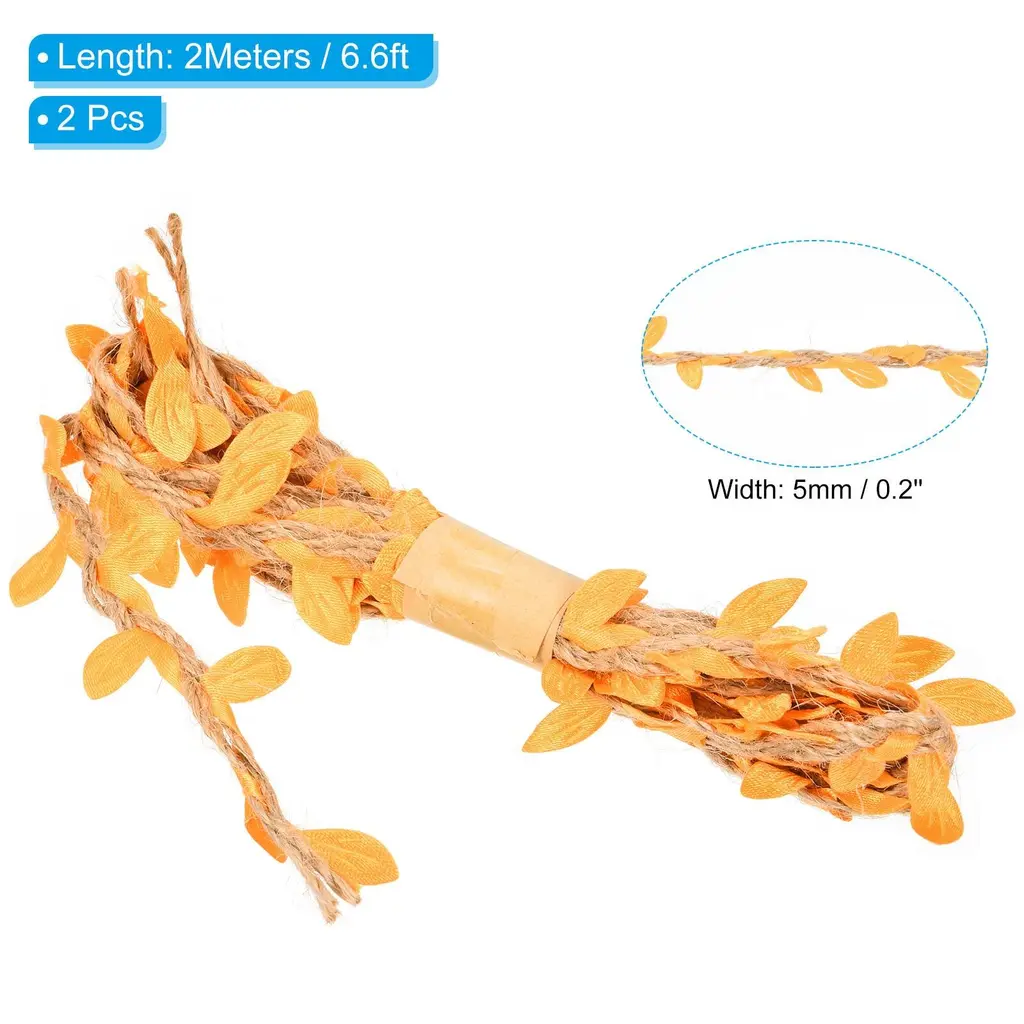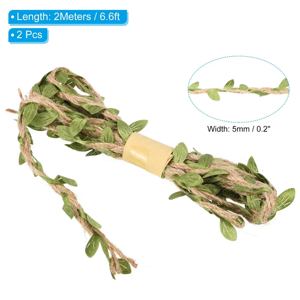 Natural jute twine has various applications, great for home, garden, wedding, jungle theme party and other occasions decorations to add a touch of nature. It also can be used for DIY project, gift wrapping, photo wall, photo album decor, glass jar hanging wrapping decor, garland making, etc.Specification Material: Jute, FabricLength: 2 M / 6.6 ftWidth: 5 mm / 0.2 inchPacking List: 2Pcs x Leaf Ribbon Burlap TwineAdvantageBurlap leaf ribbon is a natural-looking artificial vine made of jute rope with fabric leaves. The jute twine is soft, not easy to fade, durable and can be used repeatedly. The leaves on the ribbon are carefully crafted to mimic real leaves to create a natural environment.InstructionThe leaf string can be used in place of the cord to wrap and fix gifts or bouquets, the length can be cut as needed.NOTE: Due to the difference in natural light and display resolution, the item color displayed in photos may be showing slightly different from the real object.