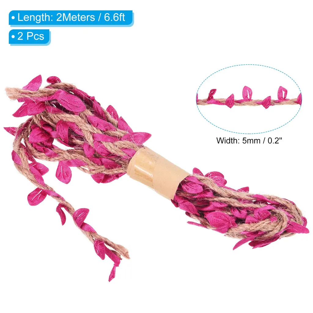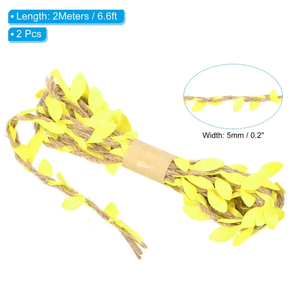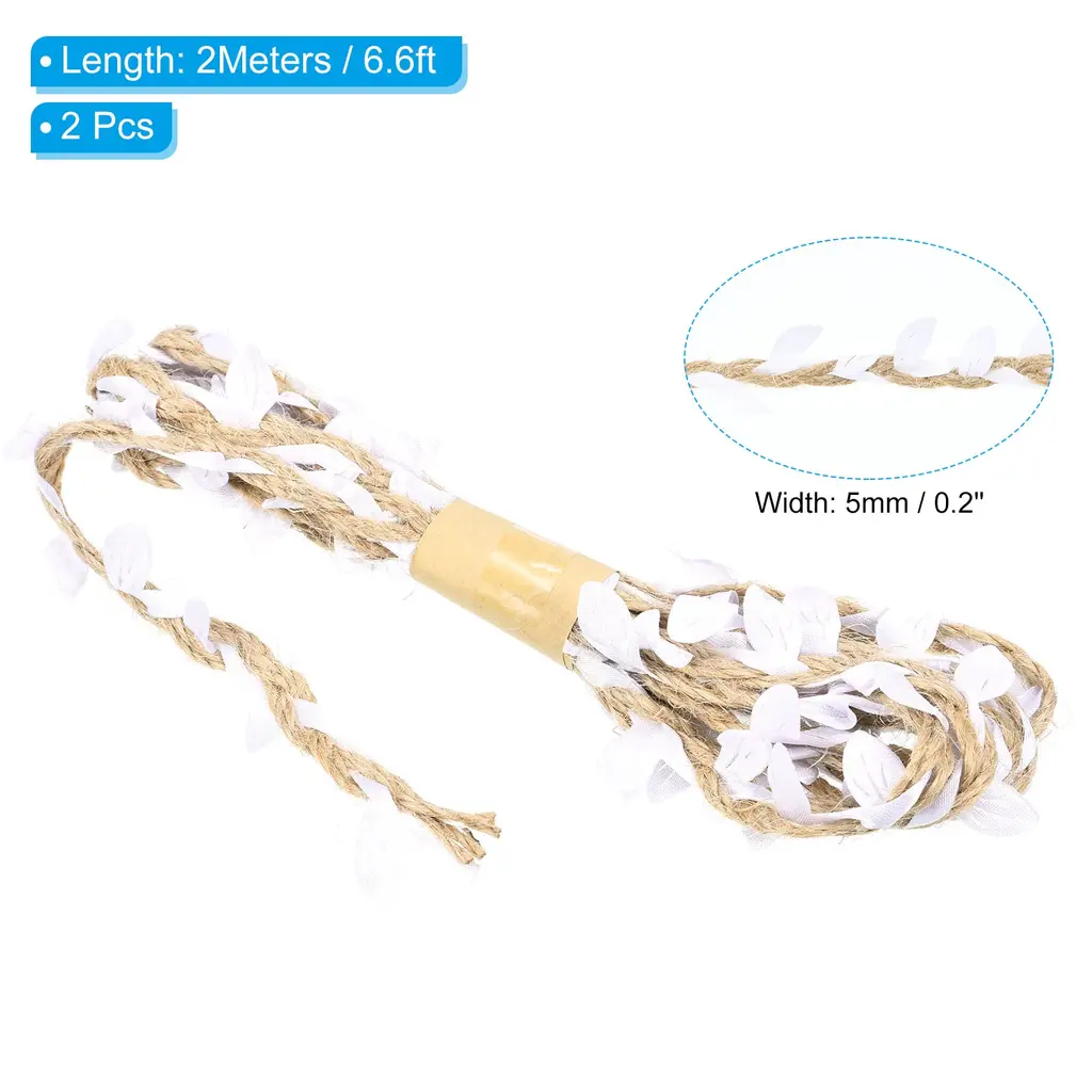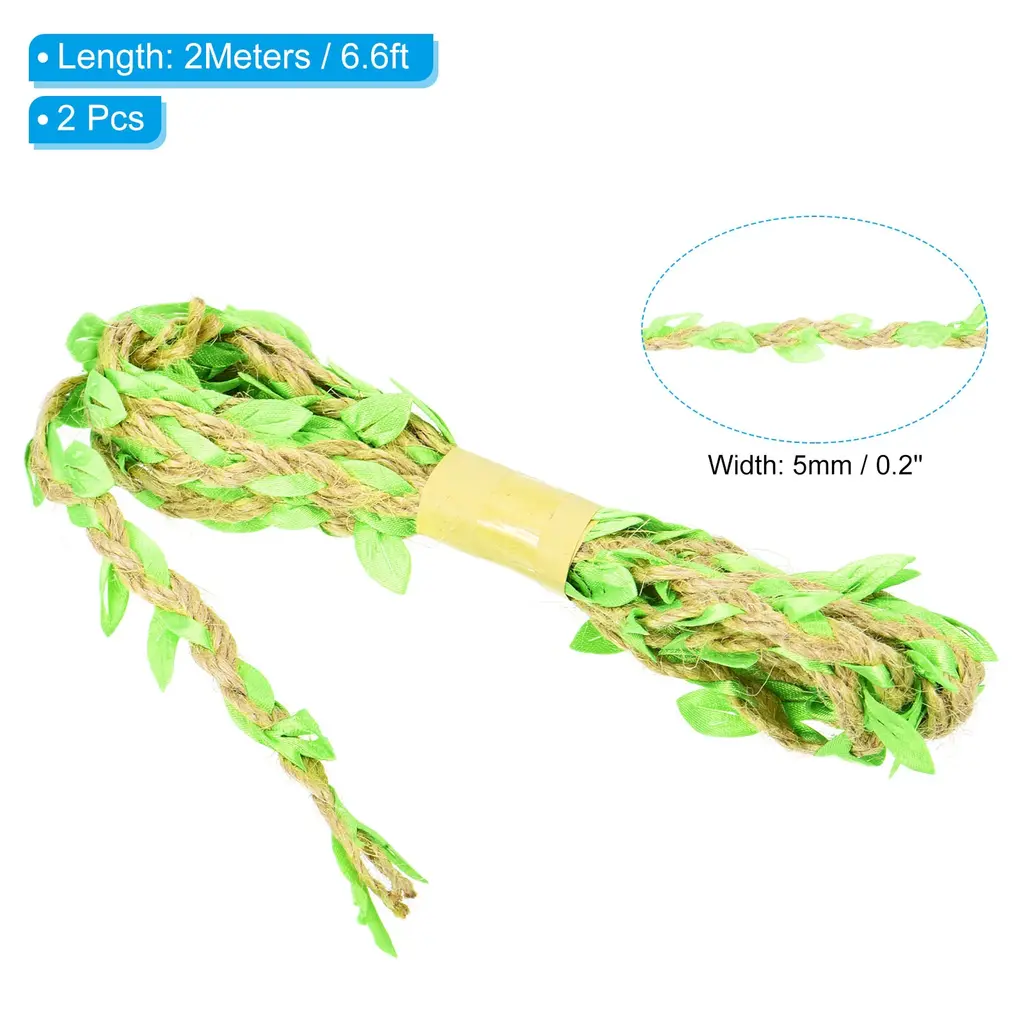 Natural jute twine has various applications, great for home, garden, wedding, jungle theme party and other occasions decorations to add a touch of nature. It also can be used for DIY project, gift wrapping, photo wall, photo album decor, glass jar hanging wrapping decor, garland making, etc.Specification Material: Jute, FabricLength: 2 M / 6.6 ftWidth: 5 mm / 0.2 inchPacking List: 2Pcs x Leaf Ribbon Burlap TwineAdvantageBurlap leaf ribbon is a natural-looking artificial vine made of jute rope with fabric leaves. The jute twine is soft, not easy to fade, durable and can be used repeatedly. The leaves on the ribbon are carefully crafted to mimic real leaves to create a natural environment.InstructionThe leaf string can be used in place of the cord to wrap and fix gifts or bouquets, the length can be cut as needed.NOTE: Due to the difference in natural light and display resolution, the item color displayed in photos may be showing slightly different from the real object.