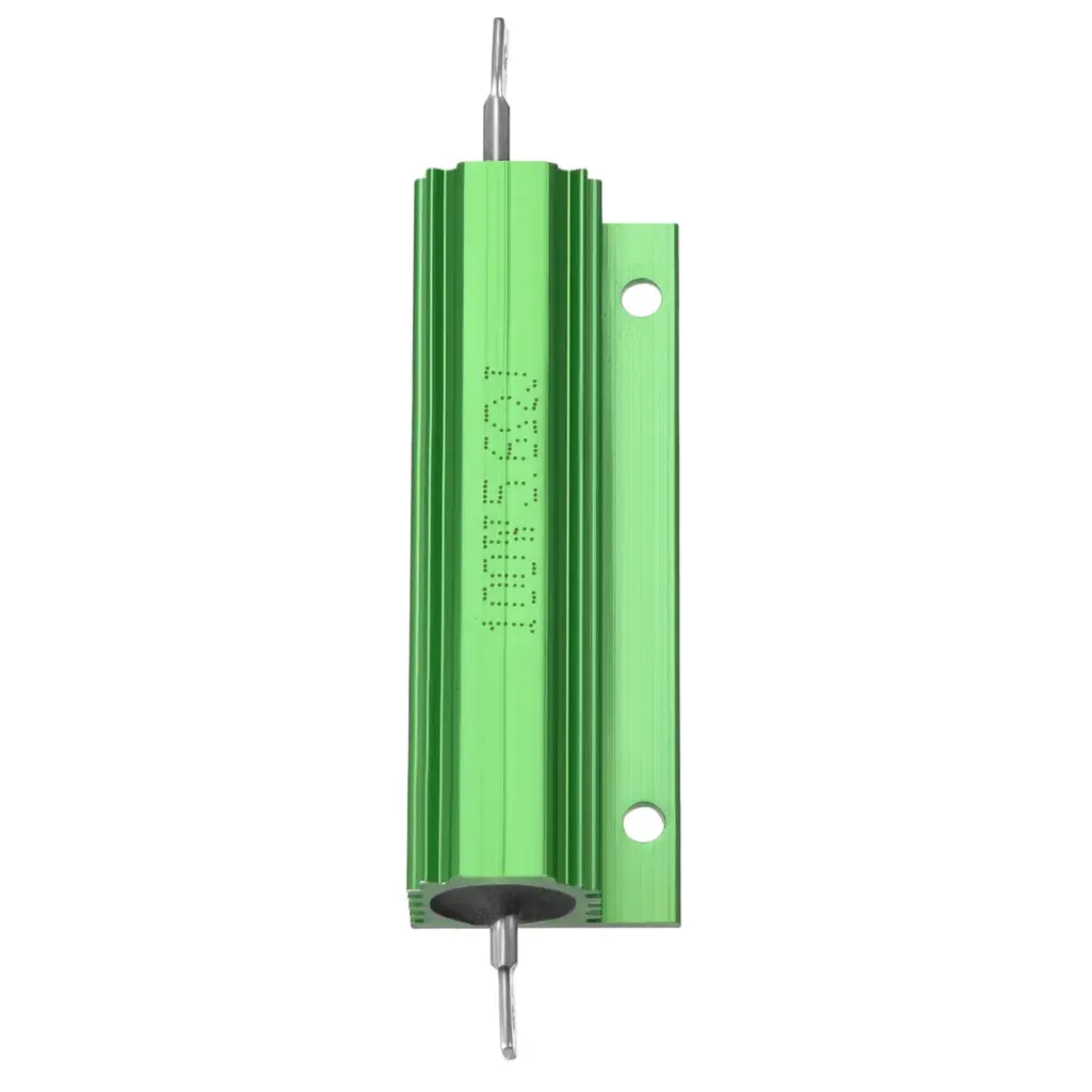 100 Wattage and 5.6 Ohm, 5% tolerance. Wire Wound Resistor owns high stability and accuracy. Moreover, it was used for various application because of the wide resistance range.Aluminum Housed. An insulated cover on the wounded wires would block out the heat, which promises the high performance of a resistor. Hence, the cooling job was achieved by aluminum case.This 100W resistor formed with qualified copper, nickel, and aluminum. With the compact structure and heat dissipation design, a capability of overload has been built.Board length 2.32 inches(59mm) and two rods with 2mm hole for a soldering connection. Dia. 3mm antisymmetric anchoring hole for holding, which will fit #2 Screws(or M2.3 nuts)Reliable. Problems like the flush LED would have a perfect solution, or you can use it in any AC DC circuits, converter, inverter, motor speed control, drivers, etc.100 Wattage and 5.6 Ohm, 5% tolerance. Wire Wound Resistor owns high stability and accuracy. Moreover, it was used for various application because of the wide resistance range.Aluminum Housed. An insulated cover on the wounded wires would block out the heat, which promises the high performance of a resistor. Hence, the cooling job was achieved by aluminum case.This 100W resistor formed with qualified copper, nickel, and aluminum. With the compact structure and heat dissipation design, a capability of overload has been built.Board length 2.32 inches(59mm) and two rods with 2mm hole for a soldering connection. Dia. 3mm antisymmetric anchoring hole for holding, which will fit #2 Screws(or M2.3 nuts)Reliable. Problems like the flush LED would have a perfect solution, or you can use it in any AC DC circuits, converter, inverter, motor speed control, drivers, etc.Specification:Main Body Length: 59 mm/ 2.32 inchesPower: 100 WattageRated Resistance: 5.6 RTolerances: 5%(J)Connection Type: Rod terminals with holeRod Length: 12mm/0.47 inchesScrew Hole: 3mm(Fit #2 or M2.3 nuts)Distance between screw hole: 45mmWeight: 60g/2.12 OzMaterials: Nickel alloys Wire Wound Resistor with Aluminum CaseColor: GreenPackage Content:2 x 100W 5.6R Aluminum Housed Resistor
