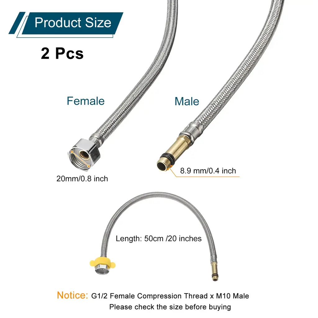 Description:Materials: The shower nozzle hose has three layers of material (Inner Layer Of EPDM material, 304 Stainless Steel Braided Layer, and Outer Layer Of Hybrid Braiding), which is flexible, kink-resistant, heat-resistant, durable, strong and wear-resistant.Leakproof Design: G1/2 inch universal nut with a rubber gasket inside, which improves the sealing performance to a certain extent and effectively prevents leakageEasy to Install: The connector with female compression threads facilitates easy attachment to most faucets. It also comes with a male connector and wrench. It is easy to install in minutes by hand, enabling effortless connection to various faucets and fixtures for added convenience and versatility.Application: The braided supply line can supply hot and cold water for the bathroom, toilet, washbasin, water heater, base faucet, and any place where water supply is needed, both in summer and winter.Specification:Female Compression Thread Inner Diameter: 20mm/0.8 inchMale Connector Length: 8.9 mm/0.4 inchLength: 40 cm /16 inchesPackage Content: 2 x Faucet Supply Lines