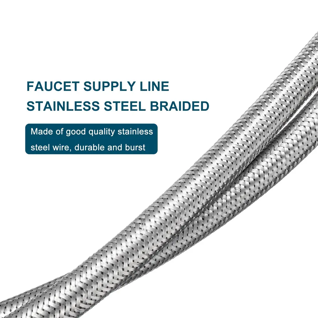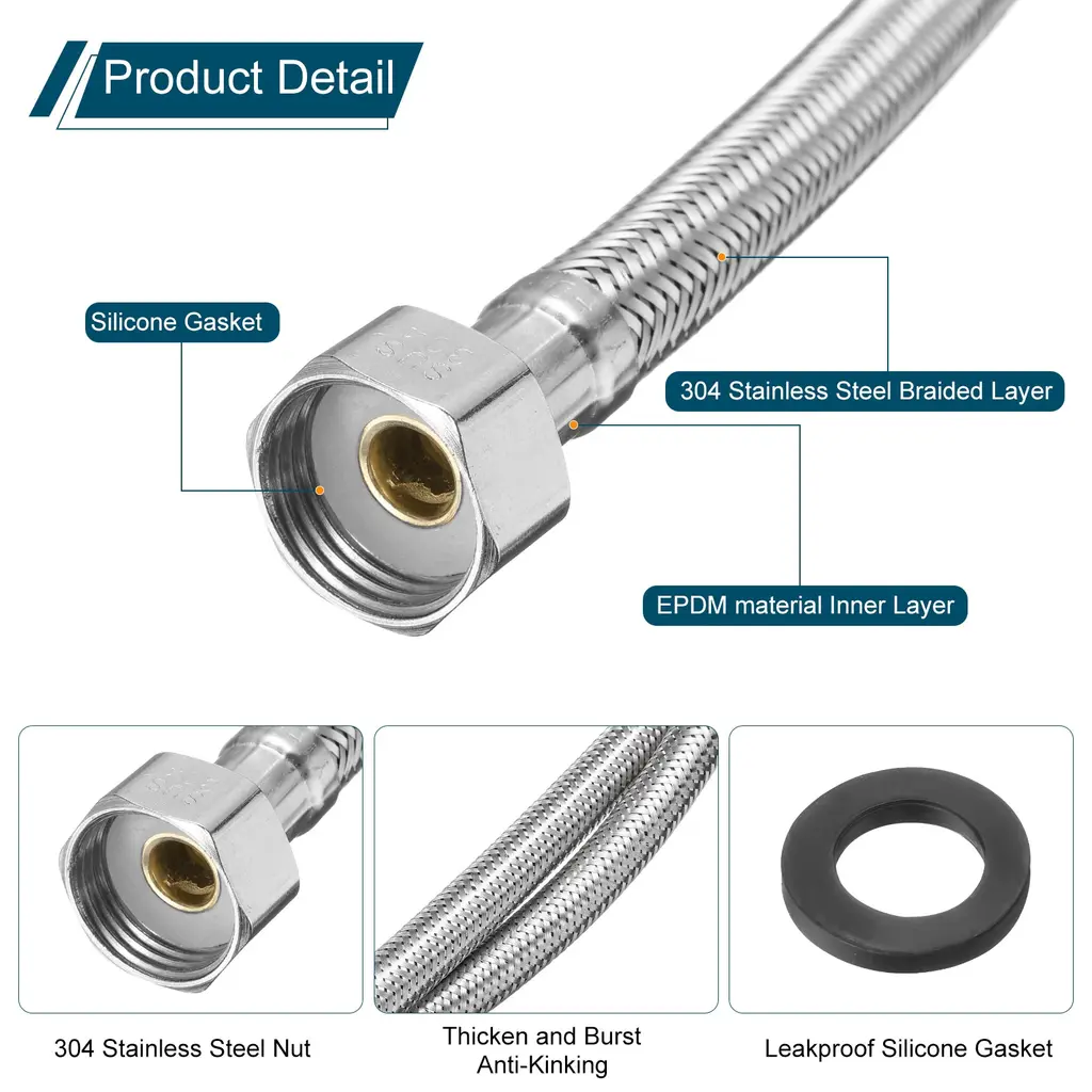 Description:Materials: The shower nozzle hose has three layers of material (Inner Layer Of EPDM material, 304 Stainless Steel Braided Layer, and Outer Layer Of Hybrid Braiding), which is flexible, kink-resistant, heat-resistant, durable, strong and wear-resistant.Leakproof Design: G1/2 inch universal nut with a rubber gasket inside, which improves the sealing performance to a certain extent and effectively prevents leakageEasy to Install: The connector with female compression threads facilitates easy attachment to most faucets. It also comes with a male connector and wrench. It is easy to install in minutes by hand, enabling effortless connection to various faucets and fixtures for added convenience and versatility.Application: The braided supply line can supply hot and cold water for the bathroom, toilet, washbasin, water heater, base faucet, and any place where water supply is needed, both in summer and winter.Specification:Female Compression Thread Inner Diameter: 20mm/0.8 inchLength: 40 cm /16 inchesPackage Content: 2 x Faucet Supply Lines