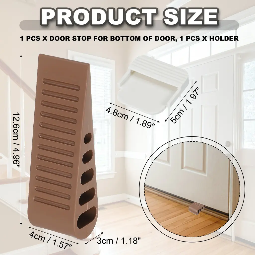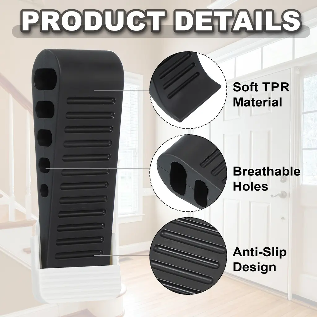 The rubber door stops offer a secure hold on various floor surfaces, including wood, carpet, cement, tile, and stone. These versatile tools effectively keep doors open while adding a touch of practical elegance to any space.SpecificationColor: BlackMaterial: TPRDoorstop Size: 12.6 x 4 x 3 cm / 4.96 x 1.57 x 1.18 Inch (L*W*H)Holder Size: 5 x 4.8 x 1 cm / 1.97 x 1.89 x 0.39 Inch (L*W*H)Packing List: 2 Pcs x Door Stop for Bottom of Door, 2 Pcs x Holder Advantages[Sturdy Rubber] The door stop wedges are crafted from TPR material, ensuring reliability, reusability, and non-slip. Suppleness structure with scientific arched holes, effectively preventing doors from closing due to a breeze and helping prevent cats and dogs from accidentally pushing the door closed.[Silent & Convenient Storage] With a unique wedge-sloped design, these rubber door stops offer excellent grip without scratching floors, walls, or doors. They provide effective noise reduction and come with a self-adhesive holder for easy hanging and storage, keeping your space organized and the doorstop readily accessible.InstructionEasy to use and store. Place it at the bottom of your door and let the wedge get stuck without the need for drilling holes or using adhesive tape. You can store the door stoppers in the holder when not in use.NOTE: Before choosing our products, please confirm whether the size you need is suitable.