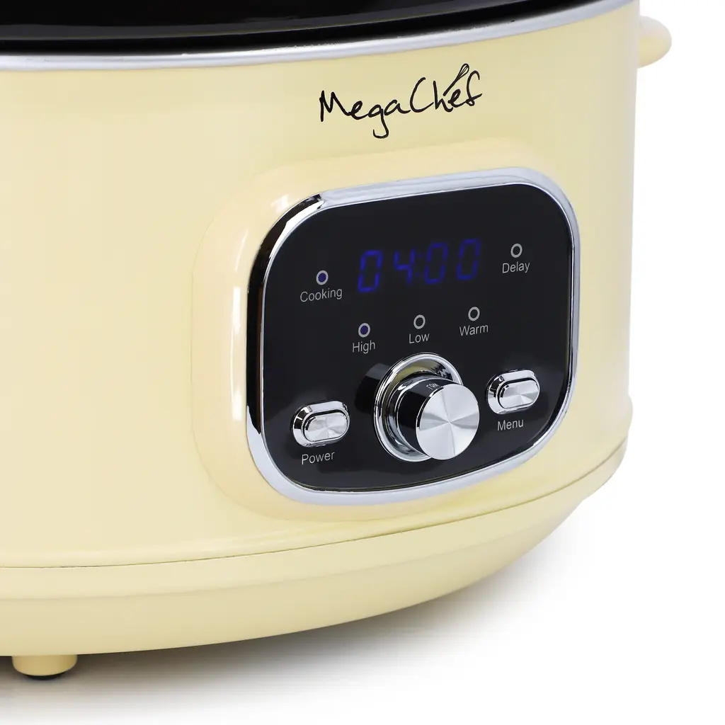 Introducing the MegaChef 3.7 Quart Electric Slow Cooker in Ivory, a stylish addition to any kitchen. This appliance features a removable inner oval ceramic pot in a matching Ivory color, complemented by a modern cream-colored outer shell and panel in the same shade. The digital panel, accented with a soothing Blue light, allows for easy control and monitoring of cooking settings, ensuring precise results with every use.For added convenience and safety, cool-touch handles and knobs in cream color provide a secure grip during handling. The tempered clear glass lid lets you keep an eye on your culinary creations without lifting the lid, preserving heat and flavors. A silver chrome panel at the bottom and edges adds durability and a touch of sophistication.Both the lid and ceramic crock of the MegaChef slow cooker are dishwasher safe, simplifying cleanup after meals. This appliance combines functionality with aesthetic appeal. Whether you're preparing comforting soups, savory stews, or tender roasts, the MegaChef 3.7 Quart Electric Slow Cooker in Ivory is designed to deliver delicious results effortlessly, making it an essential kitchen companion. Item Dimensions: 9.70" x 13.75" x 10.00"Item Weight: 8.60lbs