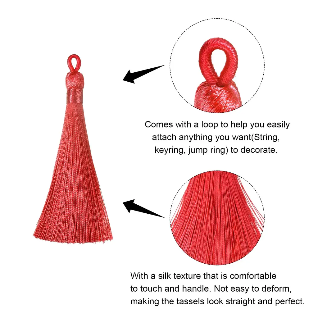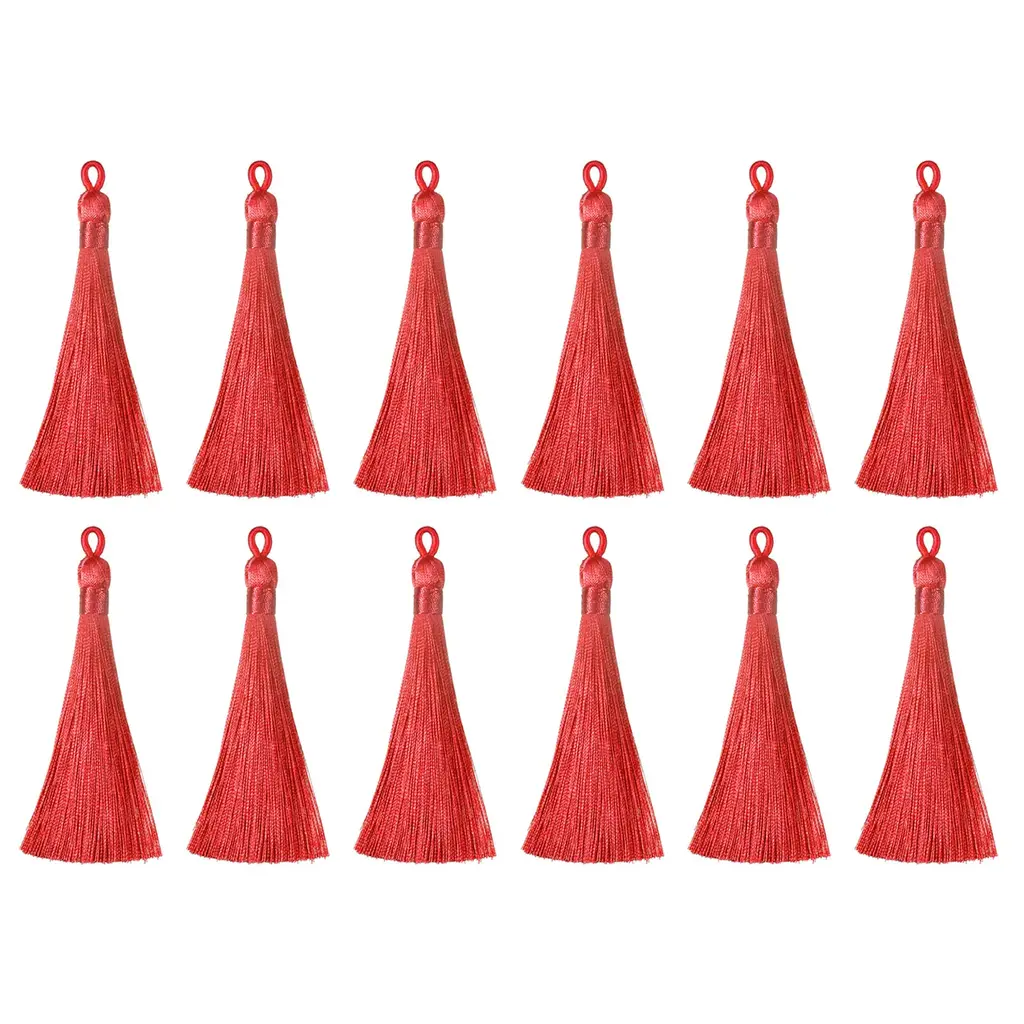 [Bookmark Tassels] - Total Size: 93mm x 10mm/3.66" x 0.39"(L*W); Tassel length: 85mm/3.35"; Loop Length: 8mm/0.31"; Color: Red; Package Included: 12Pcs x Bookmark Tassels.[Material] - Made of polyester material that is sturdy and durable. It has excellent properties such as long-term use without ironing, wear resistance, non-deformation, high strength, and high elastic recovery.[Feature] - The tassel with a silky smooth texture that is comfortable to touch and handle. The tassel thread is tightly wound and not easy to fall off, so that the tassel hang high and looks straight and perfect.[Easy to Use] - Designed with knotted loop to help you easily attach anything you want to decorate without wasting time looking for a string or worrying about splitting the thread as it goes through the body.[Application] - Great for bookmark tassels, keychain tassels, graduation caps, bag accessories, zipper pulls, curtain pendants, clothing design, jewelry making and handmade diy accessories crafting.Description:Made of polyester material that is sturdy and durable. It has excellent properties such as long-term use without ironing, wear resistance, non-deformation, high strength, and high elastic recovery.The tassel with a silky smooth texture that is comfortable to touch and handle. The tassel thread is tightly wound and not easy to fall off, so that the tassel hang high and looks straight and perfect.Designed with knotted loop to help you easily attach anything you want to decorate without wasting time looking for a string or worrying about splitting the thread as it goes through the body.Great for bookmark tassels, keychain tassels, graduation caps, bag accessories, zipper pulls, curtain pendants, clothing design, jewelry making and handmade diy accessories crafting.Product Specifications:Material: PolyesterColor: RedTotal Size: 93mm x 10mm/3.66" x 0.39"(L*W)Tassel length: 85mm/3.35"Loop Length: 8mm/0.31"Package Included:12Pcs x Bookmark Tassels