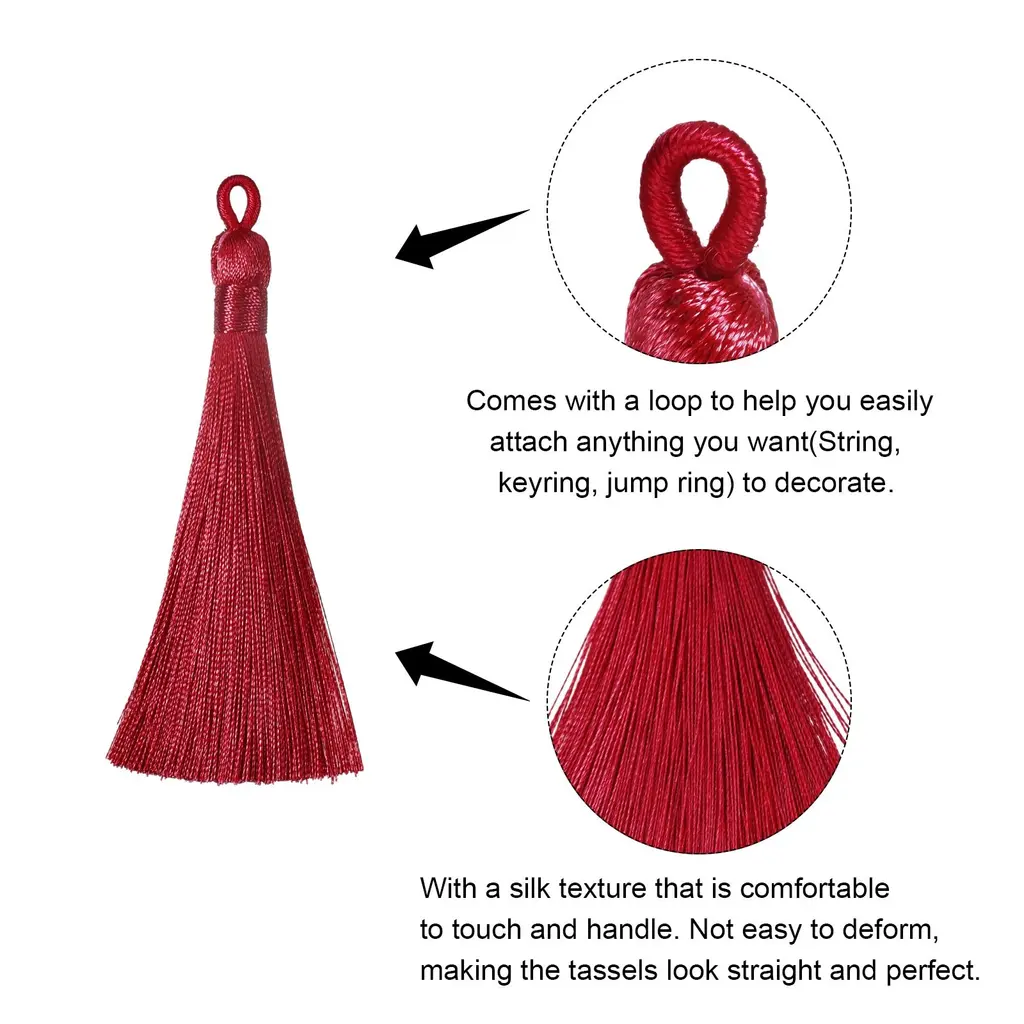 Description:Made of polyester material that is sturdy and durable. It has excellent properties such as long-term use without ironing, wear resistance, non-deformation, high strength, and high elastic recovery.The tassel with a silky smooth texture that is comfortable to touch and handle. The tassel thread is tightly wound and not easy to fall off, so that the tassel hang high and looks straight and perfect.Designed with knotted loop to help you easily attach anything you want to decorate without wasting time looking for a string or worrying about splitting the thread as it goes through the body.Great for bookmark tassels, keychain tassels, graduation caps, bag accessories, zipper pulls, curtain pendants, clothing design, jewelry making and handmade diy accessories crafting.Product Specifications:Material: PolyesterColor: Wine RedTotal Size: 93mm x 10mm/3.66" x 0.39"(L*W)Tassel length: 85mm/3.35"Loop Length: 8mm/0.31"Package Included:20Pcs x Bookmark Tassels