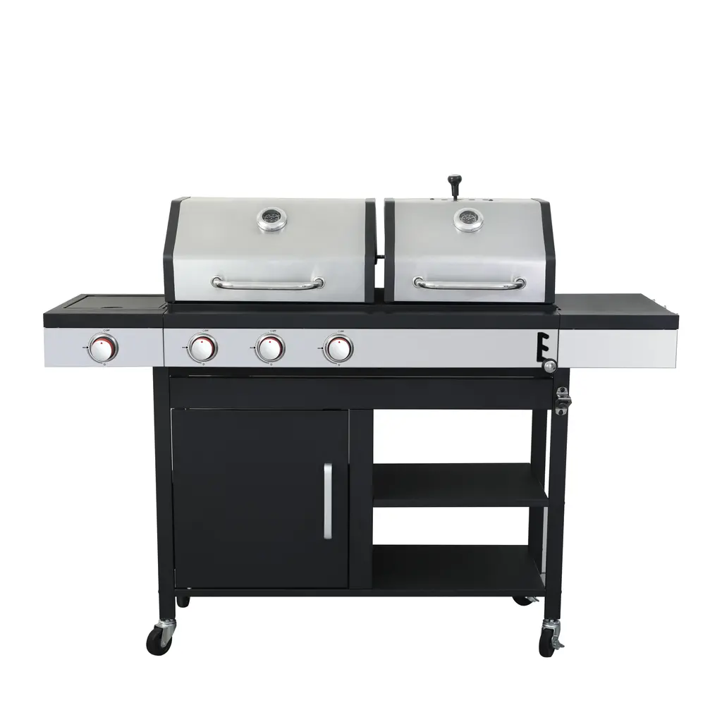 3-Burner Propane Gas Bbq Grill With Side Burner Charcoal Grill Enameled Cast Iron Cooking Grids For Outdoor Barbecue - Silver/black