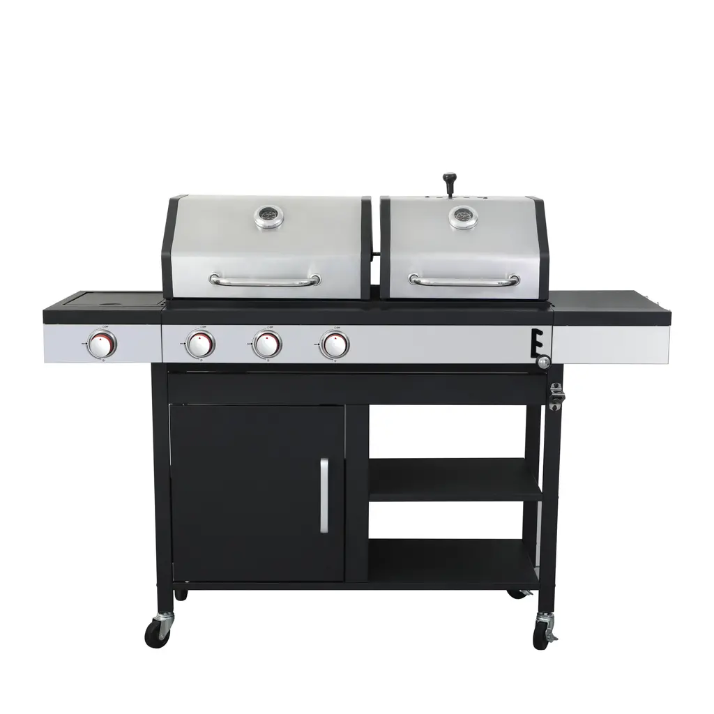 3-Burner Propane Gas Bbq Grill With Side Burner, Combined With Charcoal Grill, 37230btu Output With Enameled Cast Iron - Stainless Steel