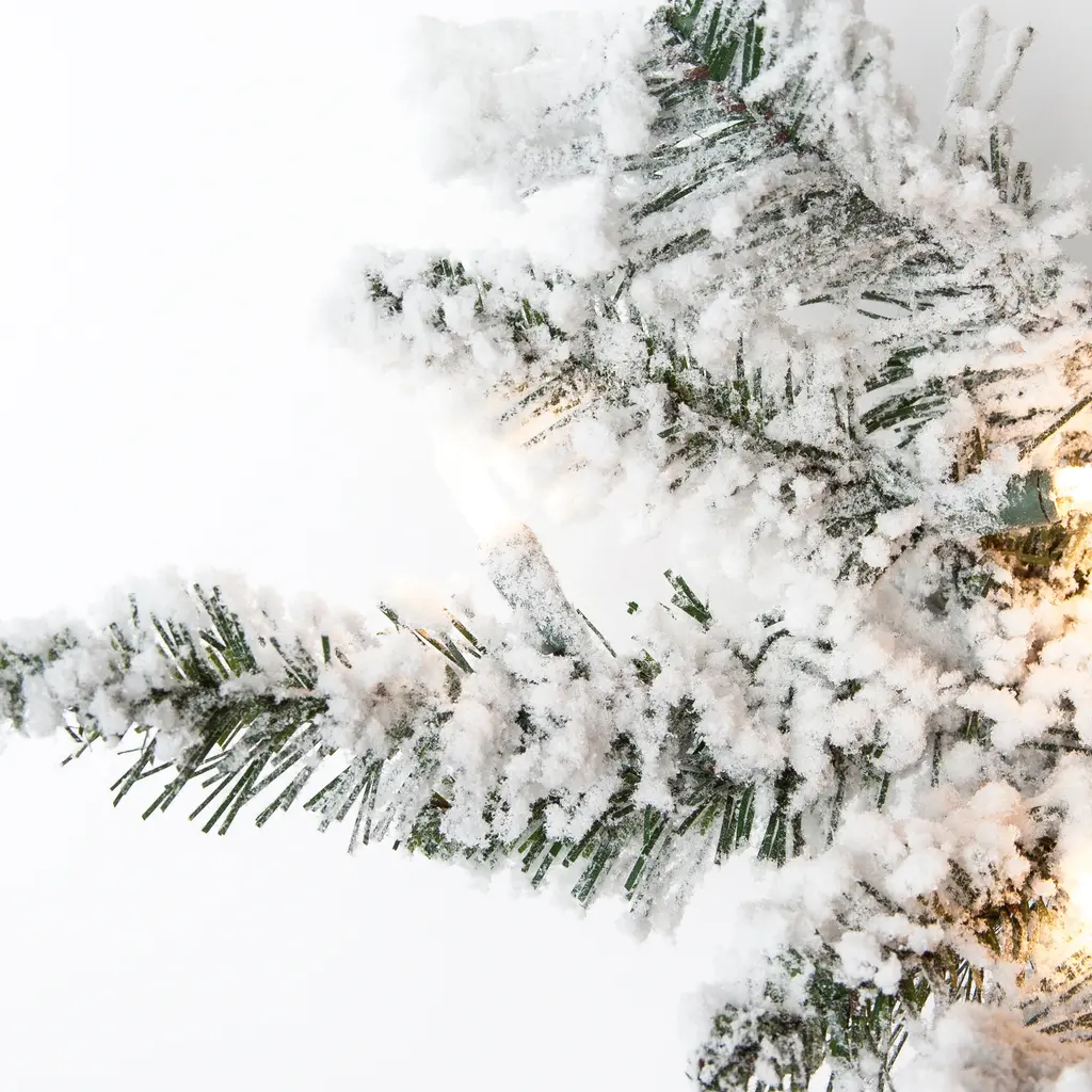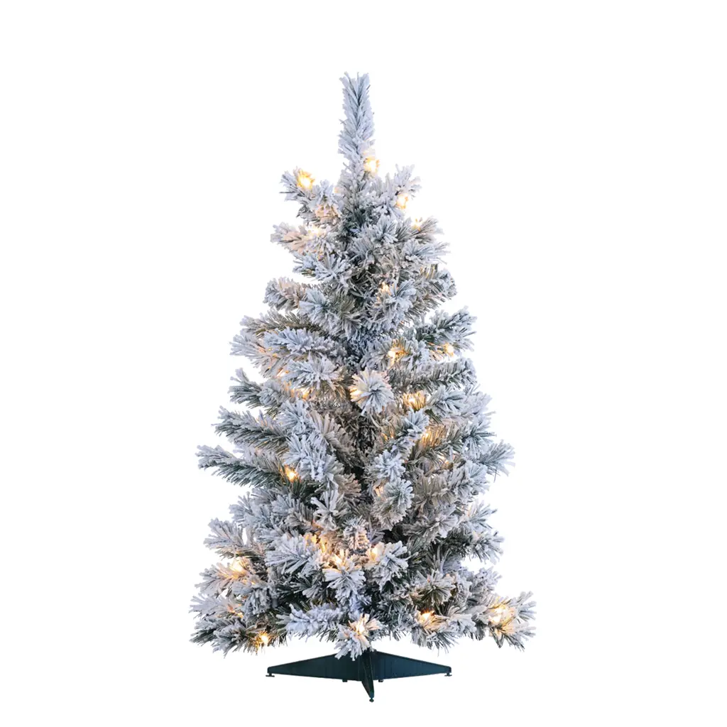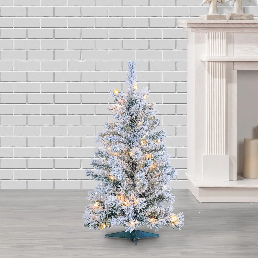 Ease into the holidays with this pre-lit, flocked artificial Colorado Spruce Christmas tree so realistic It could fool your gardener! Standing 3-feet high with a base diameter of 21-inches, this Spruce comes with 50 clear bulbs to add a warm, hearth-and-home glow, but without the mess and fire dangers of a live-cut tree. Fire-resistant needles provide 127 branch tips to put your favorite ornaments on display. Efficient design promises not to gobble up your floor space while still providing the cheer to make your holidays a lasting memory. Comes with a 6-inch diameter three-prong plastic stand and replacement bulbs.