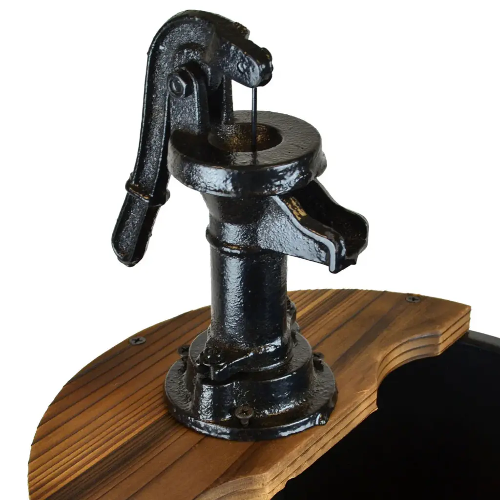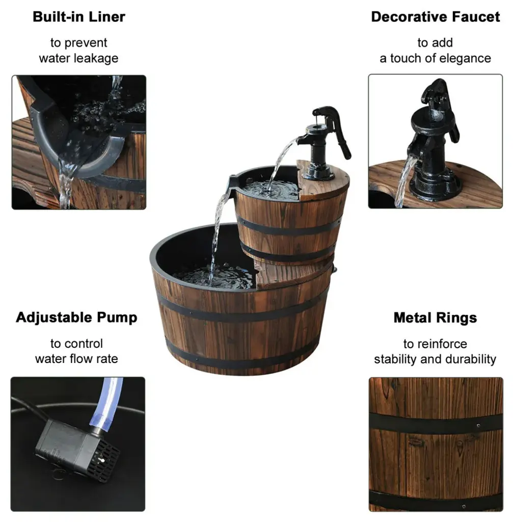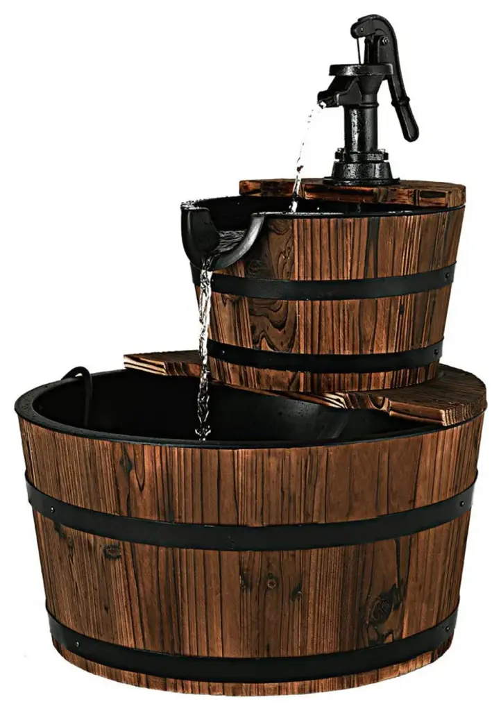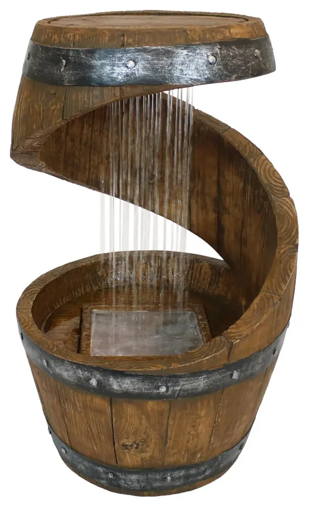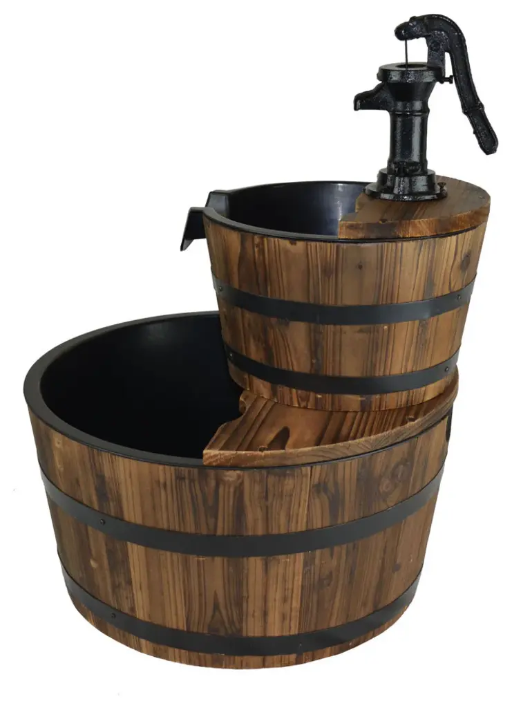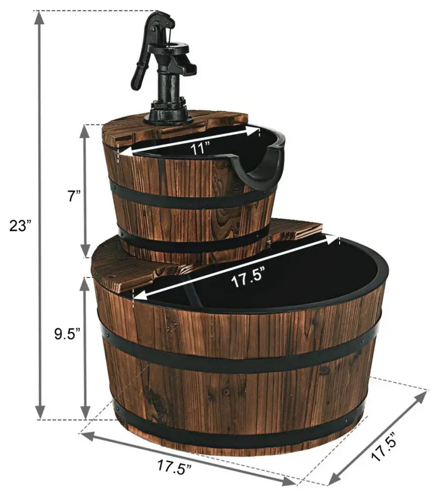 - This garden water fountain features a charming design that is reminiscent of simpler, less complicated times. The design offers a pump from which water trickles down into two barrels.- You will delight in both the sight and gentle sounds of this hand-burnished water fountain.- Simply plug it in and fill it with water. Display this wood barrel fountain as a garden ornament or outdoor sculpture. A thoughtful gift for gardeners.- Dimensions: 18" W x 18" D x 23" H; Weight: Approximately 15 lbs. The included 120V certified UL pump has a knob to control and adjust the flow rate.- Use: Outdoor use in your garden or patio. Provides visual and auditory beauty for your yard and patio; Material: Solid fir; metal; Includes: UL listed submersible pump included; Other: Some assembly required.