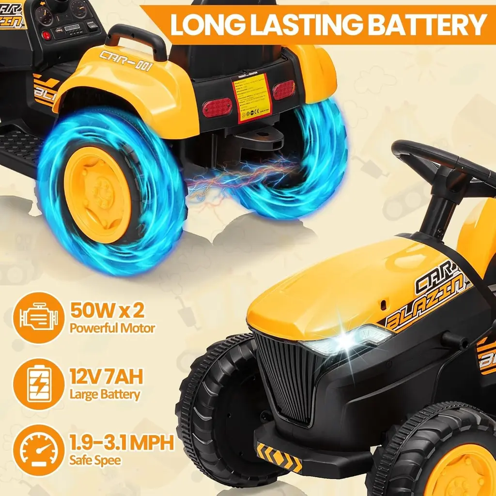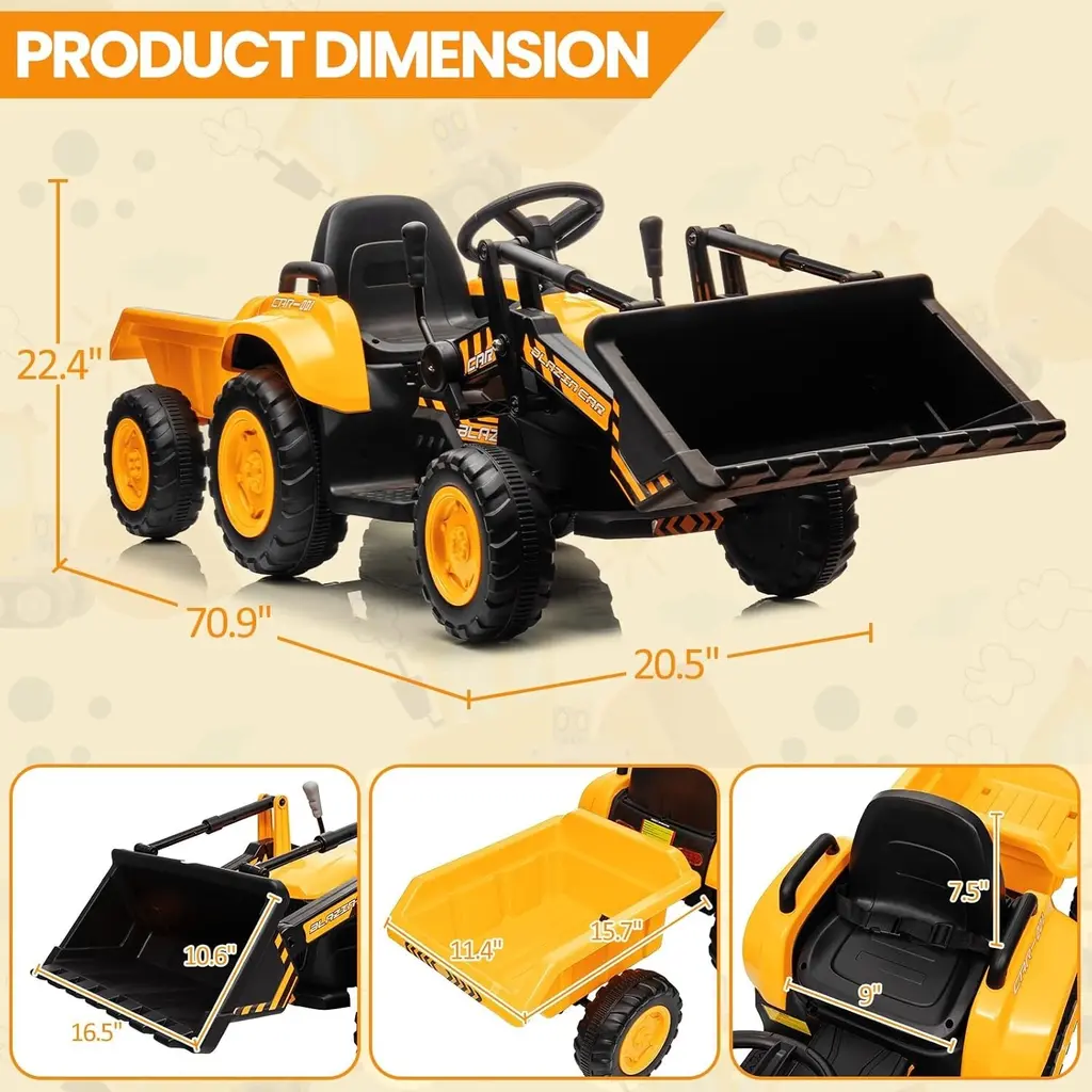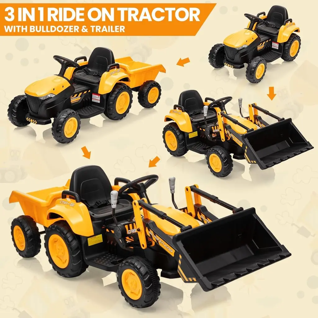 【All-Round 3-in-1 Tractor】Step into adventure with our 12V ride on tractor that doubles as both a and tractor, complete with a versatile shovel bucket and a detachable trailer. It's a customizable playtime masterpiece for little ones 【ACTION-PACKED FRONT LOADER】Experience the real deal with a functioning loader and arm on this ride on bulldozer. Guided by a digging lever, youngsters can dig, lift, and unload just like the pros 【REMIXABLE TRAILER】Our kids electric vehicle boasts a bonus trailer, perfect for hauling toys, snacks, or even helping out in the garden with flowers and supplies. Plus, it's easily removable when not needed 【EASY-PEASY CONTROLS】We've got both kids and parents covered with dual steering modes. Little drivers can take charge with pedals for forward/reverse motion and speed adjustments, while adults can join the fun via a 2.4GHz remote control 【NON-STOP FUN ZONE】Get ready for an immersive play session with built-in tales and tunes. Sync up your smartphone for personalized playlists, enhancing learning and laughter. USB and MP3 compatibility open doors to endless entertainment, complemented by flashy headlights for night rides and a battery gauge that reminds you to juice up