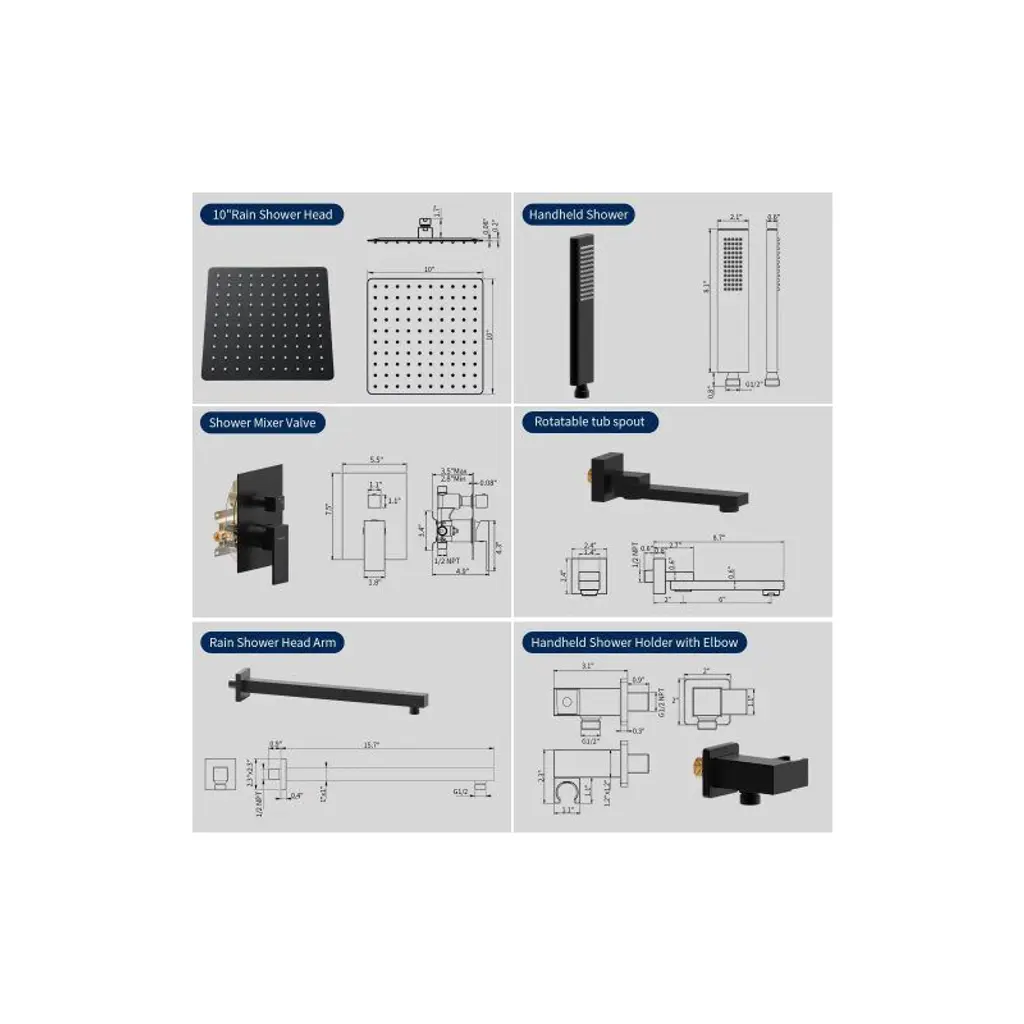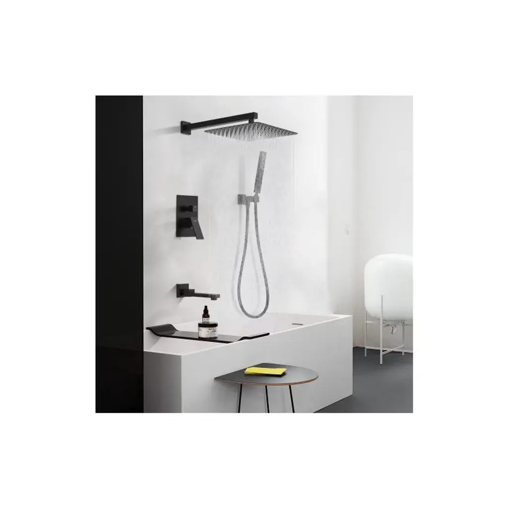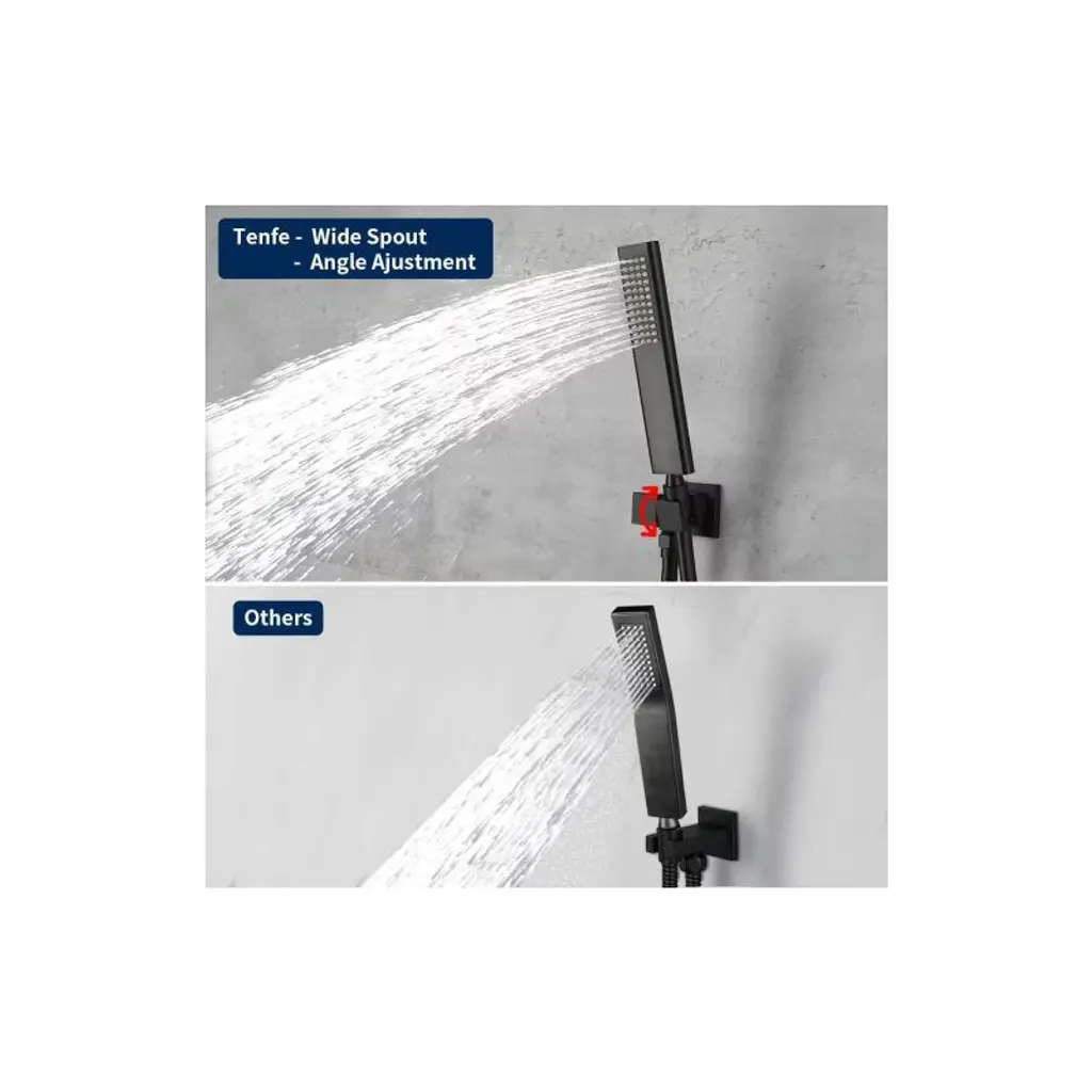 The Tenfe shower system features a brass valve kit for automatic flow and pressure control, with a cUPC certified cartridge to prevent scalding. The matte black, stainless steel fixtures include a space-saving, 180-degree swivel tub spout and an air injection rain shower head for enhanced pressure. This system is easy to install, meets ASME/CSA standards, and comes complete with a rainfall head, handheld shower, and accessories.