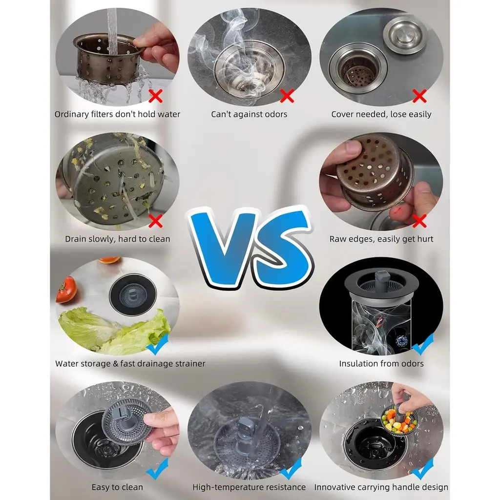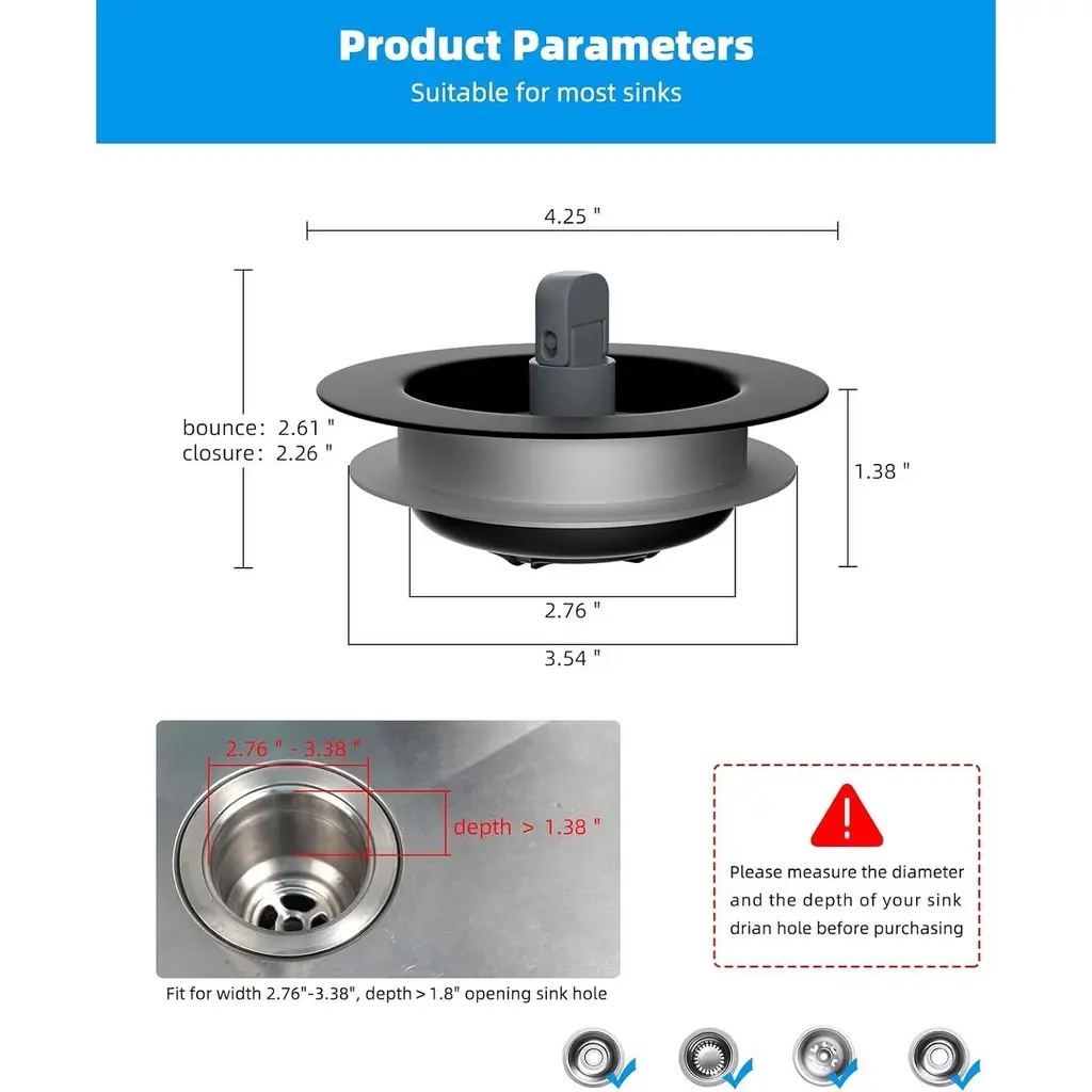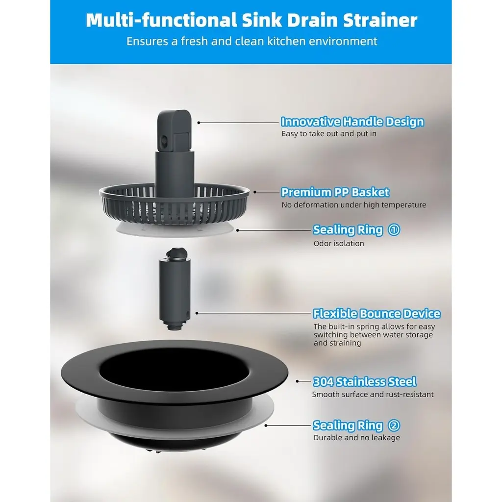 3-in-1 Kitchen Sink Stopper Strainer, 304 Stainless Steel Pop Up Sink Drain Strainer with Upgrade Folded Rod for US Standard 3-1/2 inch Drain Filter, Anti-ClogFeatures: