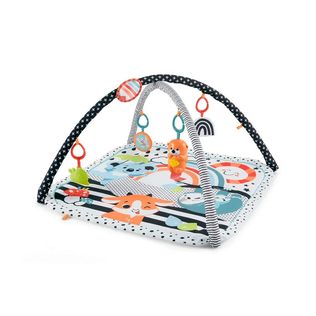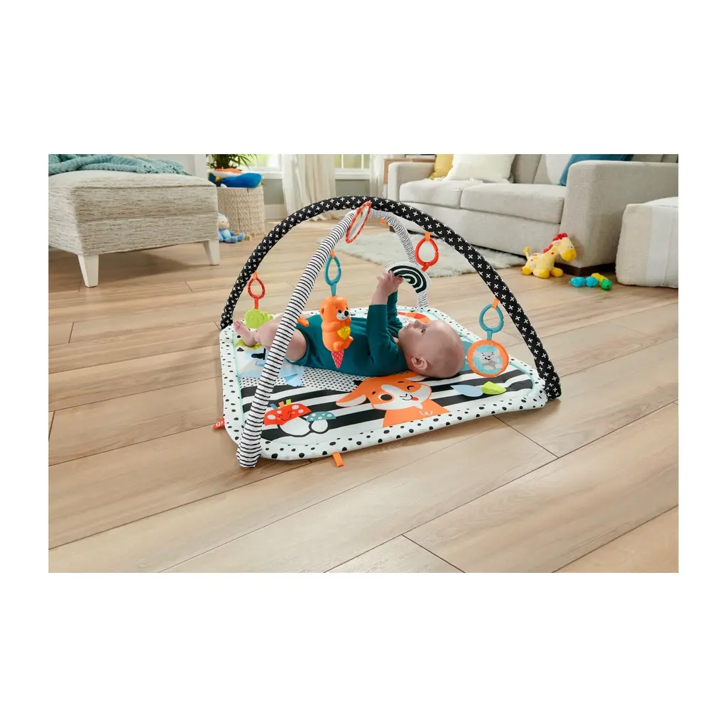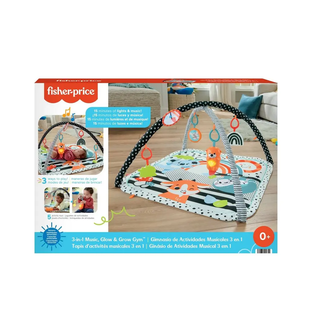 The Fisher-Price 3-in-1 Music, Glow and Grow Gymactivity play mat is the place for your little one to "glow up" their playtime. Newborns can reach, bat, and grasp 5 linkable activity toys including a mirror, soft rattle hedgehog toy, BPA-free snail teether, crinkle rainbow toy, and a music and lights otter. The music and lights otter plays 15 minutes of music and shines a soft-glowing light to make playtime otter-ly fun on or off the mat! As your baby grows, remove the two arches for tummy time on the large, comfy mat, so they can push up and engage those neck and core muscles. Plus, the gym's high-contrast colors can help with baby's earliest visual development.