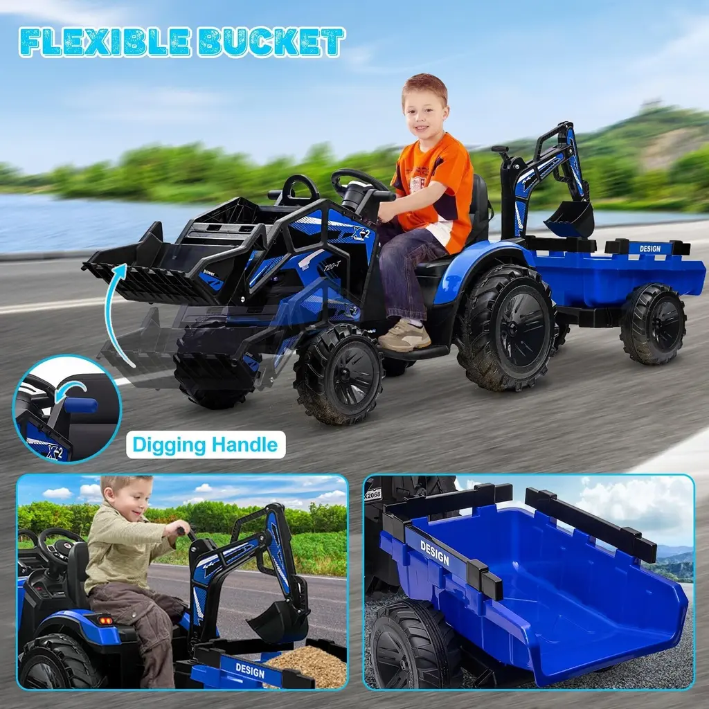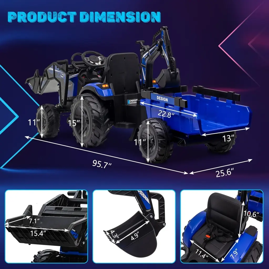 GET READY FOR ENDLESS FUN: Unleash your child's inner adventure with the 24V ride-on tractor. With two powerful 80W motors and front and rear loaders, this versatile electric ride-on excavator lets your child experience the thrill of being in control. 3-in-1 DESIGN: This electric tractor for kids features a 3-in-1 design, this excavator ride on toy is a perfect combination of tractor, excavator and bulldozer. FAMILY BONDING: Our included 2.4G wireless remote control ensures a safe and fun experience for both kids and parents. SAFETY FIRST: Safety is the top priority. All four wheels of this 3 in 1 tractor 24v are equipped with shock absorbing springs to reduce impact during riding and increase riding comfort and safety. MULTI-FUNCTIONAL CENTER CONSOLE: one button switch, easy to start. This kids electric tractor is equipped with built-in music, reading functions and MP3, forward/reverse switch, and LED lights. PERFECT GIFT: No child can resist the temptation of a cool electric construction vehicle. Choose the kids tractor ride on to make birthdays, Christmas and special days unforgettable for kids.