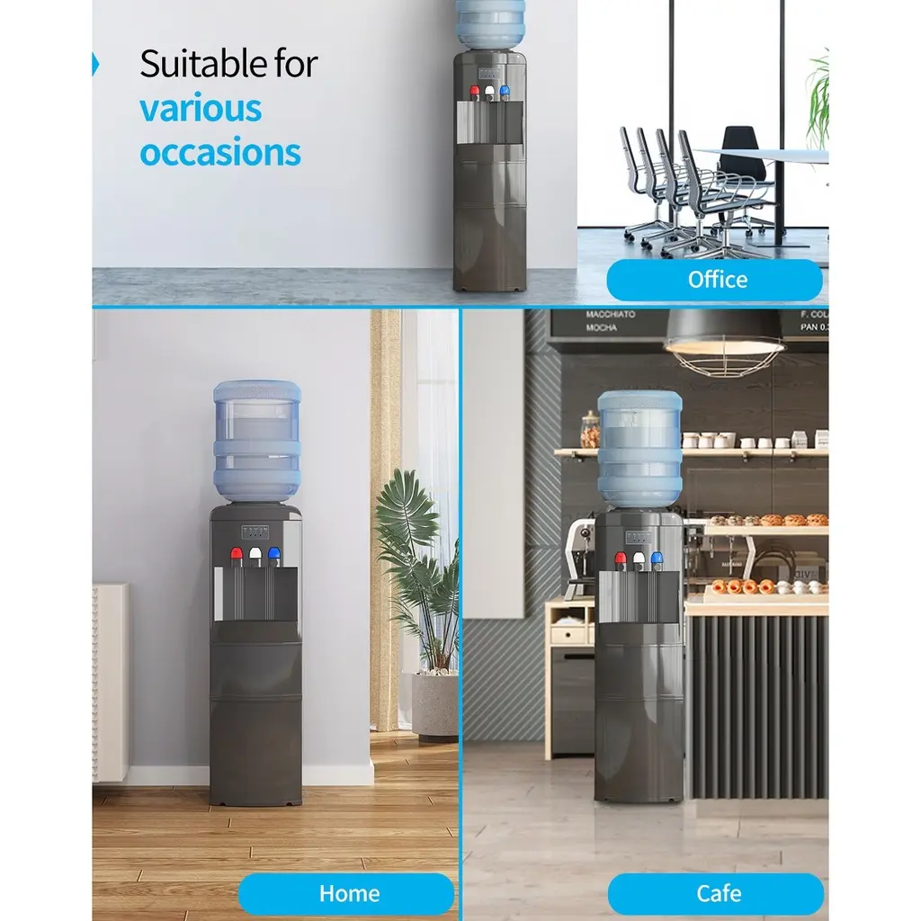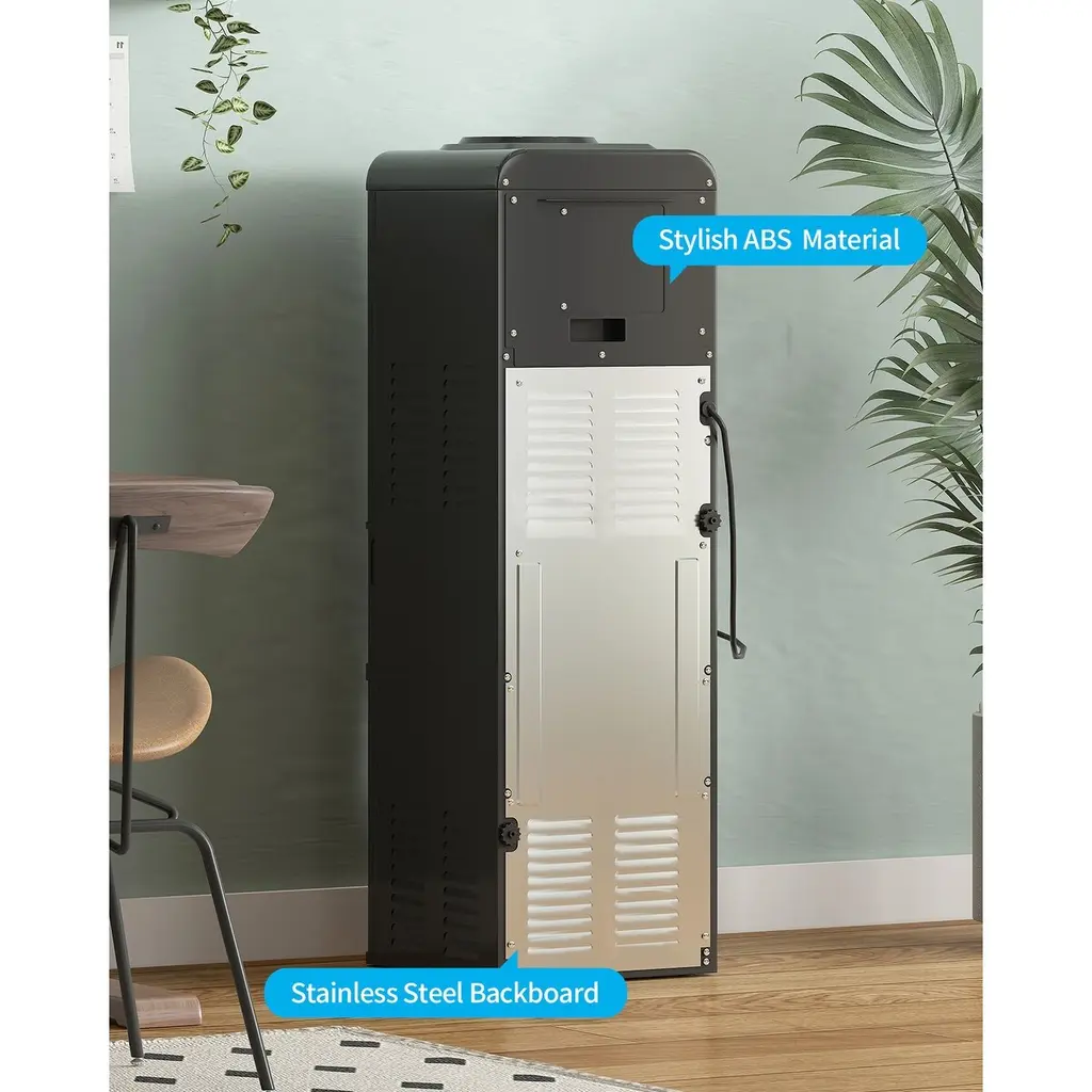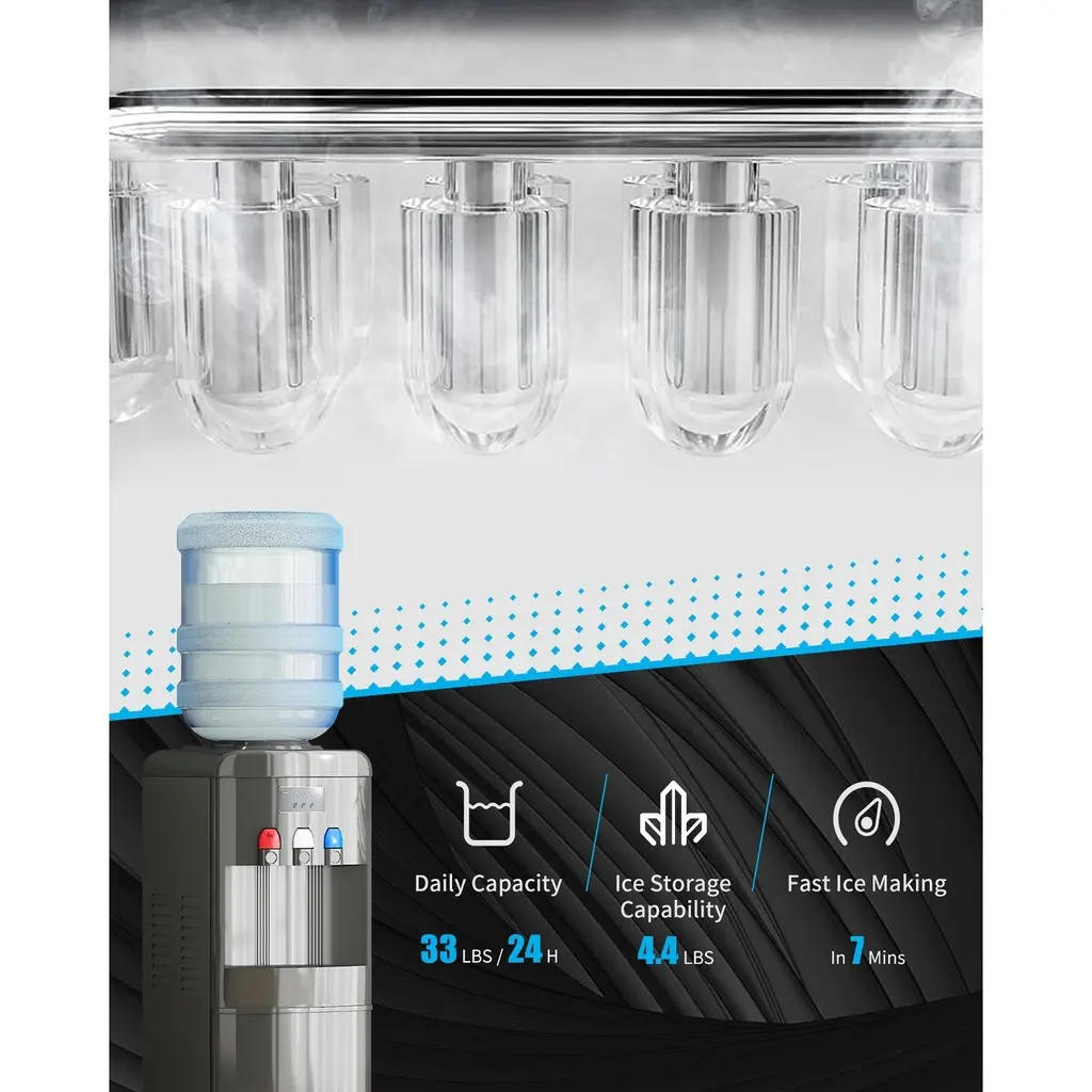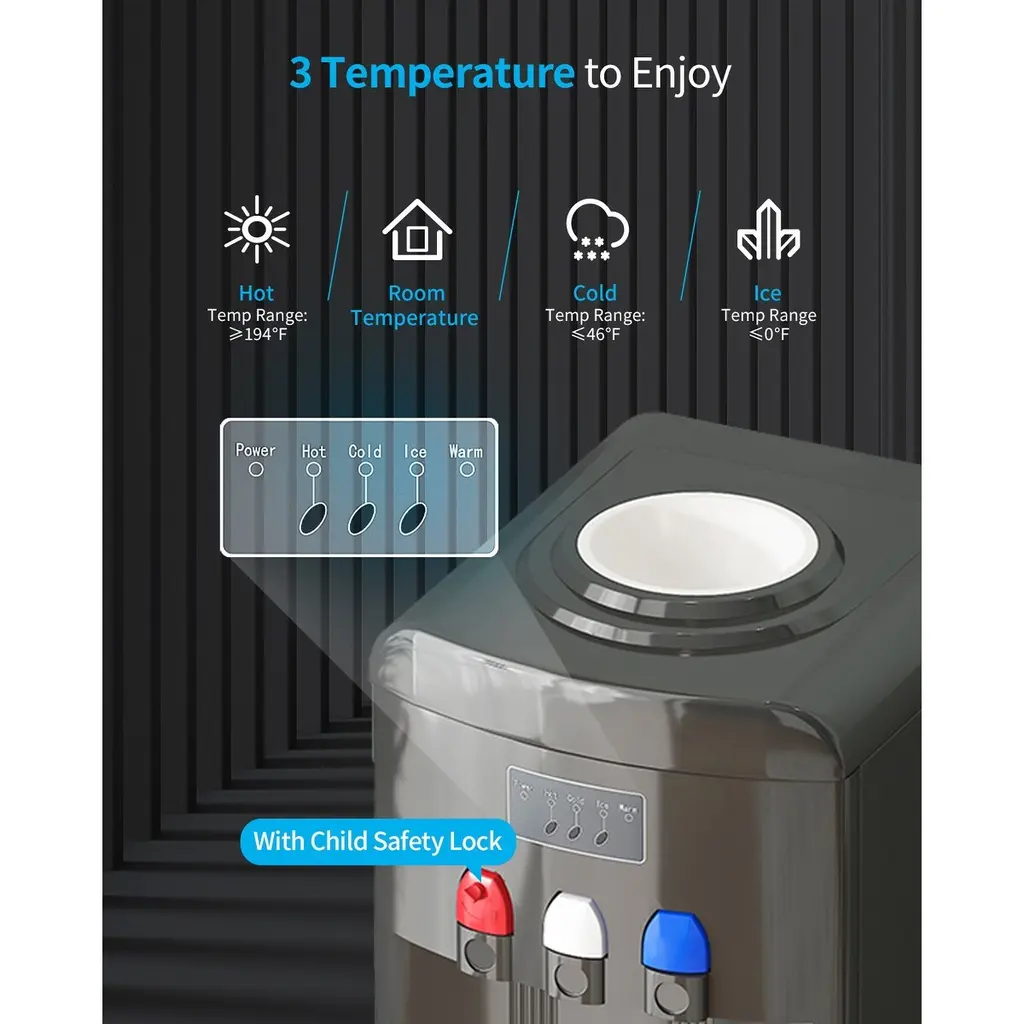 【3-in-1 Water Dispenser】This 3-in-1 Water Dispenser has three temperature settings for cold water, hot water and ice making, which can be used as a water dispenser as well as an ice maker. With this water dispenser, you can enjoy drinking water and ice at the same time, meeting your unused needs while saving costs and indoor space. 【Excellent Ice Making Capability】This 3-in-1 water dispenser is equipped with an integrated ice maker, which can even surpass the ice making capability of desktop ice makers in the market. This water dispenser with ice maker can make up to 33 pounds of ice per day and produce fresh ice every 6-8 minutes, which is perfect for daily ice needs for family cold drinks. 【Safety Lock Design】This water dispenser with ice maker has corresponding touch buttons in the control area and a built-in child safety lock on the hot water function, which ensures safety and prevents accidental scalding accidents. The intuitive operation of this water dispenser ensures that it can be used by users of all ages, including the elderly and children. 【Low Noise & Environmental Protection】This water dispenser is energy efficient and environmentally friendly, the noise during operation is very low and will not affect your daily life. Unlike traditional electronic refrigeration, our water dispenser with ice maker utilizes a high-performance compressor to make ice, which provides excellent efficiency and stability. 【Suitable for Multiple Occasions】This water dispenser with ice maker measures 39.76" x 14.96" x 12.20". The water dispenser can accommodate multiple people's drinking preferences at once, making it ideal for use in offices, home kitchenettes, dormitories, coffee shops, and more.