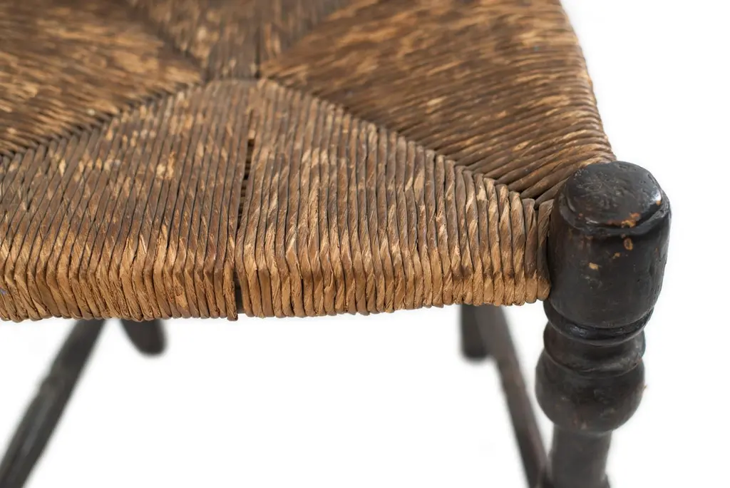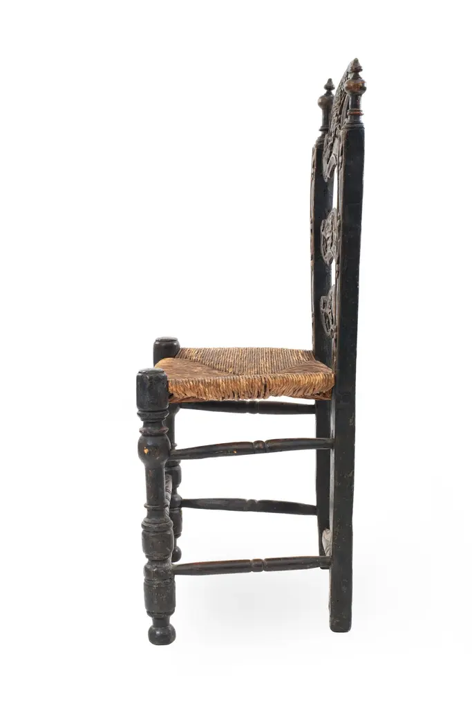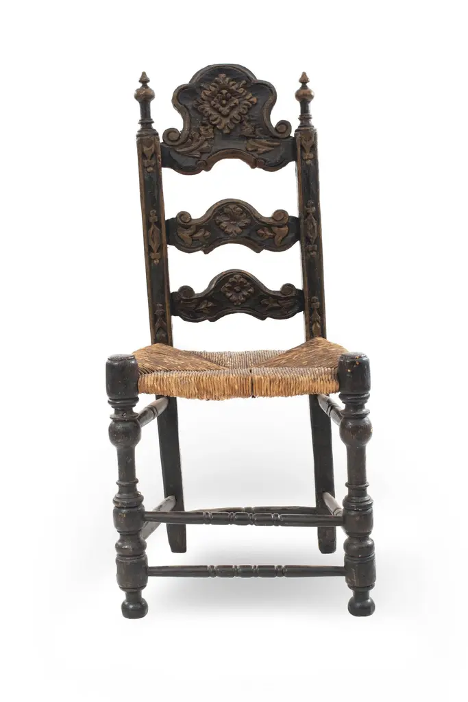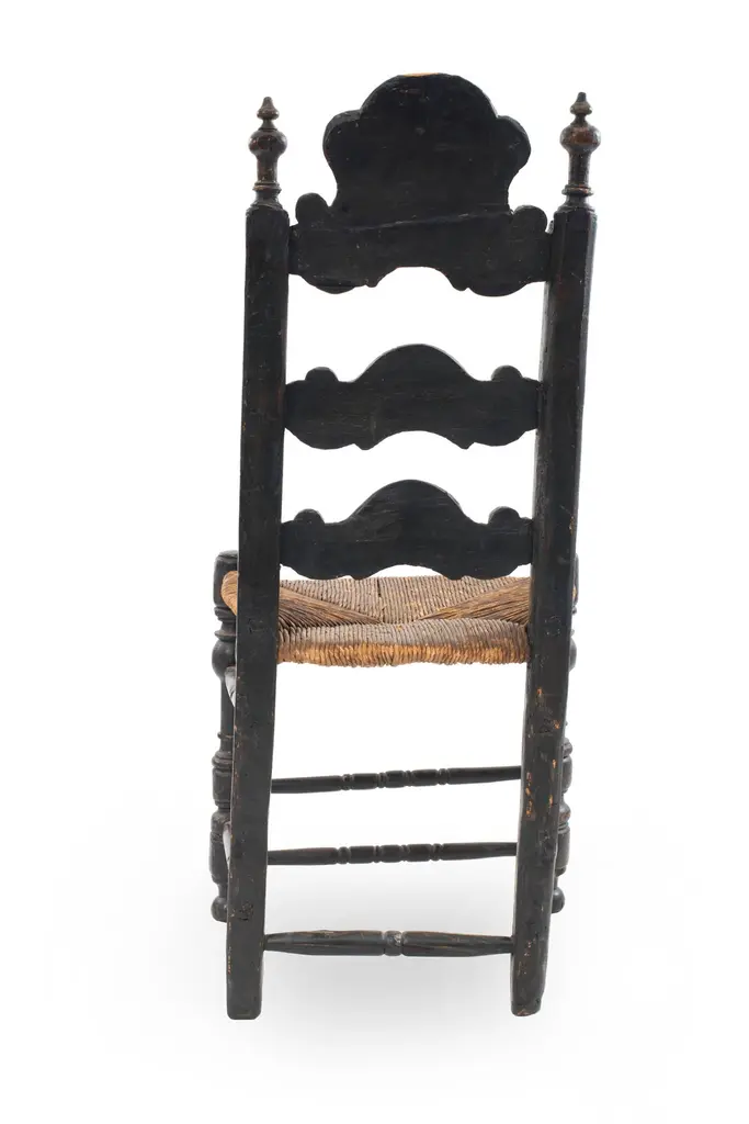 3 Italian Renaissance style (17th Cent) green and gold painted & carved ladder back high back side chairs with rush seat. (PRICED EACH)
