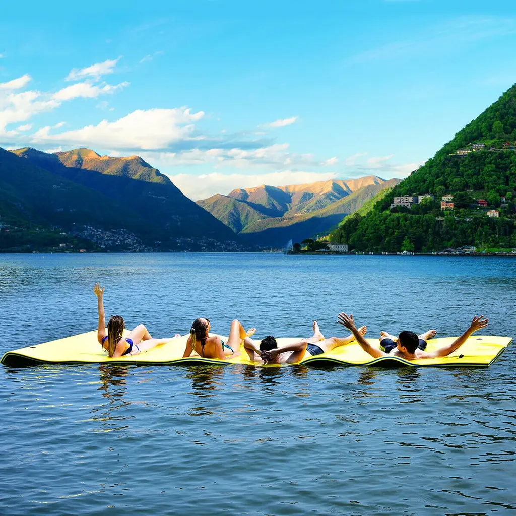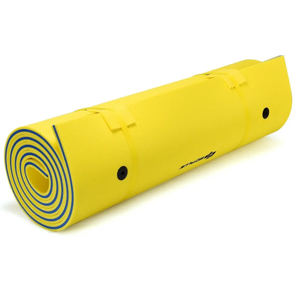 Do you want to enjoy the fun on the water? Our floating pad can bring you cool and laughter on a hot summer day. You can take it to water parks, swimming pools, lakes, beaches and the sea for water games, parties, sunbathing and relaxation. Made of three layers of eco-friendly XPE foam, it has strong buoyancy and high quality, no water absorption and no deformation. With strong buoyancy and load-bearing capacity, it is suitable for 6-8 people. And it is lightweight and easy to store and carry when rolled up, saving your space. It is the best gift for parents, children and friends, don't hesitate to buy it.FeatureSuitable for water parks, swimming pools, lakes, beaches, the sea and more. Support to 1222lbs of evenly distributed weight and is suitable for 6-8 persons Made of environmentally friendly XPE foam, not easy to decompose, odorless, bouncy, safe. The three-layer XPE foam is compounded, with strong buoyancy, no water absorption and no deformation.This floating water pad is lightweight and easy to handle.Roll up for easy carrying and storage, saving your space.Use the included two 4.9' bungee tethers to prevent yourself and the pad from drifting away.Smooth surface, comfortable and cool, easy to clean, can be used on both sides.SpecificationMaterial: XPE foamColor: YellowBlueOverall Size: 18' x 6' x 1.5'' (L x W x H)Net Weight: 23.5lbsWeight Capacity: 1222lbsPackage includes: 1 x Floating Water Pad 2 x Bungee Tethers