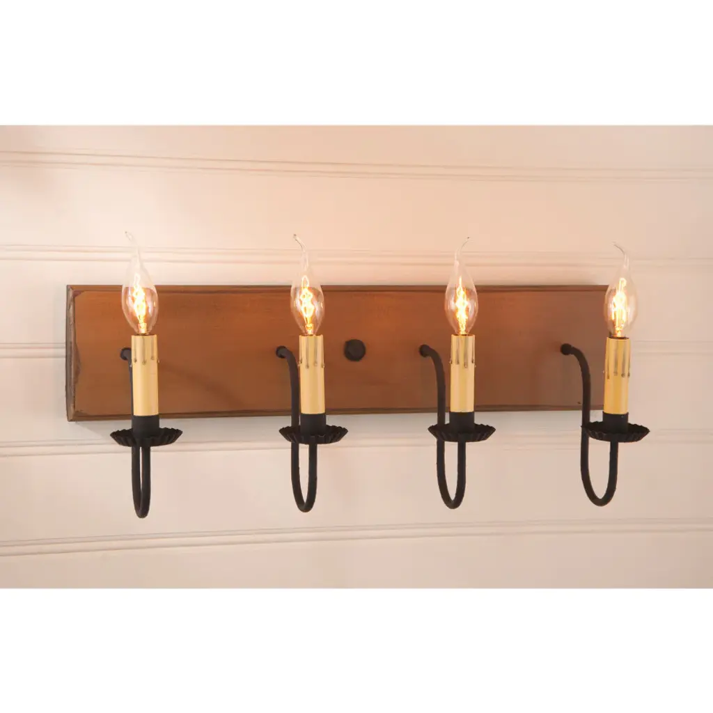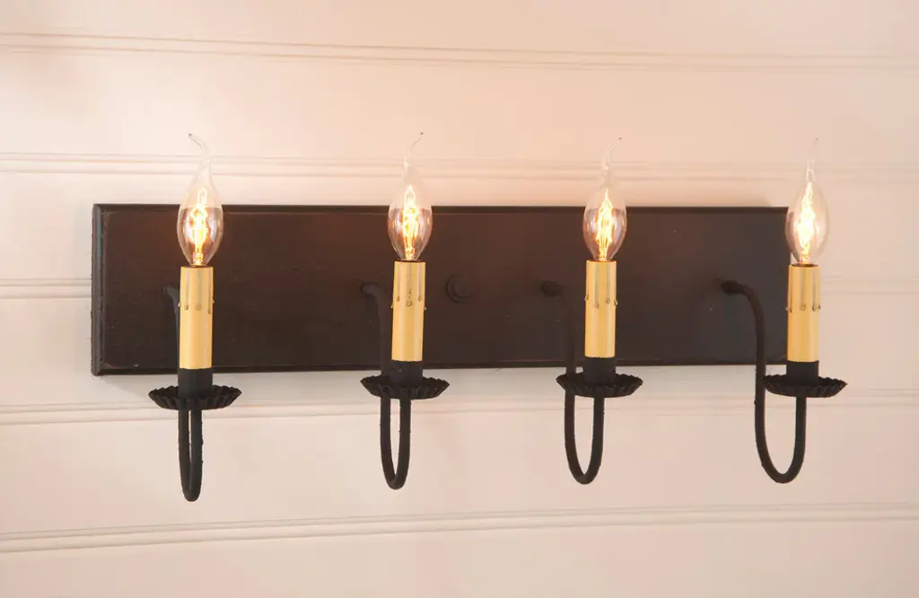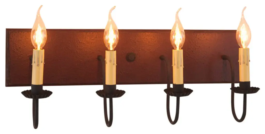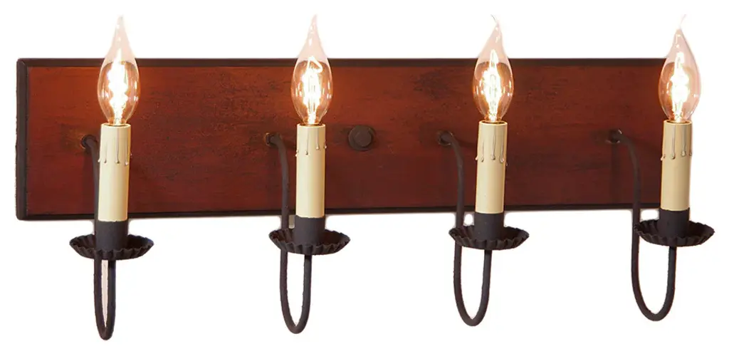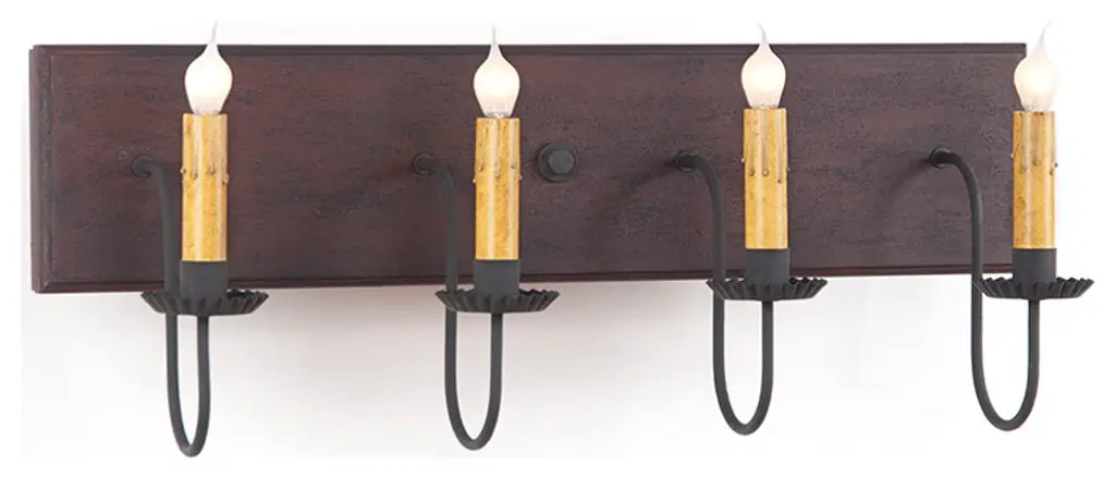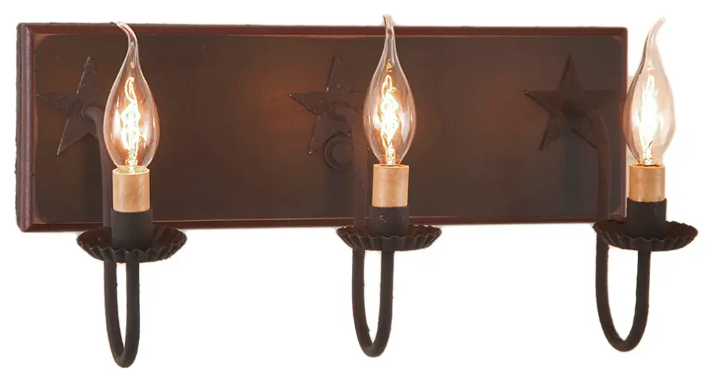 A classic country lighting fixture designed to illuminate your bathroom with the ease and charm of days gone by. With a textured pearwood painted wooden back, this wonderful vanity light is sure to compliment your decor. Direct wired with three E12/Candelabra sockets, 60 watts max. per arm. Pearwood body color. Black textured arms. Handcrafted in Pennsylvania. This mirror light is UL-CUL listed and has a 5 year guarantee.• Measures 9-Inches high and 17.25-Inches wide and 8.5-Inches deep• Direct hardwire; 3 E12/Candelabra sockets, 3 x 60 watts maximum wattage• UL-CUL listed for dry locations• Textured pearwood painted wood back and textured arms with crimped pans• Made in the USA