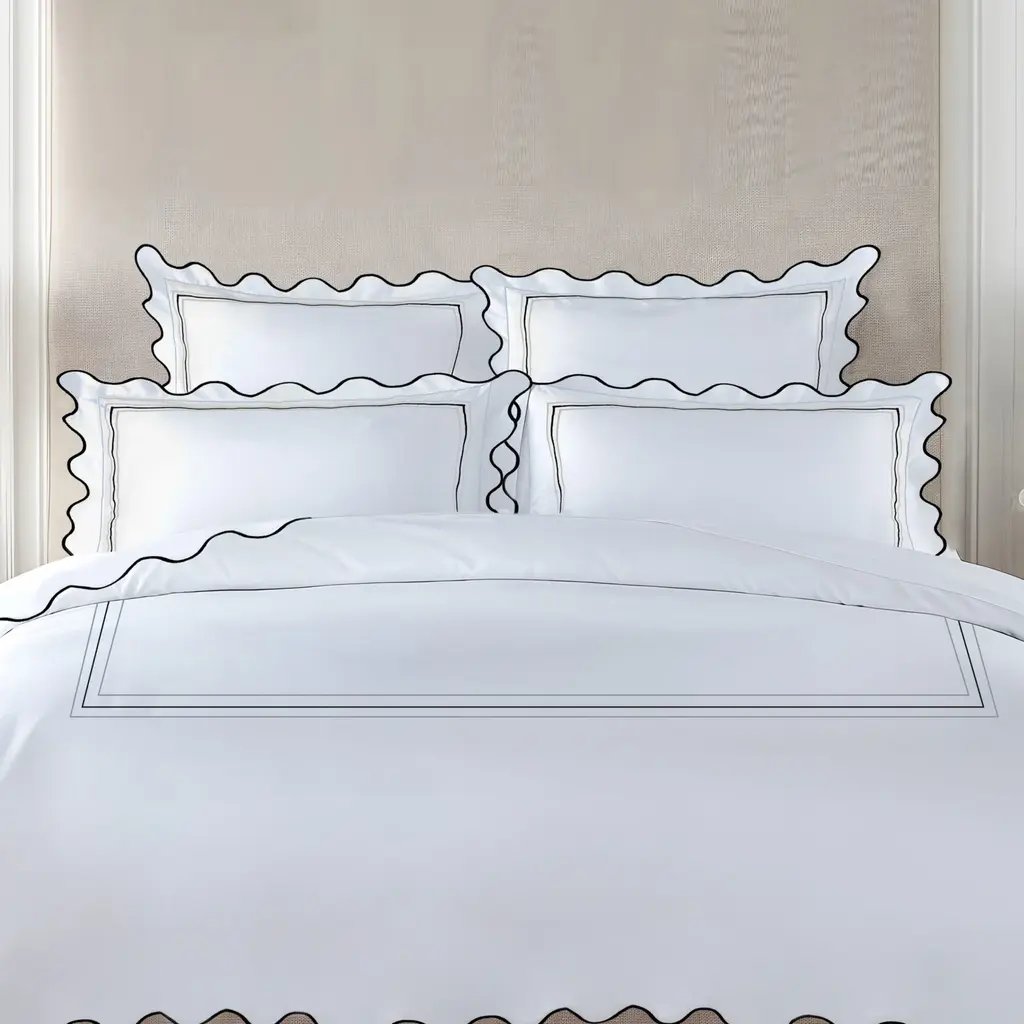 Elevate your bedding experience with the 3 Lines and Waves Top Sheet from The Lino. Its delicate embroidery of three lines exudes elegance and sophistication, while the 100% Egyptian cotton and 400-thread count percale weave provide ultimate comfort. Indulge in refined simplicity and luxurious comfort with this timeless and modern piece. Highlights