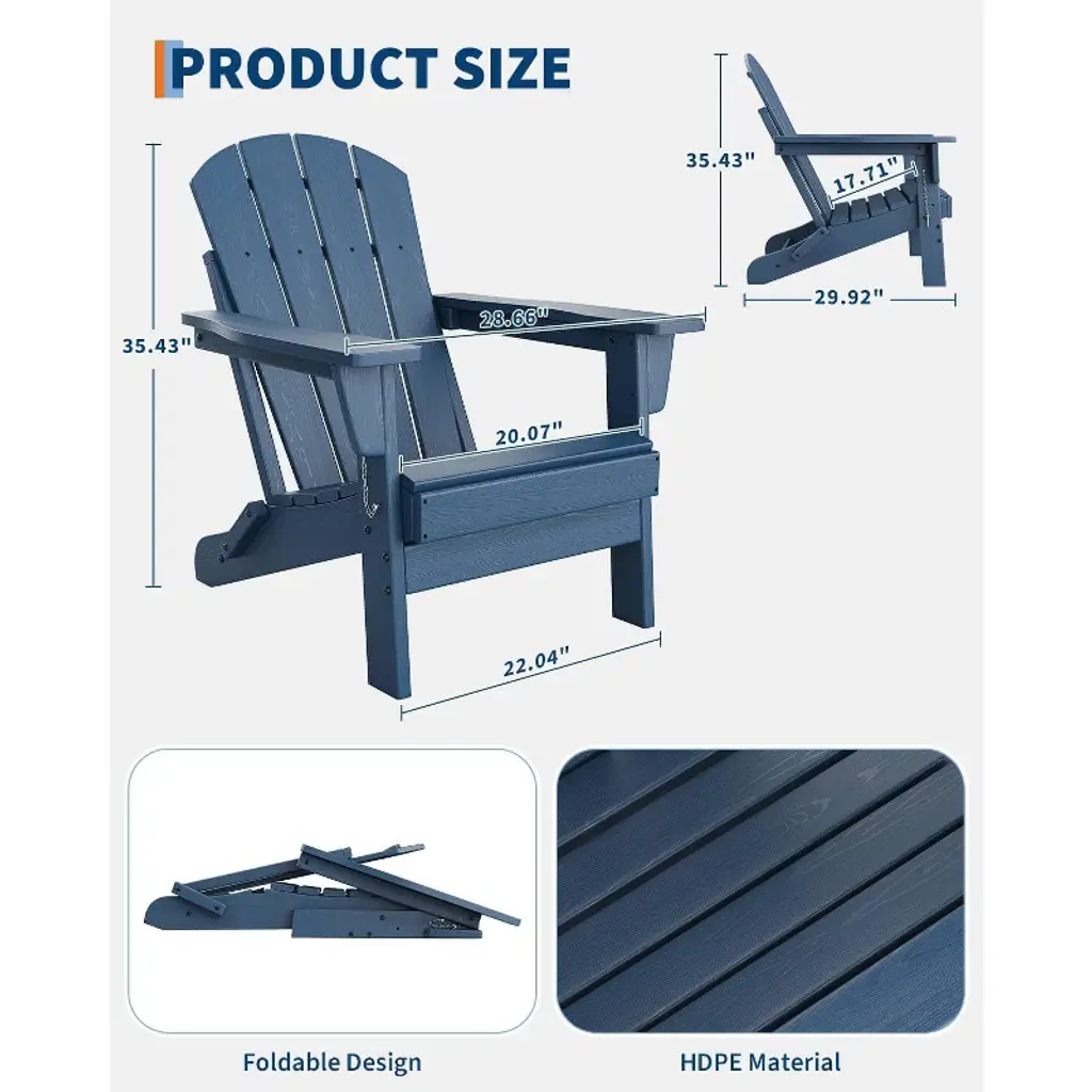 3-piece Folding Adirondack Chairs Set Of 2 With Side Table, Hdpe Plastic Outdoor Chairs With Wood Texture,navy Blue