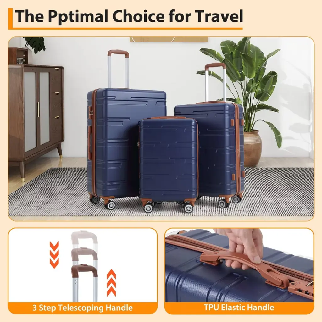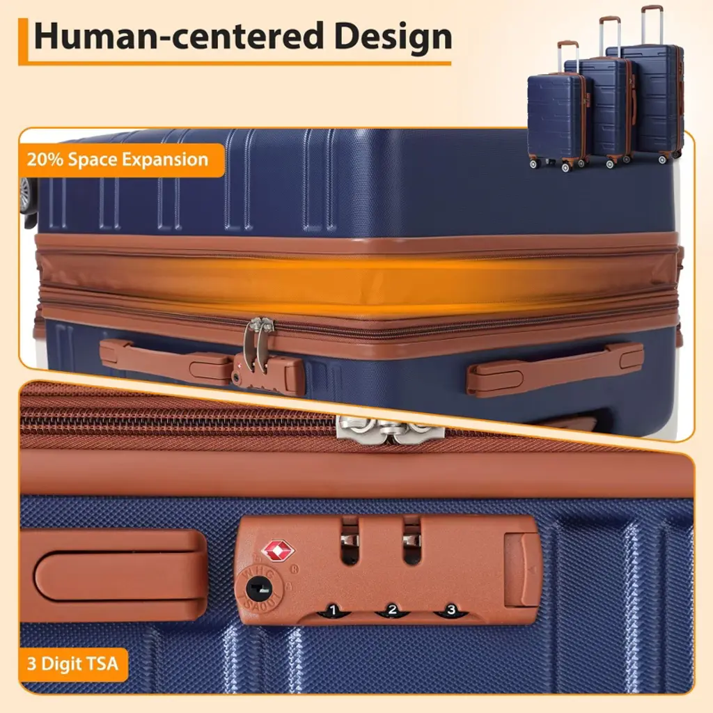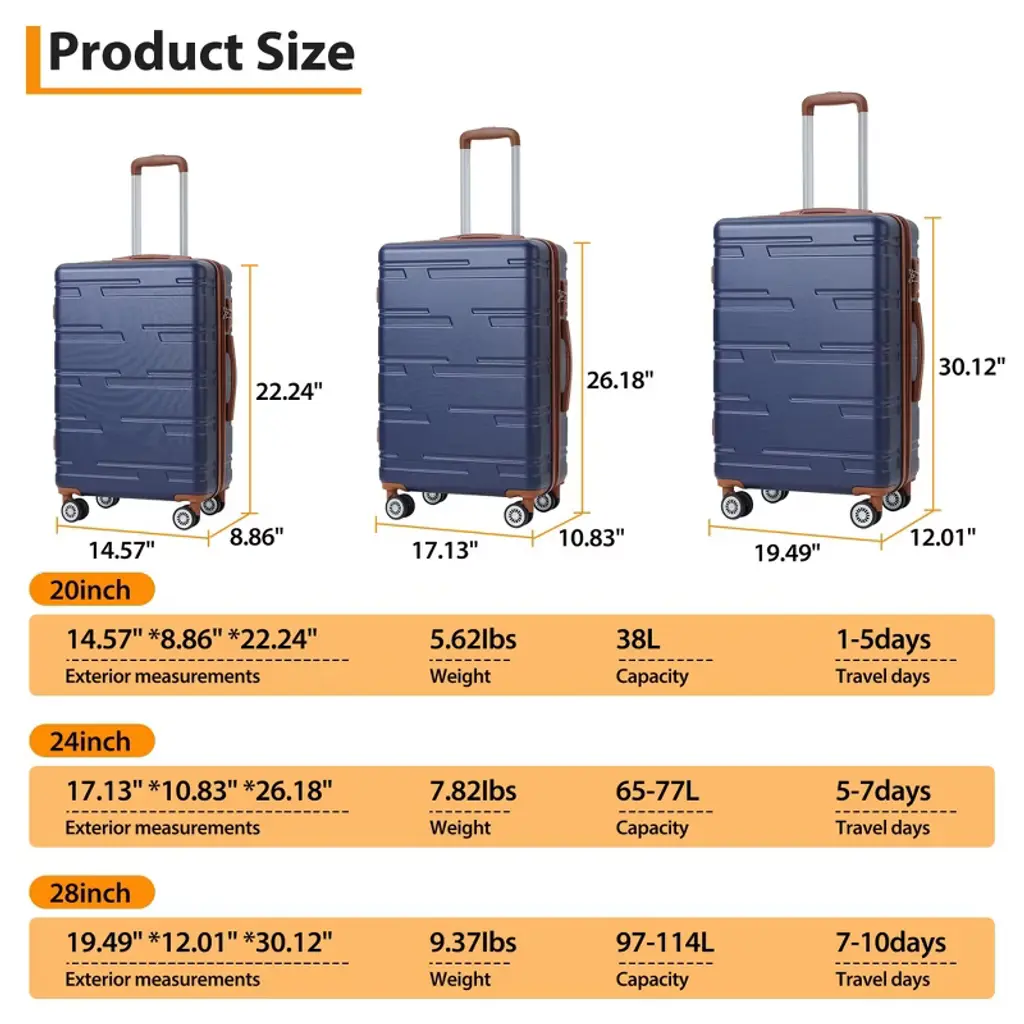 Hardshell Luggage Set, 3-Piece Expandable Suitcase Set with Spinner WheelsProduct Description:Discover the ultimate travel solution with this complete 3-piece hardshell luggage set. Designed for the modern traveler, this collection includes 20¡±, 24¡±, and 28¡± suitcases crafted from premium ABS material that combines lightweight durability with scratch-resistant protection. Each piece features smooth 360¡ã spinner wheels for effortless mobility, TSA-approved locks for secure travel, and thoughtfully organized interiors with multiple compartments. The 24¡± and 28¡± suitcases offer expandable capacity for extra packing space, making this set perfectly adaptable for everything from business trips to extended vacations. Experience organized, stress-free travel with this versatile collection that grows with your journey needs.Key Features:? Complete 3-Piece Travel System: This comprehensive set includes a 20¡± carry-on for short trips, a versatile 24¡± checked bag, and a spacious 28¡± suitcase for extended travels¡ªproviding the perfect luggage solution for every type of journey.? Expandable Packing Capacity: The medium and large suitcases feature innovative expandable designs that increase storage capacity by up to 20%, giving you flexible space for souvenirs and extra belongings without needing additional bags.? Advanced Security Features: Each suitcase comes equipped with TSA-approved combination locks that allow airport security to conduct inspections without damage, ensuring your belongings remain protected throughout your travels.? Superior Maneuverability: Four double spinner wheels provide 360¡ã smooth, silent rolling in any direction, offering exceptional stability and easy navigation through crowded airports and uneven surfaces.? Smart Interior Organization: The interior features include compression straps to secure clothing, zippered compartments for valuables, and mesh pockets for small items¡ªkeeping your belongings neatly organized and easily accessible throughout your journey.Specifications:? Set Includes: 20¡± Carry-On + 24¡± Medium + 28¡± Large Suitcase? 20¡± Dimensions: 22.24¡± x 14.57¡± x 8.86¡± (HxLxW)? 24¡± Dimensions: 26.18¡± x 17.13¡± x 10.83¡± (HxLxW)? 28¡± Dimensions: 30.12¡± x 19.49¡± x 12.01¡± (HxLxW)? Material: Durable ABS Hard Shell with Textured Finish? Features: 3-Stage Telescopic Handle, 360¡ã Spinner Wheels, TSA Locks