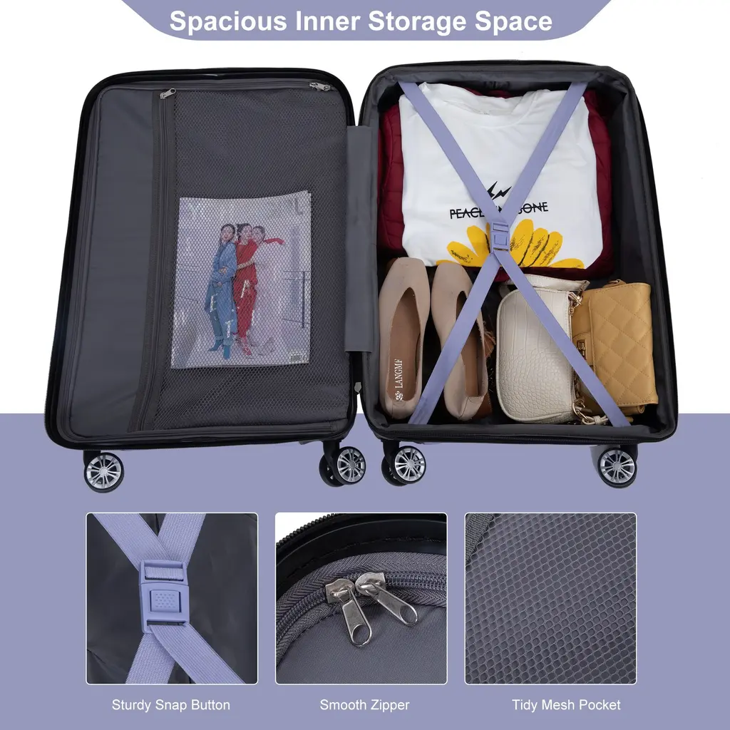Designed for comfort and ease of use, the luggage features an ergonomic 3-step telescoping handle for easy maneuverability in tight spaces, along with smooth 360° double spinner wheels for effortless movement. The interior is spacious and organized, with a handy divider, zippered pocket for smaller items, and two hooks on the 25" and 29" sizes for hanging your computer bag or accessories. Whether you’re traveling for business or leisure, this luggage set offers both convenience and style.Features:Quick Glance Points: