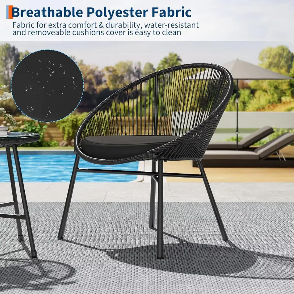 Each Acapulco-style chair features thick, detachable seat cushions with zippered, machine-washable covers for effortless cleaning. The plush padding provides exceptional lumbar support for relaxing mornings or evening chats.Includes 2 ergonomically designed Acapulco armchairs and 1 round tempered glass top accent table, perfect for creating a stylish and comfortable seating area on balconies, patios, porches, or gardens
