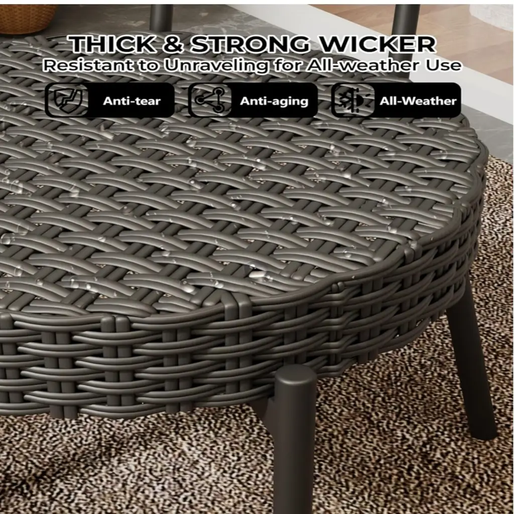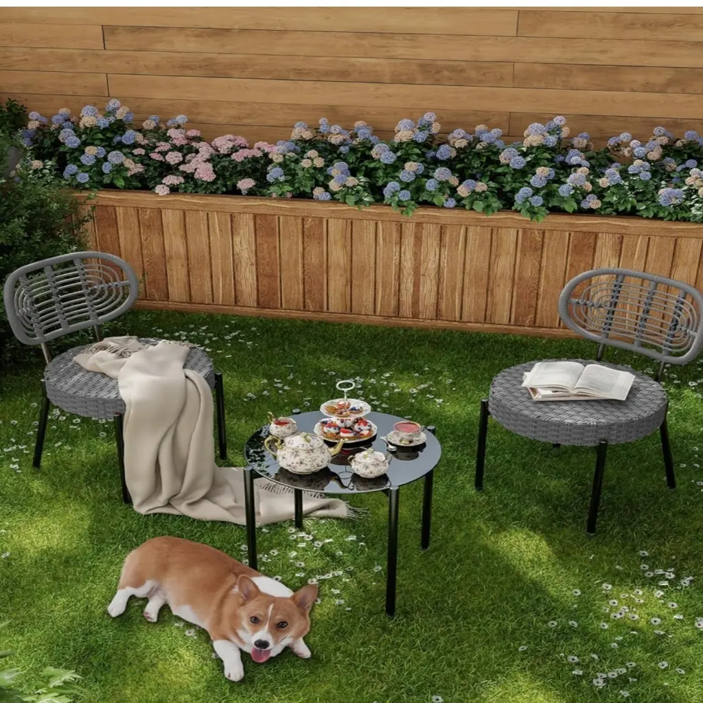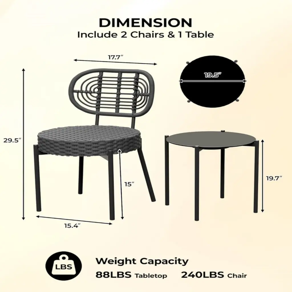 Stylish & Compact 3-Piece Design: This outdoor bistro set includes 2 wicker chairs and 1 matching coffee table—perfect for creating a cozy seating area on your patio, balcony, or garden. Its compact footprint makes it ideal for small spaces without sacrificing comfort or style.Durable PE Rattan & Sturdy Steel Frame:Outdoor bistro 3-piece set crafted with weather-resistant PE rattan and supported by a rust-resistant steel frame, this conversation set is built to withstand outdoor conditions while providing long-lasting durability and elegant charm.Heavy-Duty Steel Coffee Table: Unlike fragile glass tables, our steel coffee table is more durable and stable. It offers a secure surface for drinks, snacks, and outdoor essentials, while withstanding various weather conditions without rusting or wobbling.Suitable for Multiple Scenes: This outdoor rattan 3-piece set is designed with versatility in mind, this bistro set seamlessly fits into a variety of outdoor settings. Whether you're enjoying morning coffee on the balcony, unwinding in the garden, hosting guests on the patio, or creating a cozy corner on the front porch, this stylish and functional set enhances any environment.Quick Assembly & Multipurpose Use: Easy to assemble with clear instructions and all hardware included. This patio furniture bistro set set is perfect for casual conversations, coffee breaks, or simply enjoying the fresh air in any outdoor setting.
