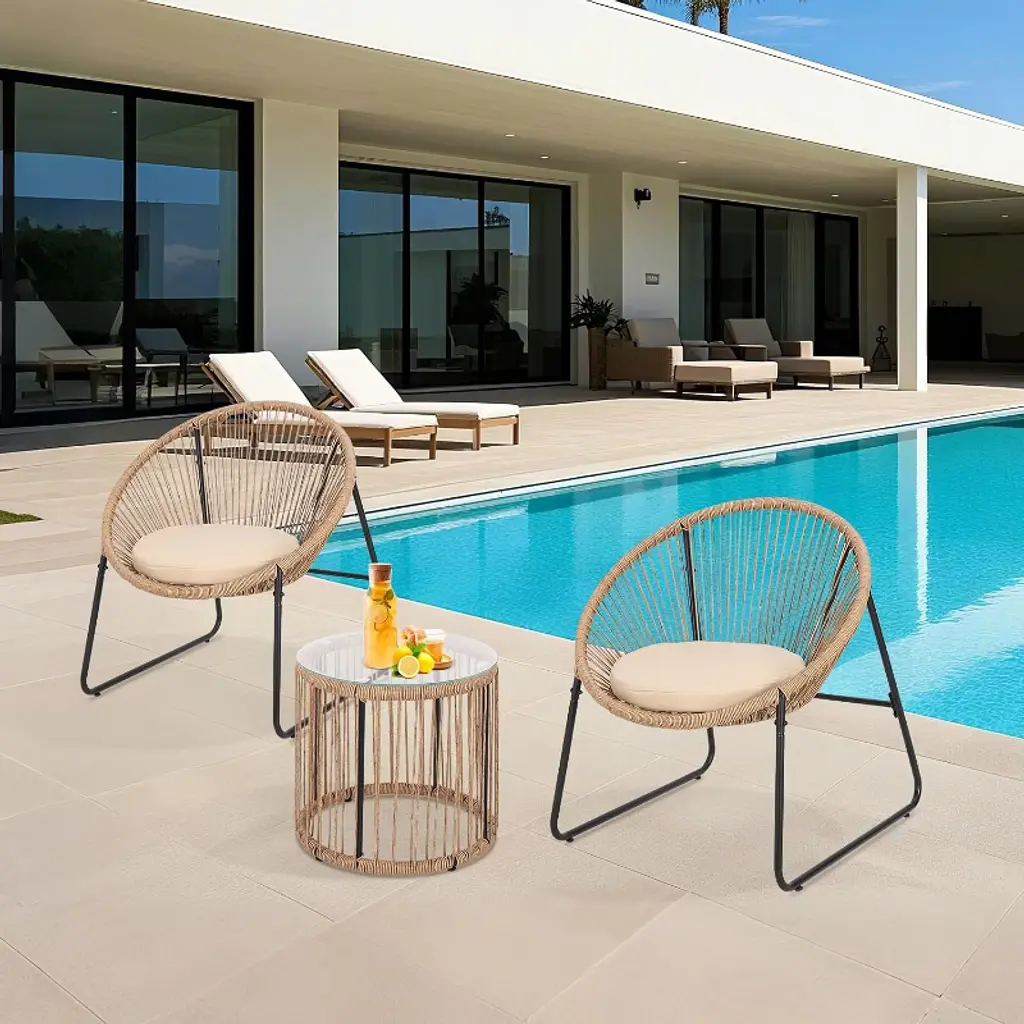 3 Piece Outdoor Seating Acapulco Chair Glass Top Side Table And 2 Chairs With Cushions Pe Rattan All-weather Patio Conversation Bistro Set