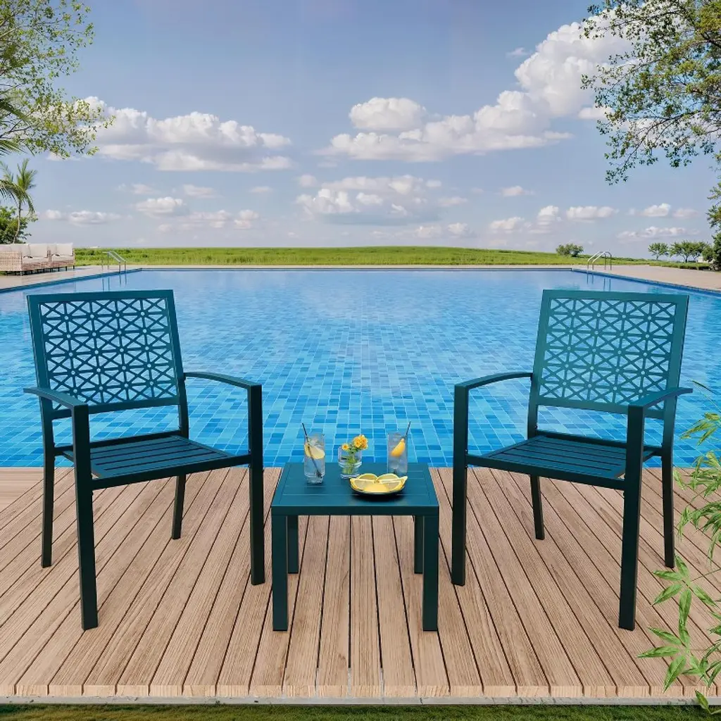 Elevate your outdoor space with this stylish 3 Piece Patio Bistro Set, designed to bring comfort and modern elegance to your balcony, garden, or front patio. Crafted from durable steel, this set includes two sturdy chairs and a compact tea table, fit for enjoying morning coffee, casual meals, or relaxing afternoons outdoors. The sleek finish not only adds a contemporary touch but also ensures resistance to rust and weather, making it ideal for year-round use. The chairs feature ergonomic design with comfortable seating and a supportive backrest, providing a cozy spot to unwind. The small table offers ample space for your tea, snacks, or decorative items without taking up too much room. This patio furniture set is lightweight yet robust, making it easy to move and arrange according to your needs. Its compact size is perfect for small spaces, balconies, or cozy corners, transforming any outdoor area into a charming retreat. Key Features: - Durable steel construction ensures long-lasting use and weather resistance - Compact 3-piece set includes two chairs and a tea table, ideal for small outdoor spaces - Modern design complements various outdoor decors with a sleek finish - Comfortable seating with ergonomic backrests for relaxing outdoor moments - Lightweight and easy to move, fit for balconies, gardens, or front patios Enhance your outdoor living experience with this elegant and practical patio bistro set, combining style, comfort, and durability in one perfect package.