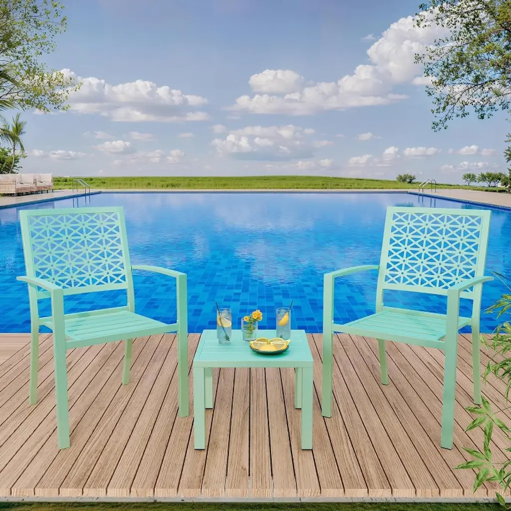 3 Piece Patio Bistro Set, Modern Carved Back Design Furniture Set, Metal Porch Chairs With Tea Table For Balcony, Garden, Or Front Patio, Green
