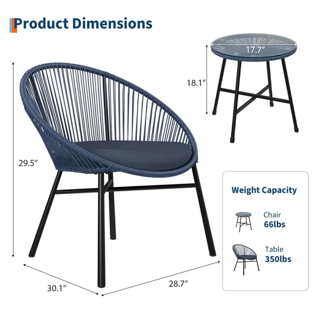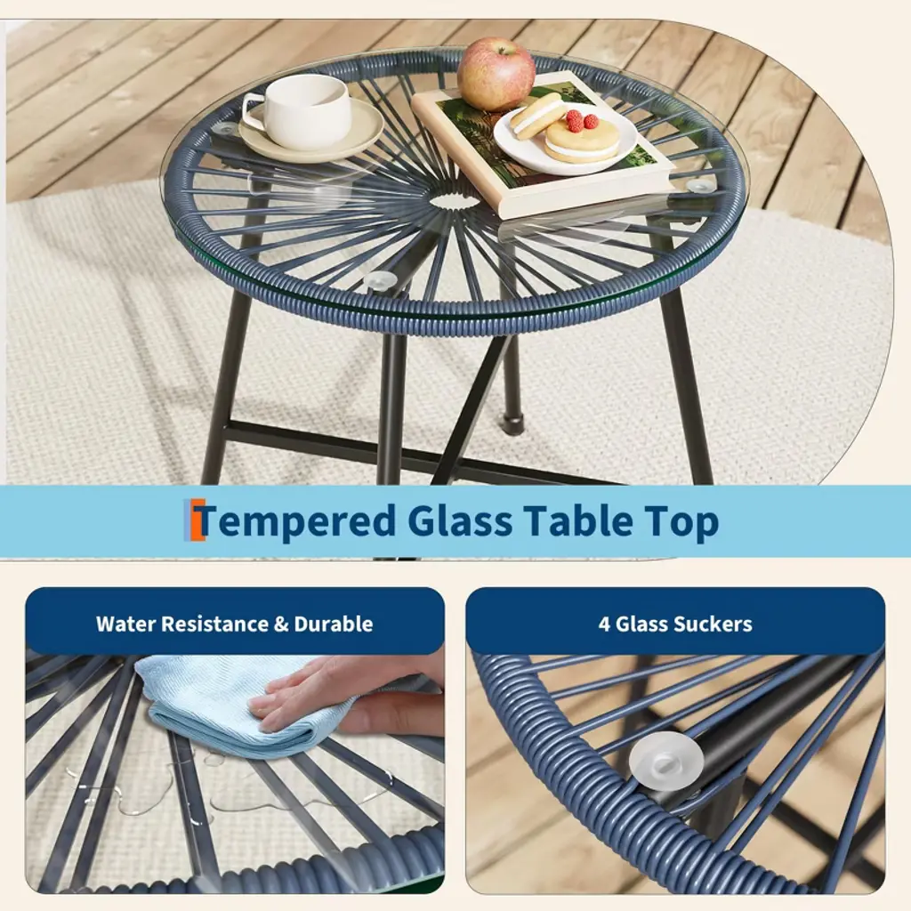 3 Piece Patio Bistro Set, Outdoor Acapulco All-weather Chair Set With Glass Top Table And 2 Cushions