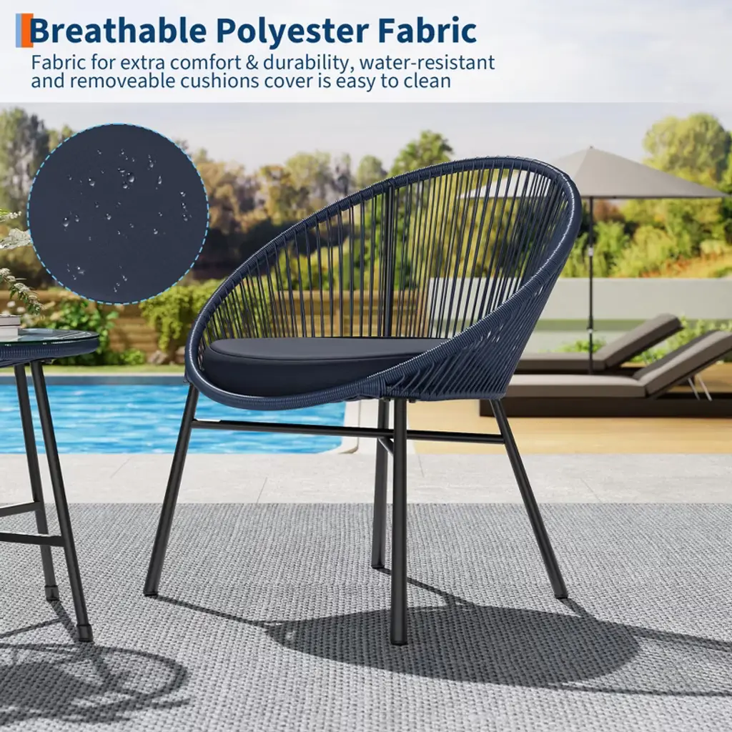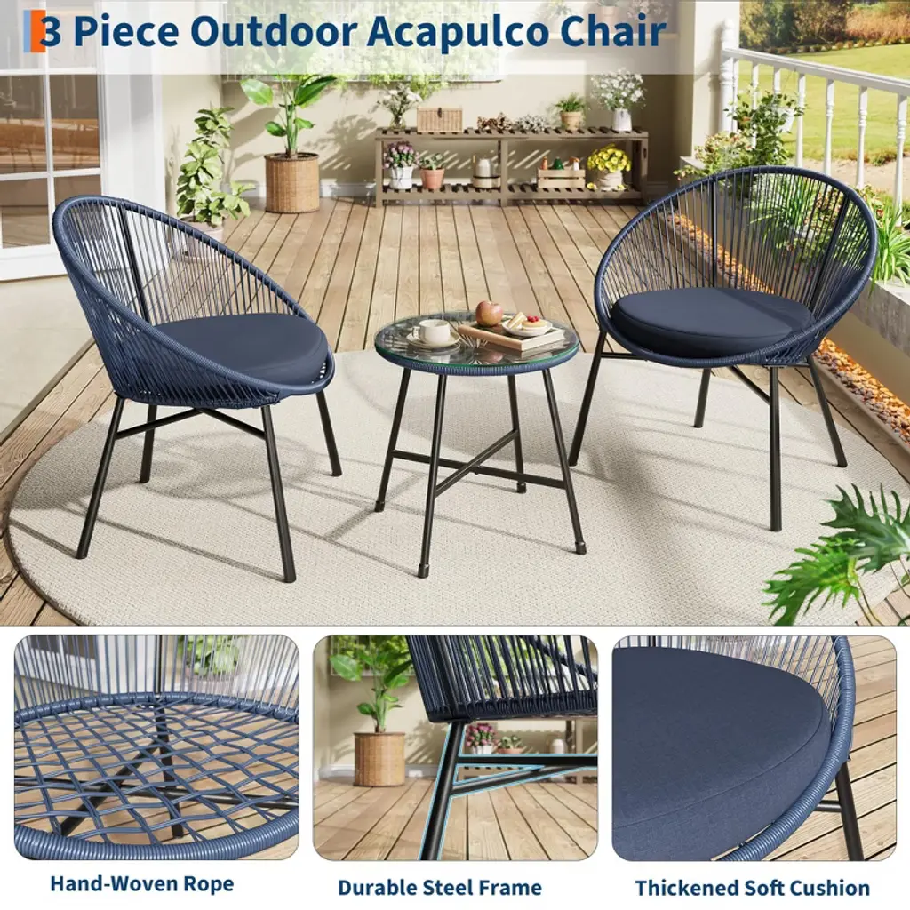 3 Piece Patio Bistro Set, Outdoor Acapulco All-Weather Chair Set with Glass Top Table and 2 Cushions, Modern Patio Chairs for Deck, Backyard, Balcony