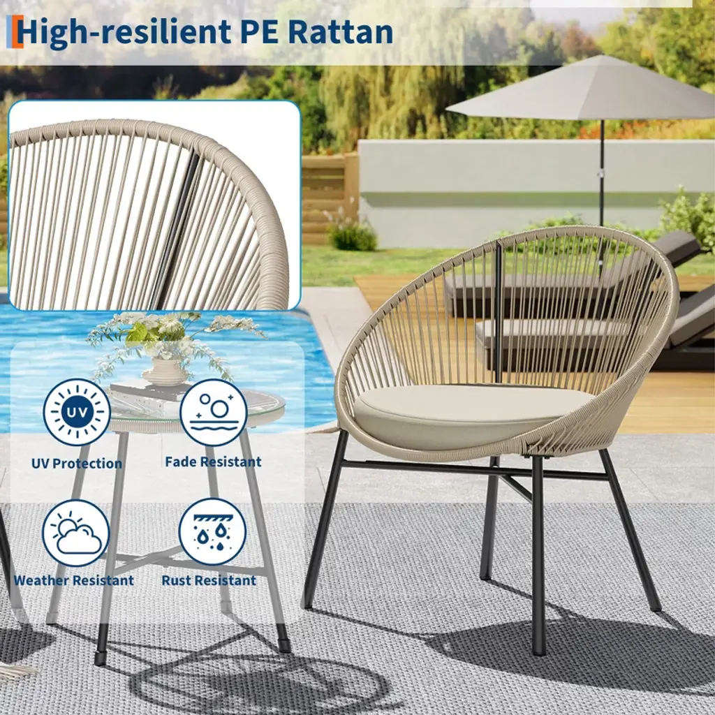 3 Piece Patio Bistro Set, Outdoor Acapulco All-weather Chair Set With Glass Top Table And 2 Cushions