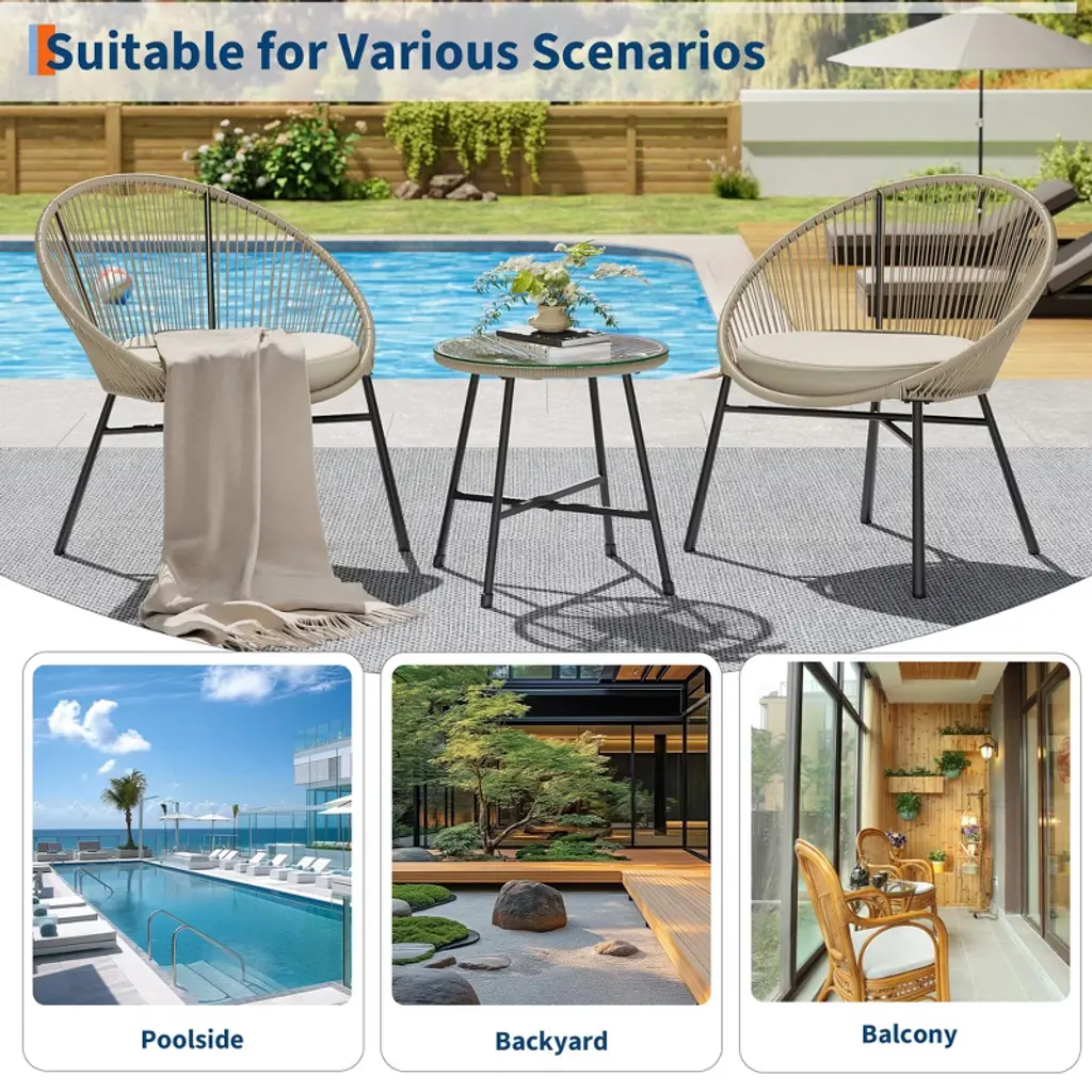 3 Piece Patio Bistro Set, Outdoor Acapulco All-Weather Chair Set with Glass Top Table and 2 Cushions, Modern Patio Chairs for Deck, Backyard, Balcony