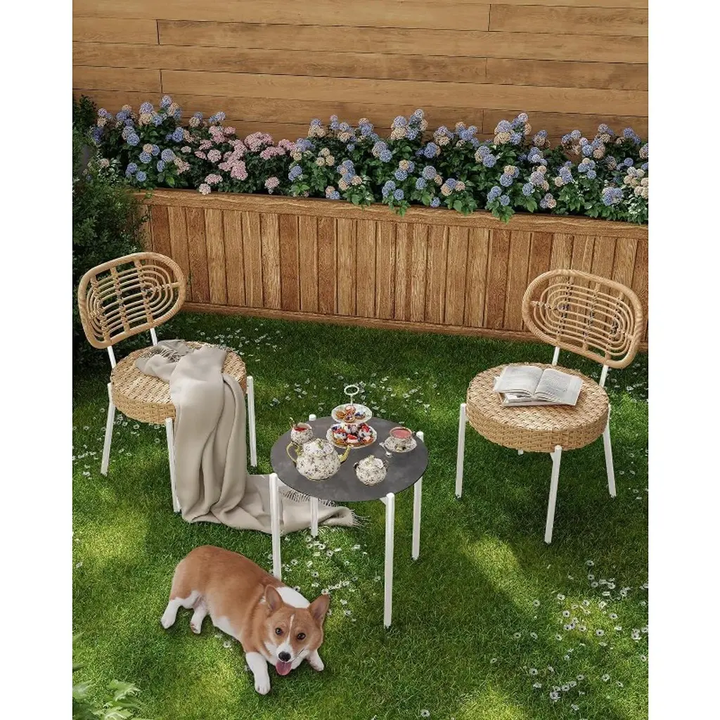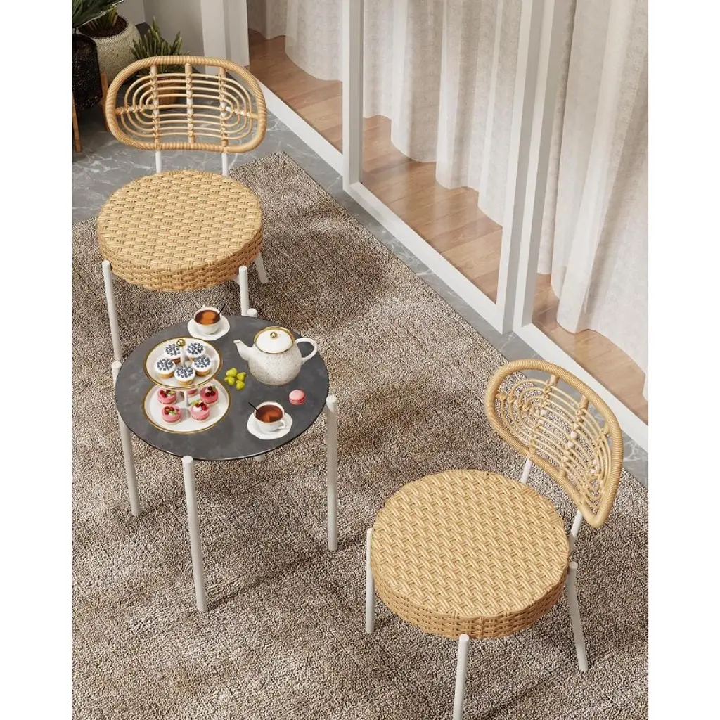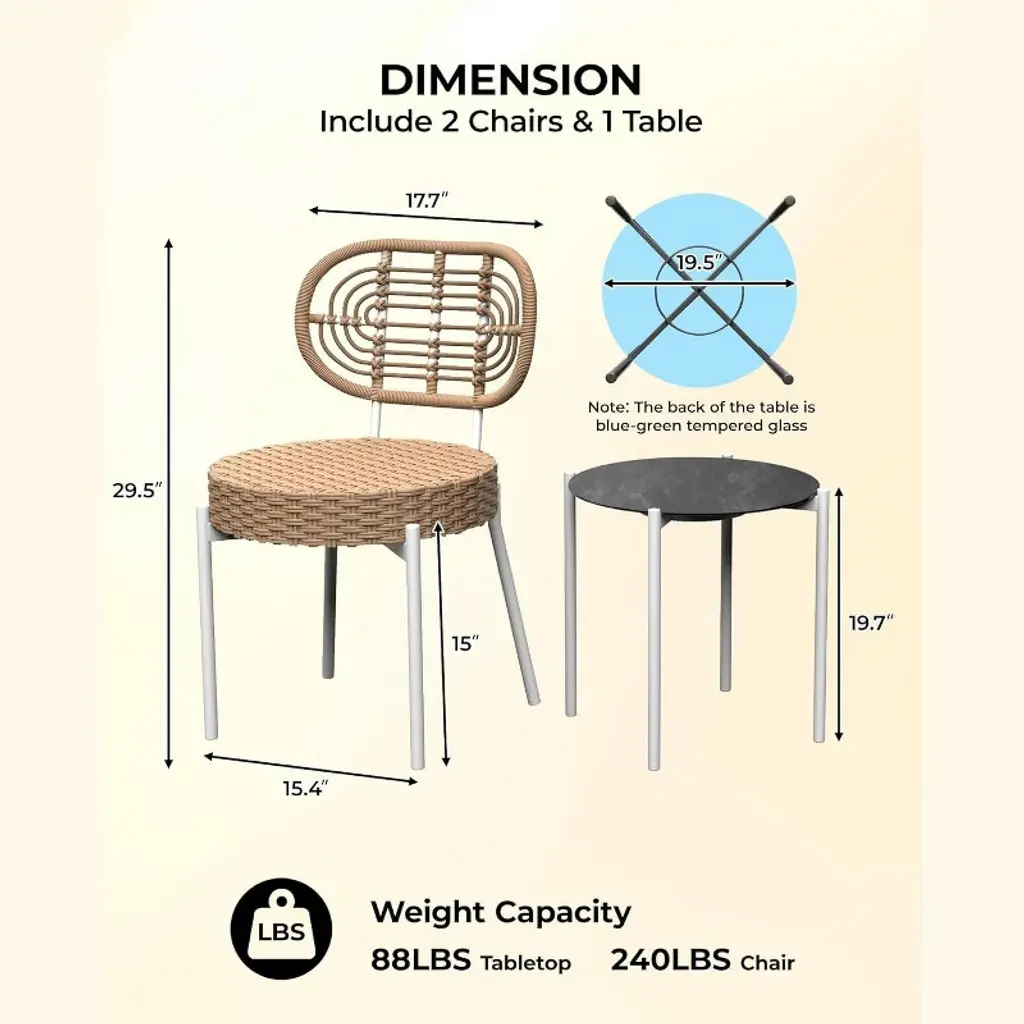 【STYLISH DESIGN】: The contemporary wicker design adds a touch of elegance to any outdoor space, making it perfect for patios, balconies, gardens, or porches. Enjoy your morning coffee or evening cocktails in style. 【DURABLE CONSTRUCTION】: Made from all-weather rattan and a sturdy steel frame, this patio set is designed to withstand the elements while providing long-lasting comfort and support, ensuring it remains a staple in your outdoor furniture collection. 【COMFORTABLE SEATING】: The set includes two cozy chairs with soft cushions, providing a comfortable seating experience for you and your guests. The breathable fabric ensures you stay cool and relaxed, even on warm days. 【SPACE-SAVING】: This bistro set is designed to fit in smaller outdoor areas without compromising style or comfort. Its compact size makes it ideal for deck or cozy patio spaces, allowing you to create a charming outdoor nook. 【EASY ASSEMBLY】: With clear instructions and all necessary tools included, setting up your new patio bistro set is a breeze. Enjoy your outdoor oasis in no time, whether you’re an experienced assembler.