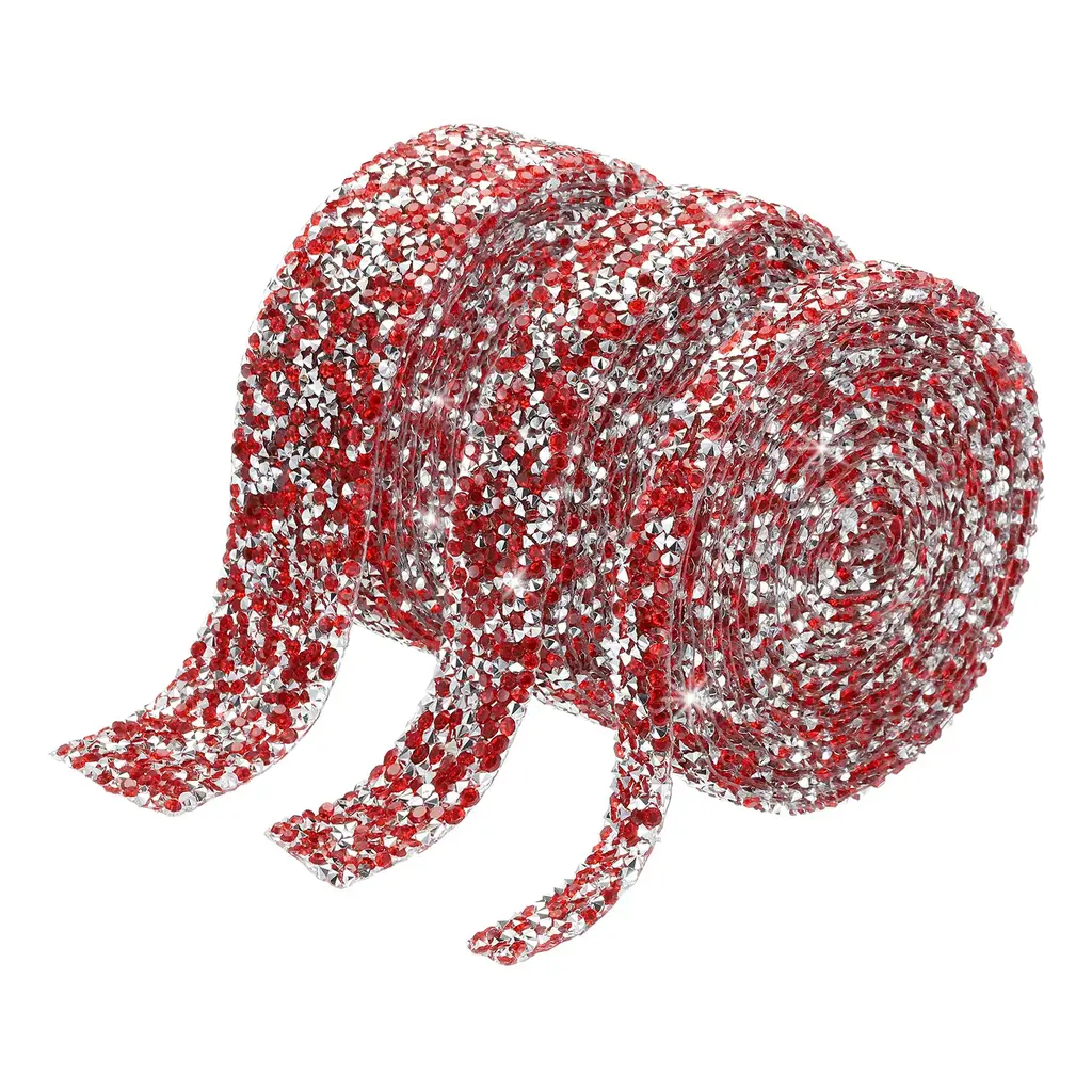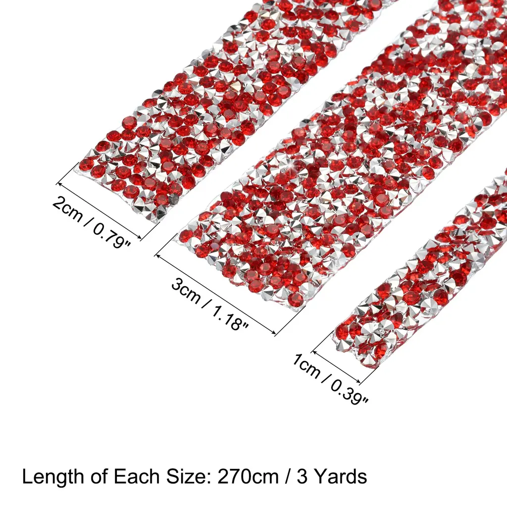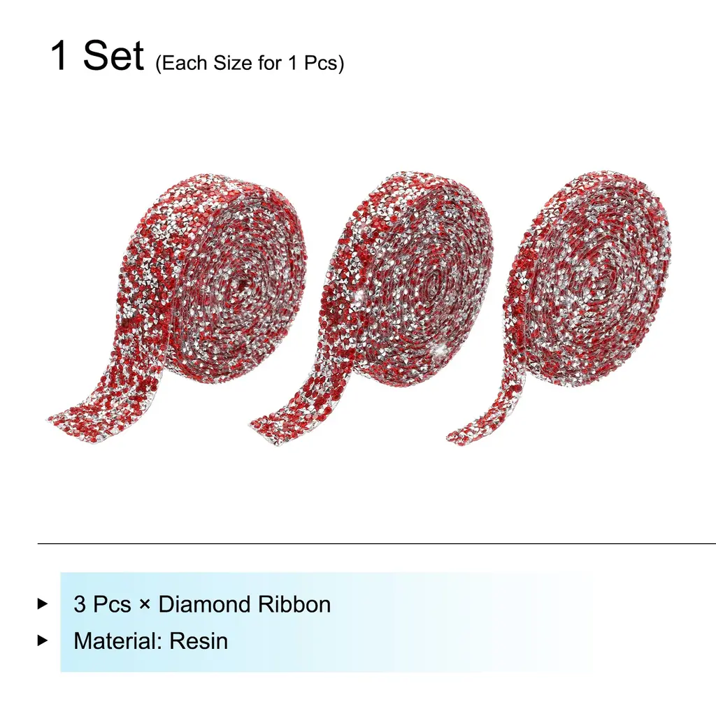 What is this?Crystal belts can mainly be used to decorate different occasions and items in your life. You can use it for decoration of furniture, cakes or handicrafts, and you can also use it for decoration on different parties, such as weddings, birthday parties, and other holidays, etc.What will I get?Color: Silver Base RedMaterial: ResinEach Size(L*W):270cm x 1cm/3 Yards x 0.39 inches;270cm x 2cm/3 Yards x 0.79 inches;270cm x 3cm/3 Yards x 1.18 inches;In the package of: 3 Roll x Diamond RibbonAre there any advantages of the product?1. This crystal ribbon is made of resin, using good craftsmanship to make all the surfaces shine, smooth and flat, and they are bling no matter under natural light or light.2. The resin diamond ribbon has a double-sided tape, you can cut the size you want according to your needs, directly tear off the tape on the back during use, and stick it directly on the surface of the item.3. The decoration sticker are not easy to fall off, and the adhesive performance is stable. You can use it to easily stick to the surface of the itemsHow to use it?You just need to cut the diamond gems sticker to the length you need and use it to diy your items. Wipe the surface of the item before use, then tear off the adhesive sticker and stick it onWhat should I notice?Within 48 hours of use, do not let the craft come into contact with liquids