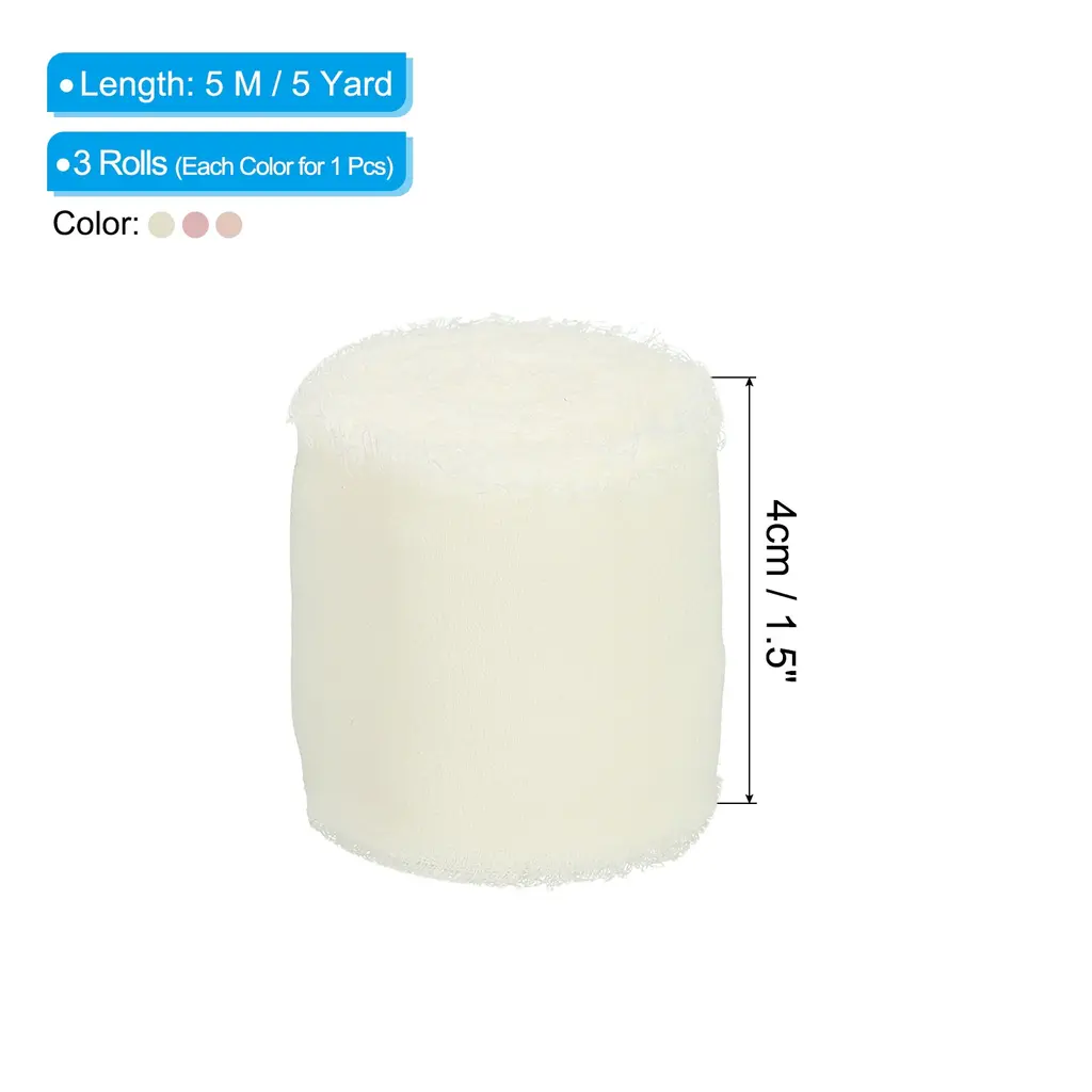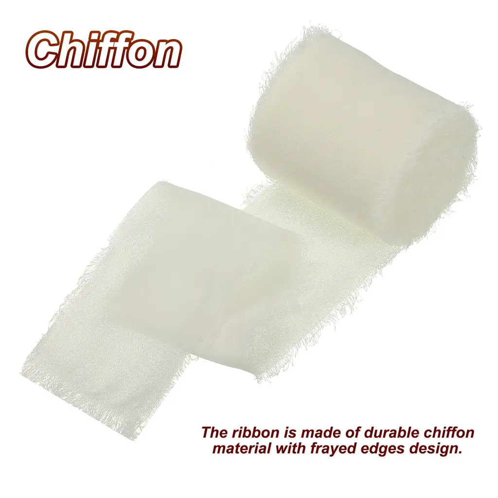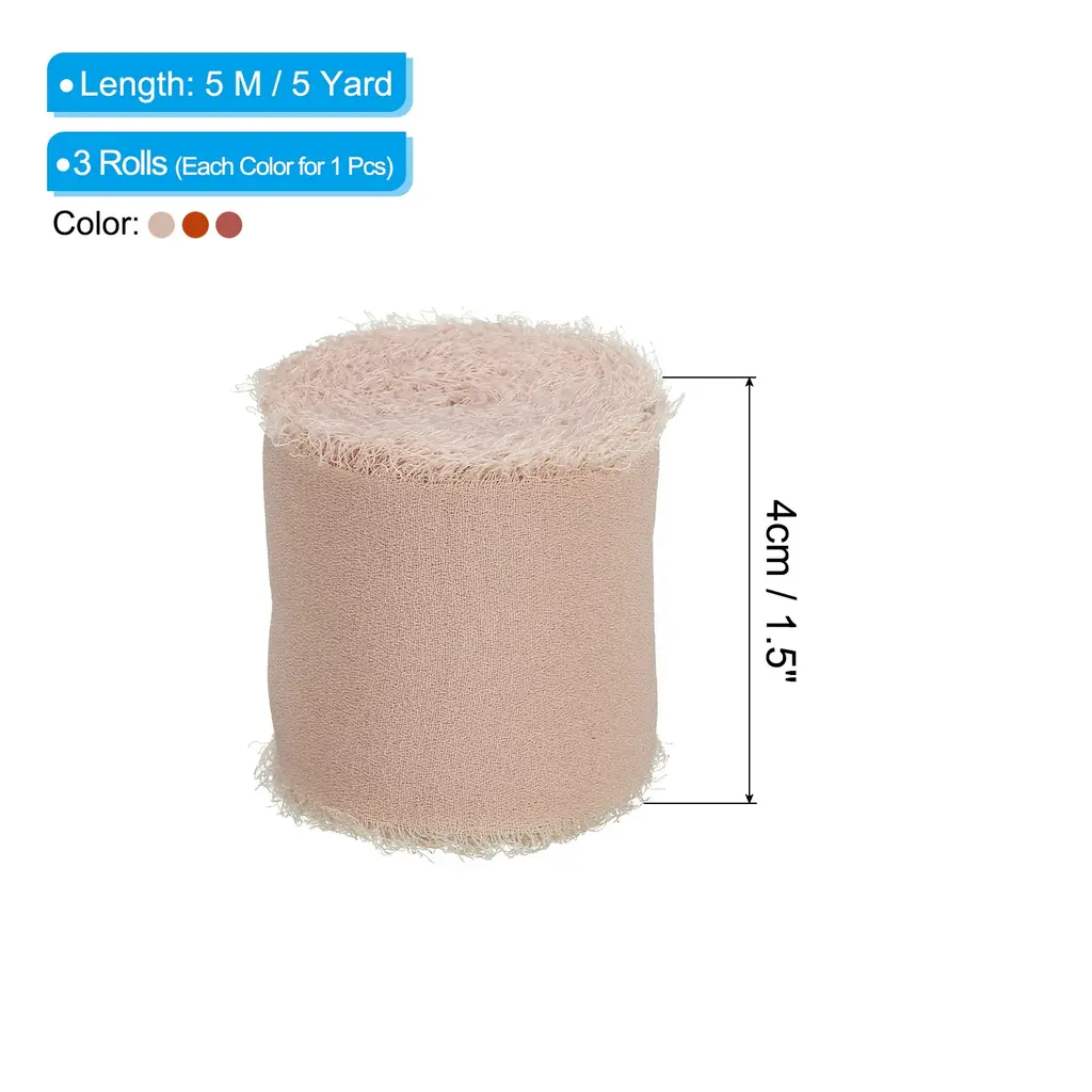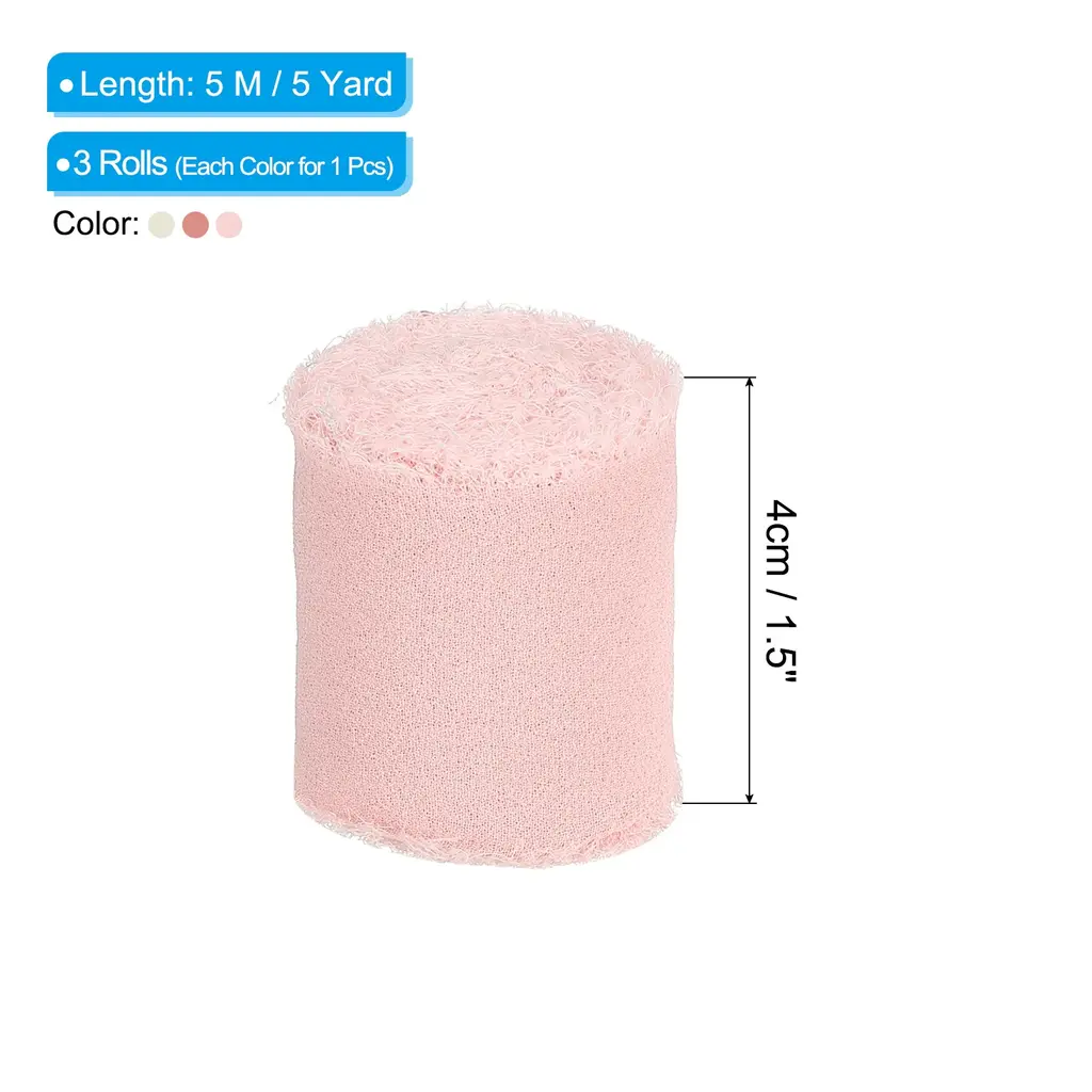 Chiffon ribbon is a versatile and stylish decorative accessory that is widely used to add an elegant touch to various items such as gift wrapping, bridal bouquets, wedding invitation decorations, and DIY craft projects.SpecificationColor: Grey Pink/Beige/EcruMaterial: ChiffonLength: 5 M / 5 YardWidth: 4cm / 1.5 inchPacking List: 3 Rolls x Fringe Silk RibbonAdvantageThe ribbon is made of durable chiffon material with frayed edges design. The silk ribbon has a smooth, soft and delicate texture, as well as vibrant color, making it the perfect elegant finishing touch for your decoration projects.InstructionEasy to use, you can wrap the ribbon around gifts and tie it into a bow, or wrap it around the stems of a bouquet.NOTE: Due to the difference in natural light and display resolution, the item color displayed in photos may be slightly different from the real object.