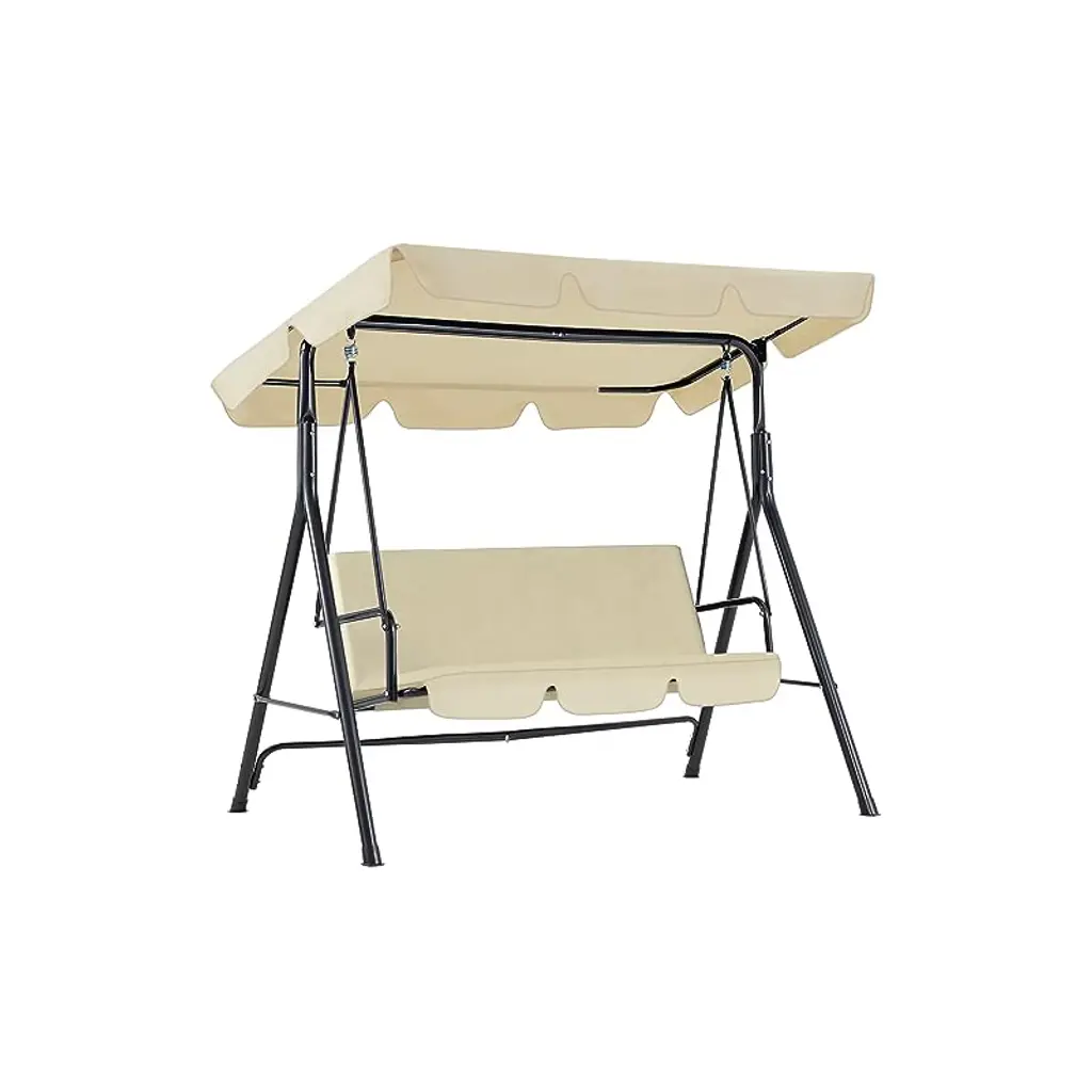 Outdoor Patio Swing Chair: This cushioned porch swing seats three adults, perfect for sunny summer days to sit back, rock, and enjoy the breeze. Ideal for patios, poolside, backyard, or balcony.Comfortable Cushioned Seats: Features a high-rise cushioned back, two armrests, and a wide cushioned seat for a comfortable swinging experience. Relax, lay down, or invite friends.Steel Patio Swing: Built from strong, load-bearing steel with an extra stable "A" frame design. Powder-coated for weather and water protection, with anti-slip foot pads to protect surfaces.Tilting Sun Shade Canopy: Adjustable canopy blocks UV rays and light rain, keeps you cool, and reduces glare from any angle.Covered Outdoor Patio Swing Info: Overall Dimensions: 67.75" W x 43.25" D x 60.25" H. Weight Capacity: 440 lbs. Assembly required.