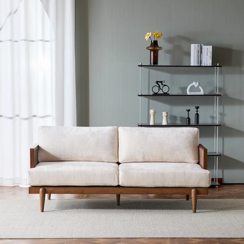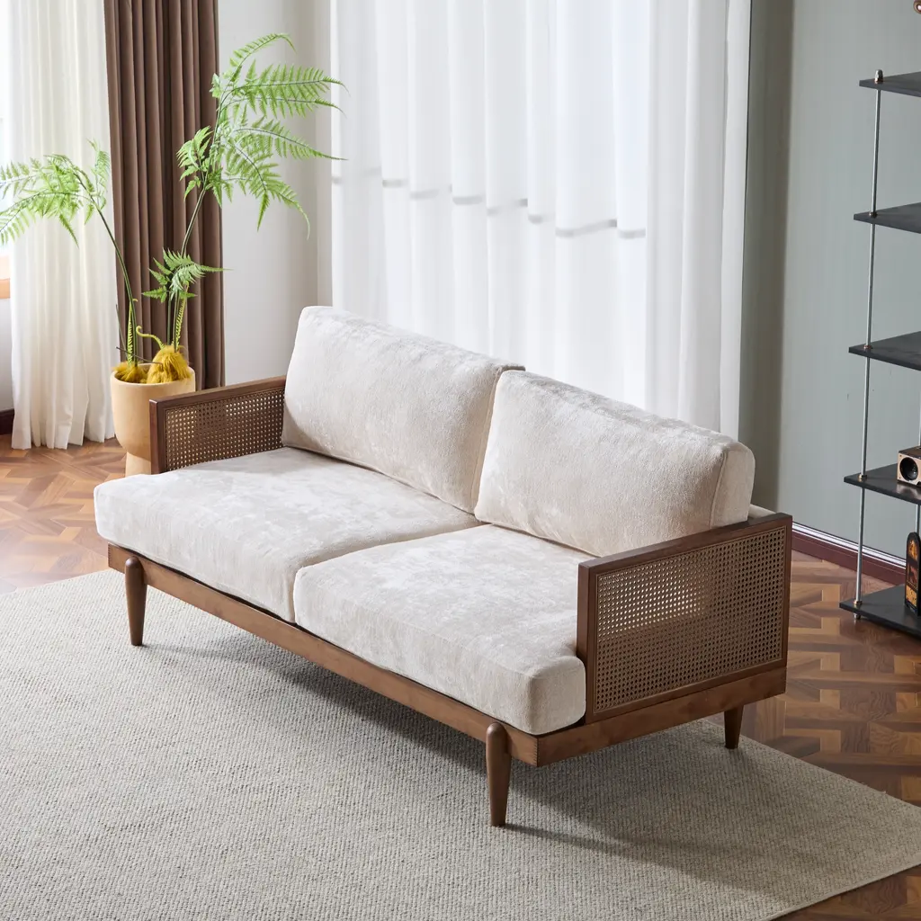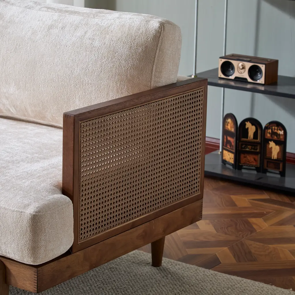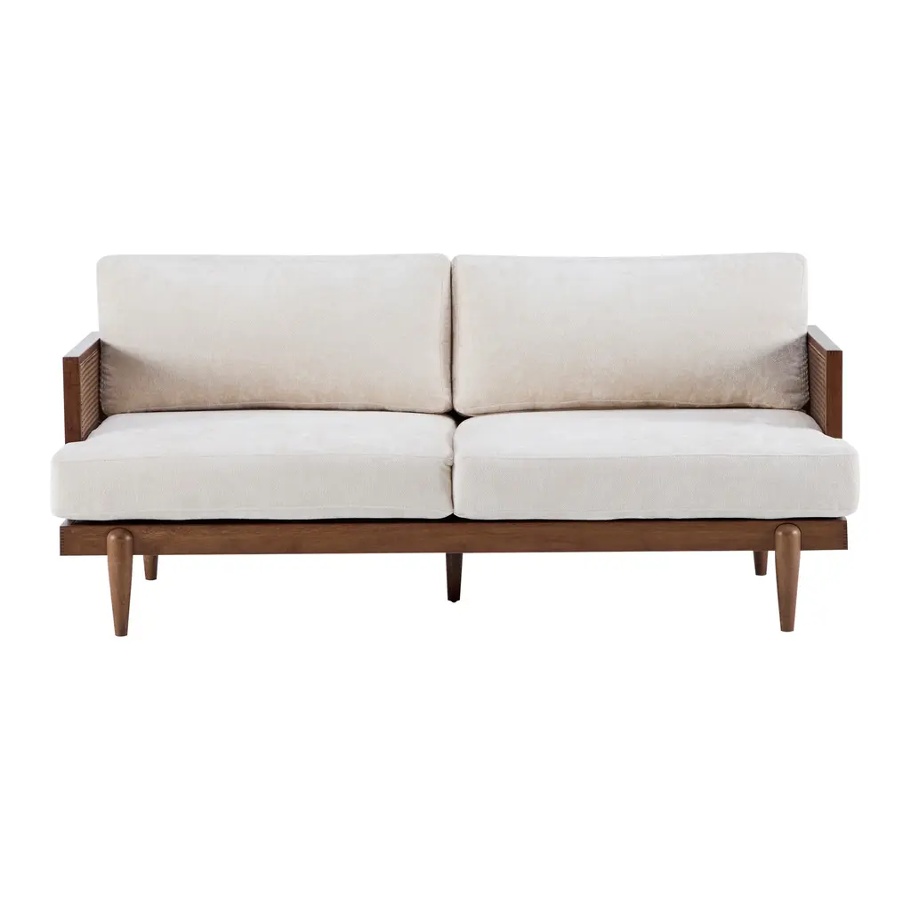 Make a bold statement with our sofa's unique rattan weave and classic lines. It's not just furniture, it's a conversation starter that adds character to your living space. Whether you're hosting a small party or just relaxing, this sofa adapts to every mood and makes every moment memorable.. The sofa combines high-quality materials with a design that's both inviting and durable. The frame is complemented by solid wood and additional middle leg support, featuring elegant rattan weave arm panels and sturdy tapered legs. Combining comfort and aesthetics while ensuring stability and long-lasting use.. The cushions are filled with high-rebound sponge, which not only helps prevent sagging over time. It also makes the cushion soft and comfortable. Plus the backrest is well supported to give you the perfect sitting experience.. Provides a luxurious seating experience without compromising on style. Perfect for families who appreciate a blend of vintage charm and modern comfort. A perfect addition to any home that values both form and function.. Material: Rubber Wood+Rattan +Fabric Color:Walnut+Beige